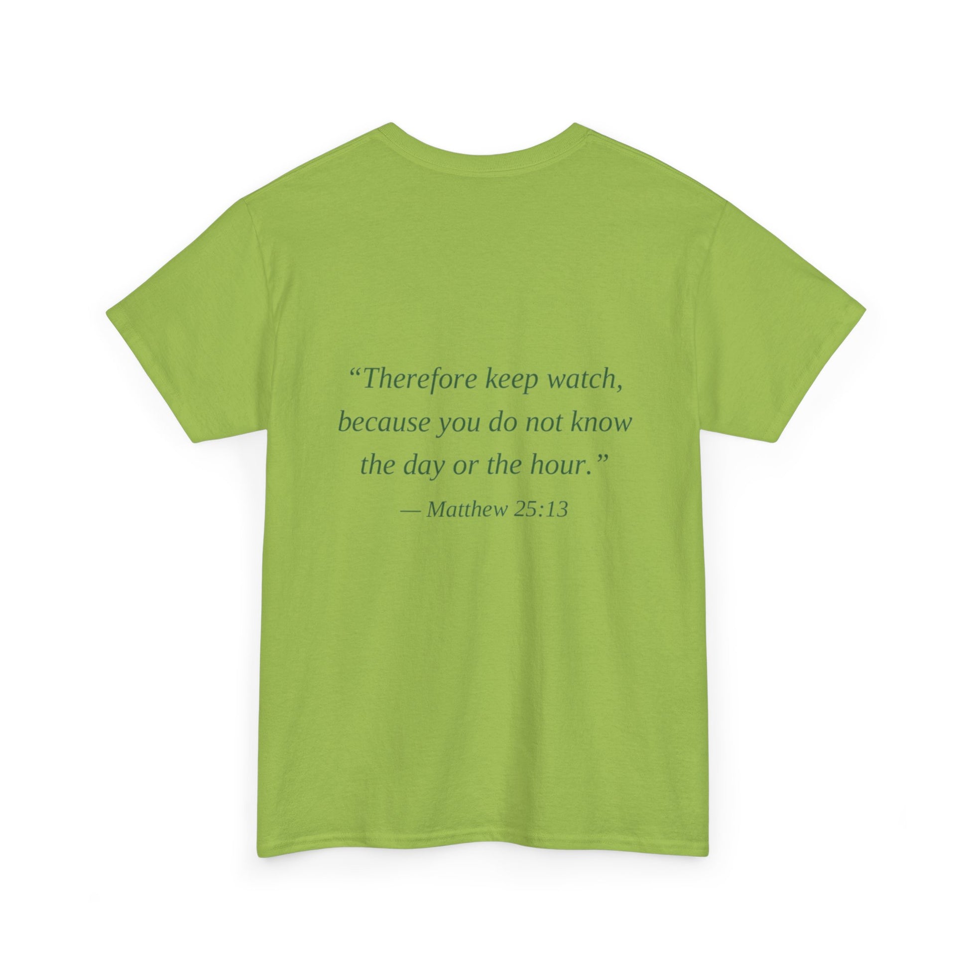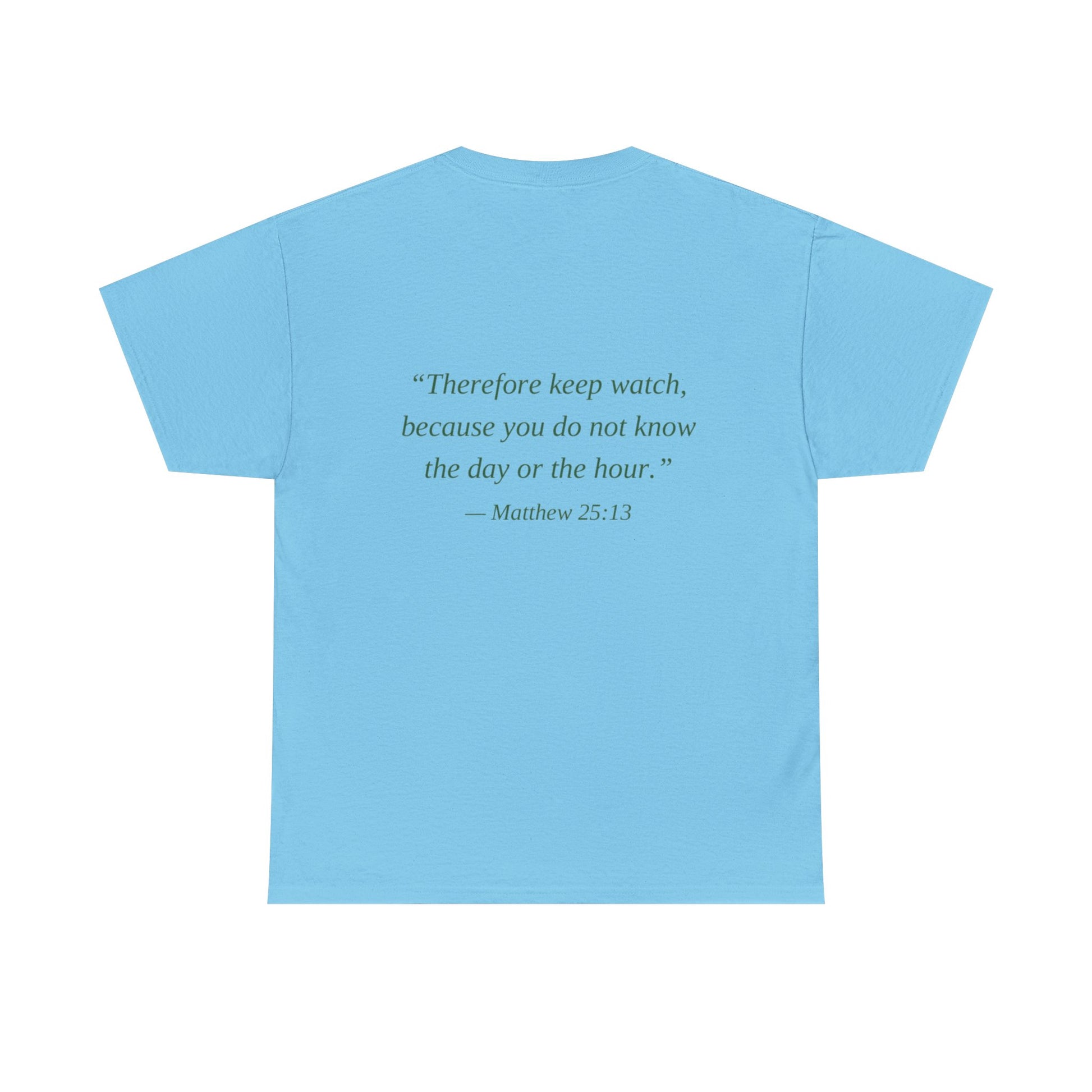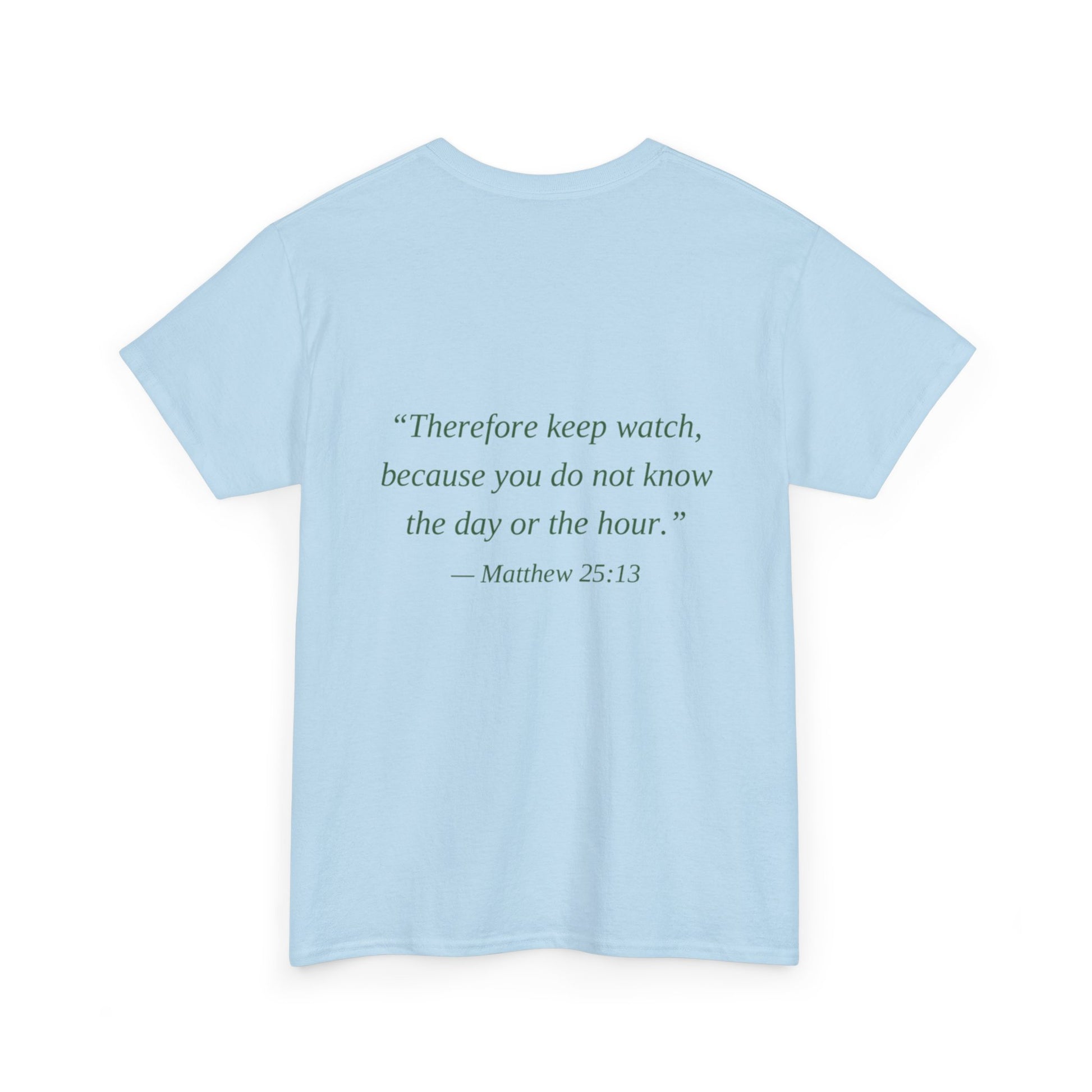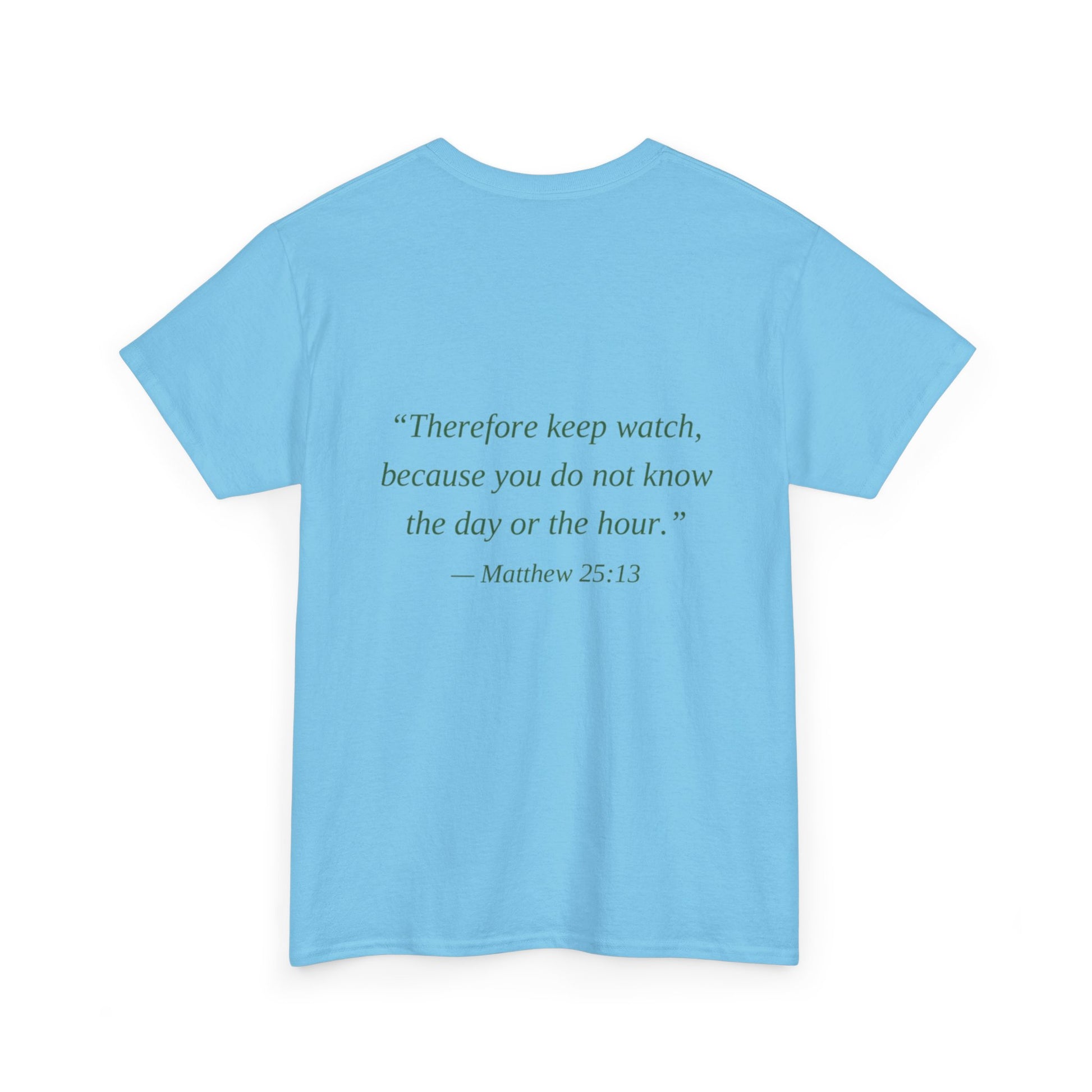 This encouraging Tee reminds us to 'Be Ready' for the coming of our Lord, Jesus Christ. For we know, not the time, nor the hour. It gives a sense of faith and hope, perfect for believers looking to express their spirituality and commitment. Ideal for religious gatherings, holidays, and everyday wear.
