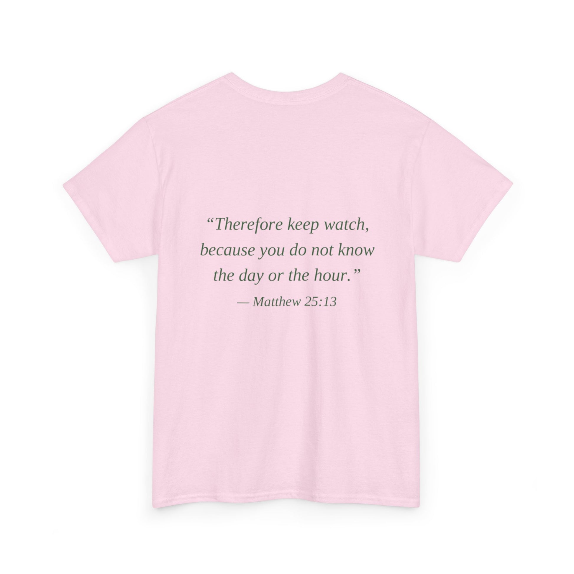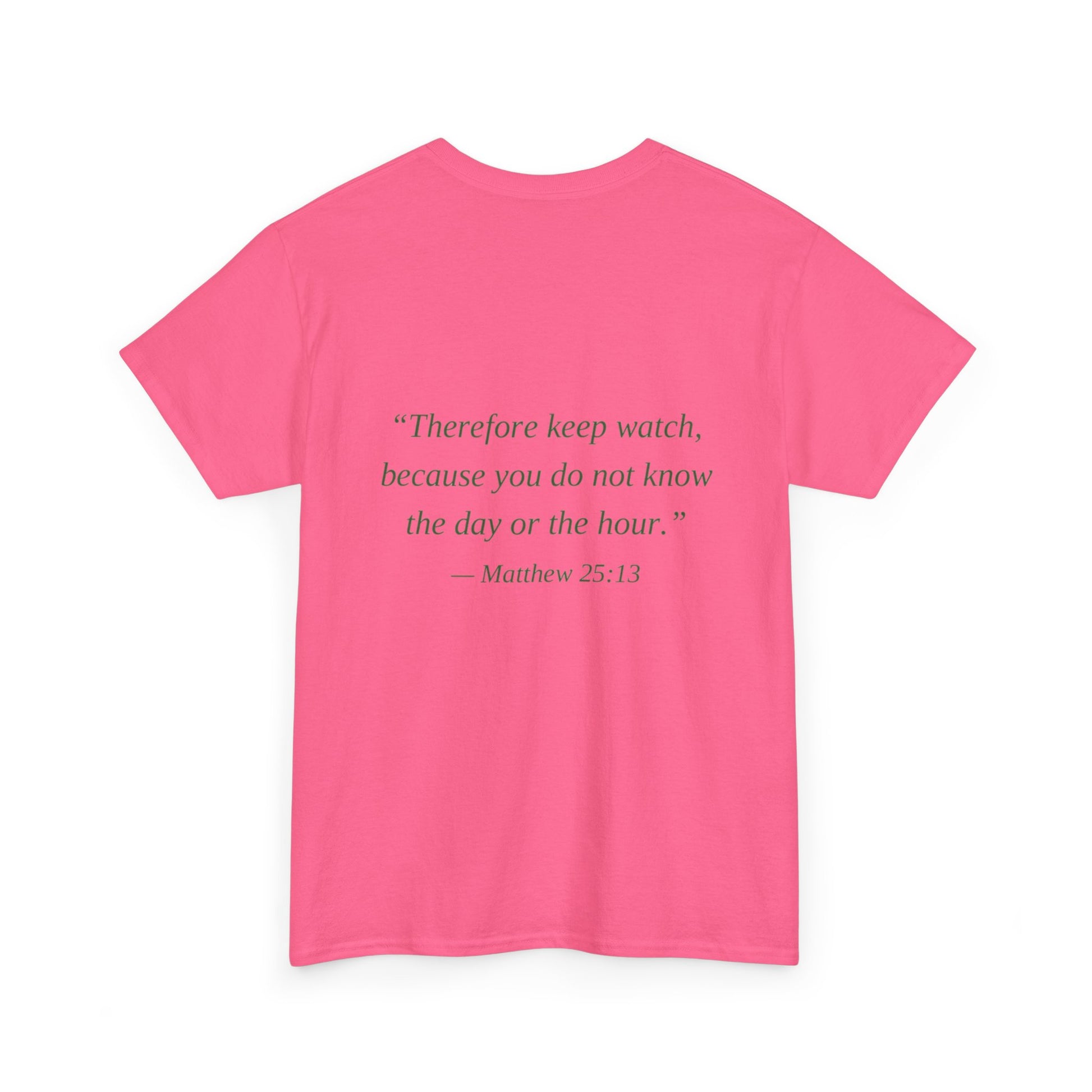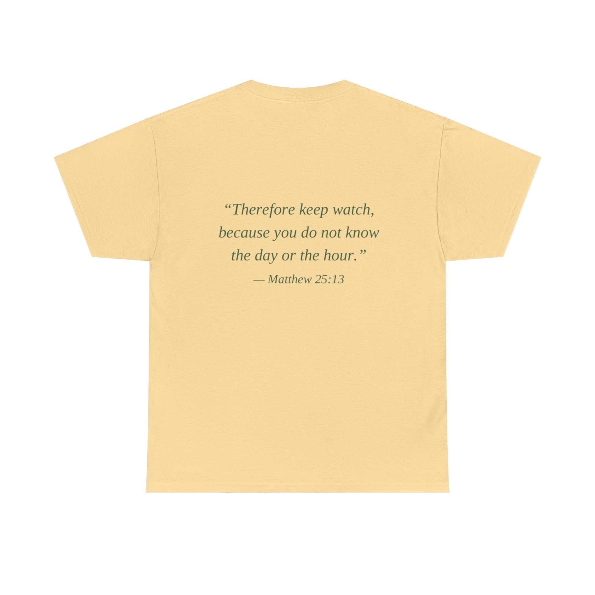 This encouraging Tee reminds us to 'Be Ready' for the coming of our Lord, Jesus Christ. For we know, not the time, nor the hour. It gives a sense of faith and hope, perfect for believers looking to express their spirituality and commitment. Ideal for religious gatherings, holidays, and everyday wear.