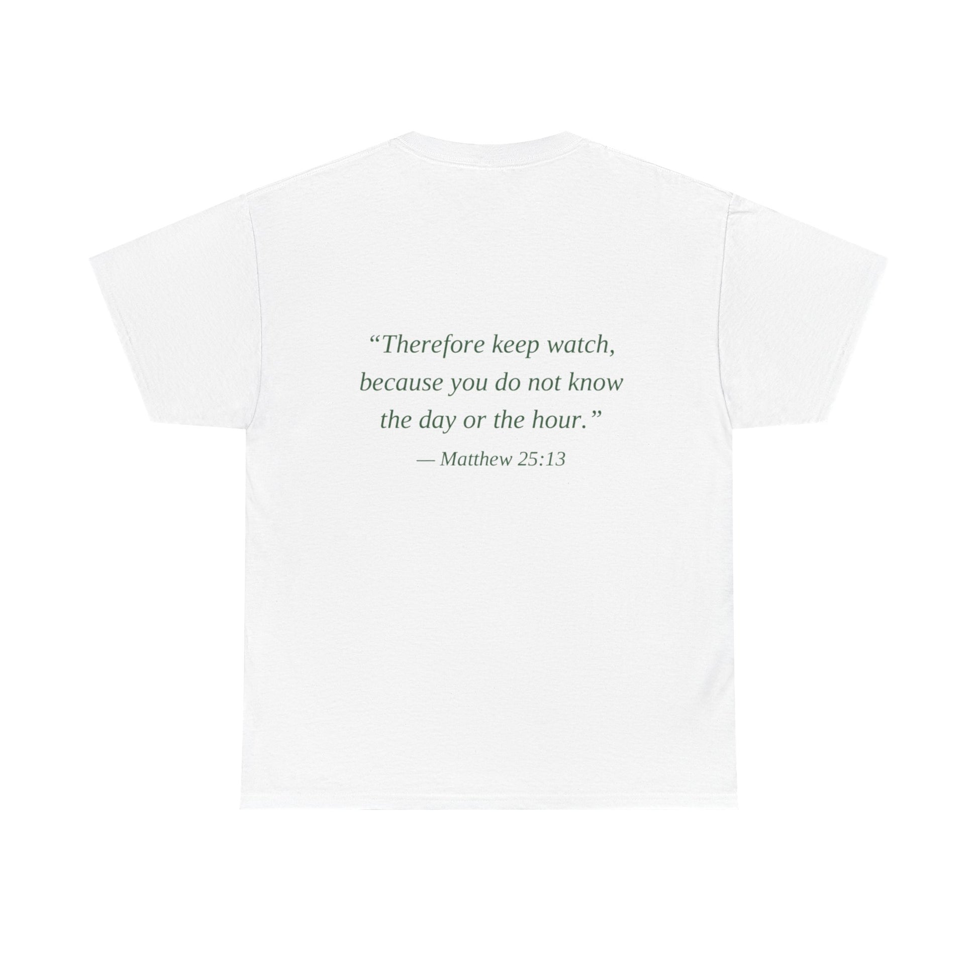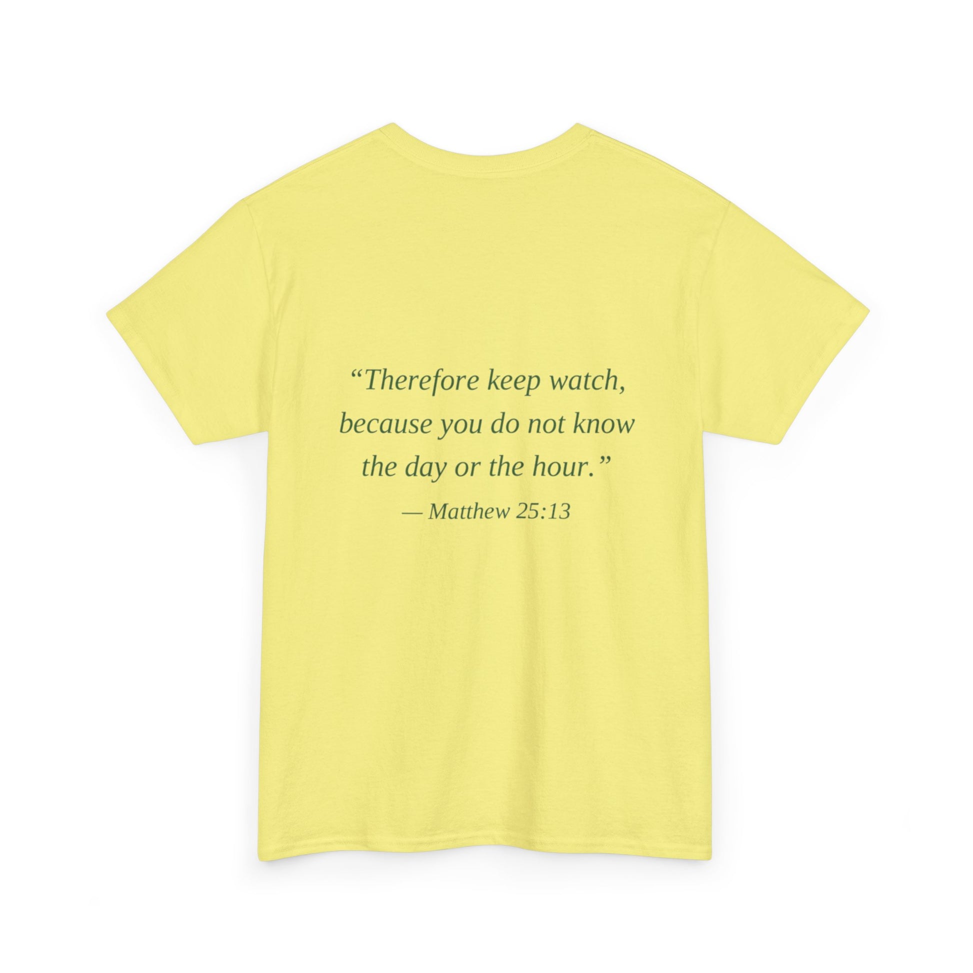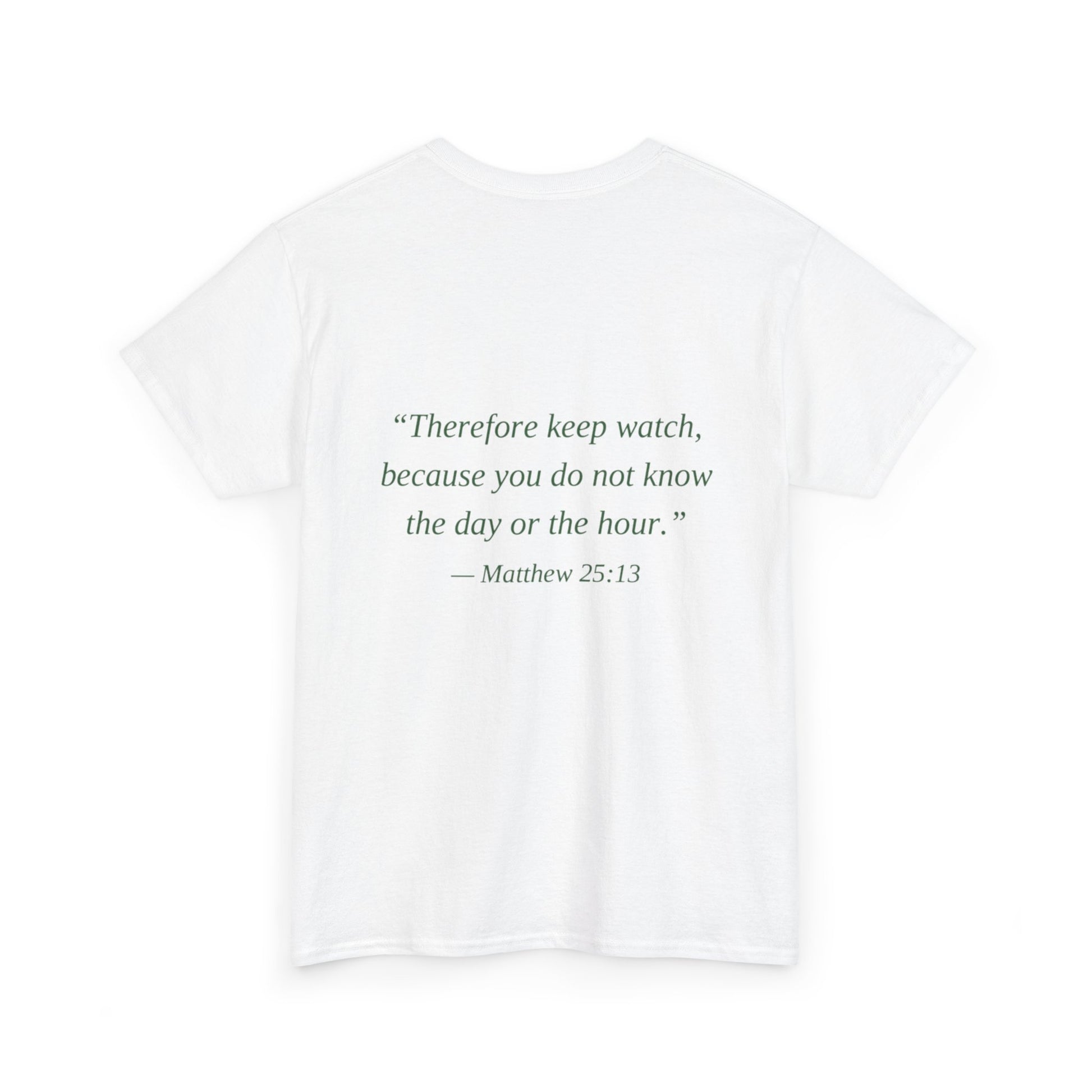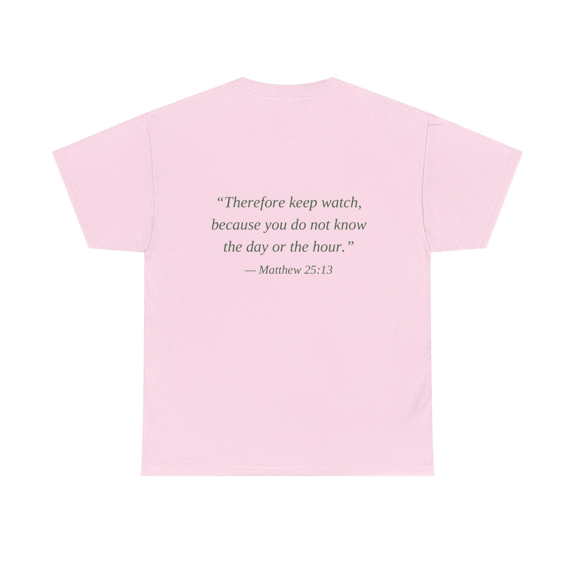 This encouraging Tee reminds us to 'Be Ready' for the coming of our Lord, Jesus Christ. For we know, not the time, nor the hour. It gives a sense of faith and hope, perfect for believers looking to express their spirituality and commitment. Ideal for religious gatherings, holidays, and everyday wear.