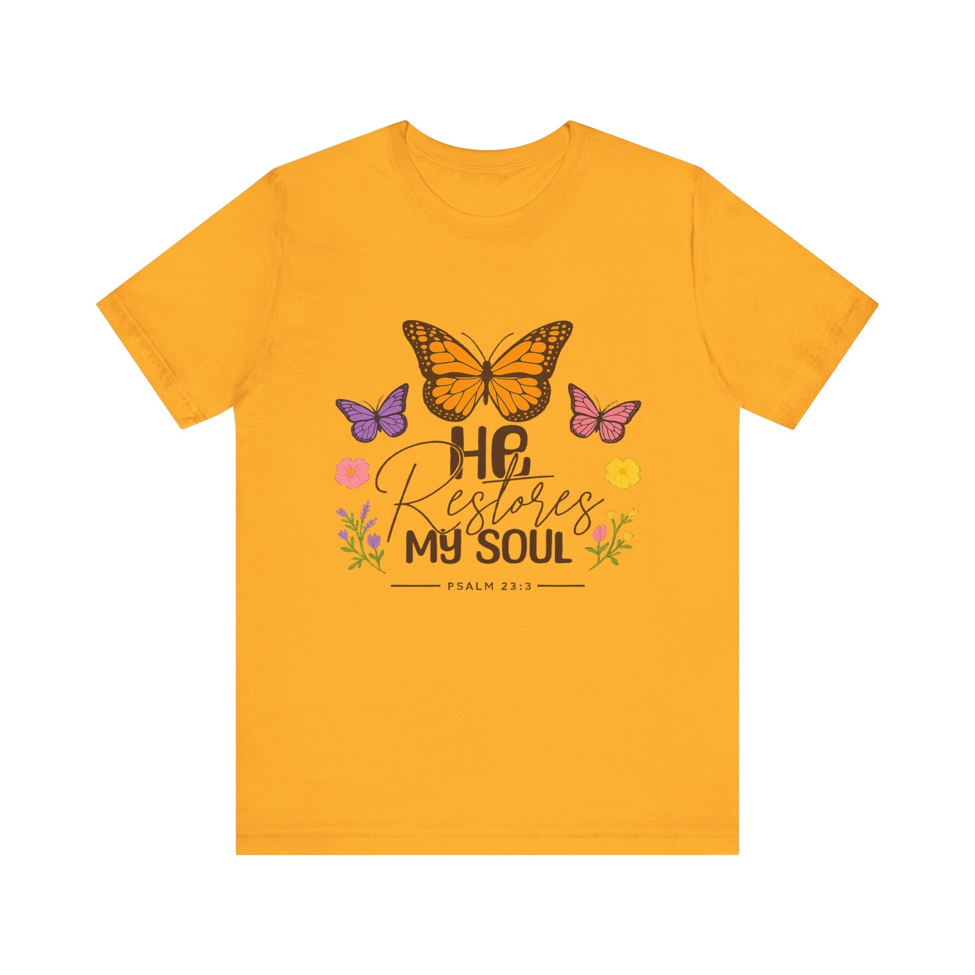 A beautiful and colorful Tee featuring butterflies and a beautiful script with a line from Psalm 23. This Tee gives off a peaceful and spiritual vibe, perfect for those who appreciate nature and religious quotes. Ideal for casual wear or layered looks, suitable for adults and perfect for active and leisure wear. Great for believers or nature enthusiasts, relevant for spiritual observances and casual occasions.