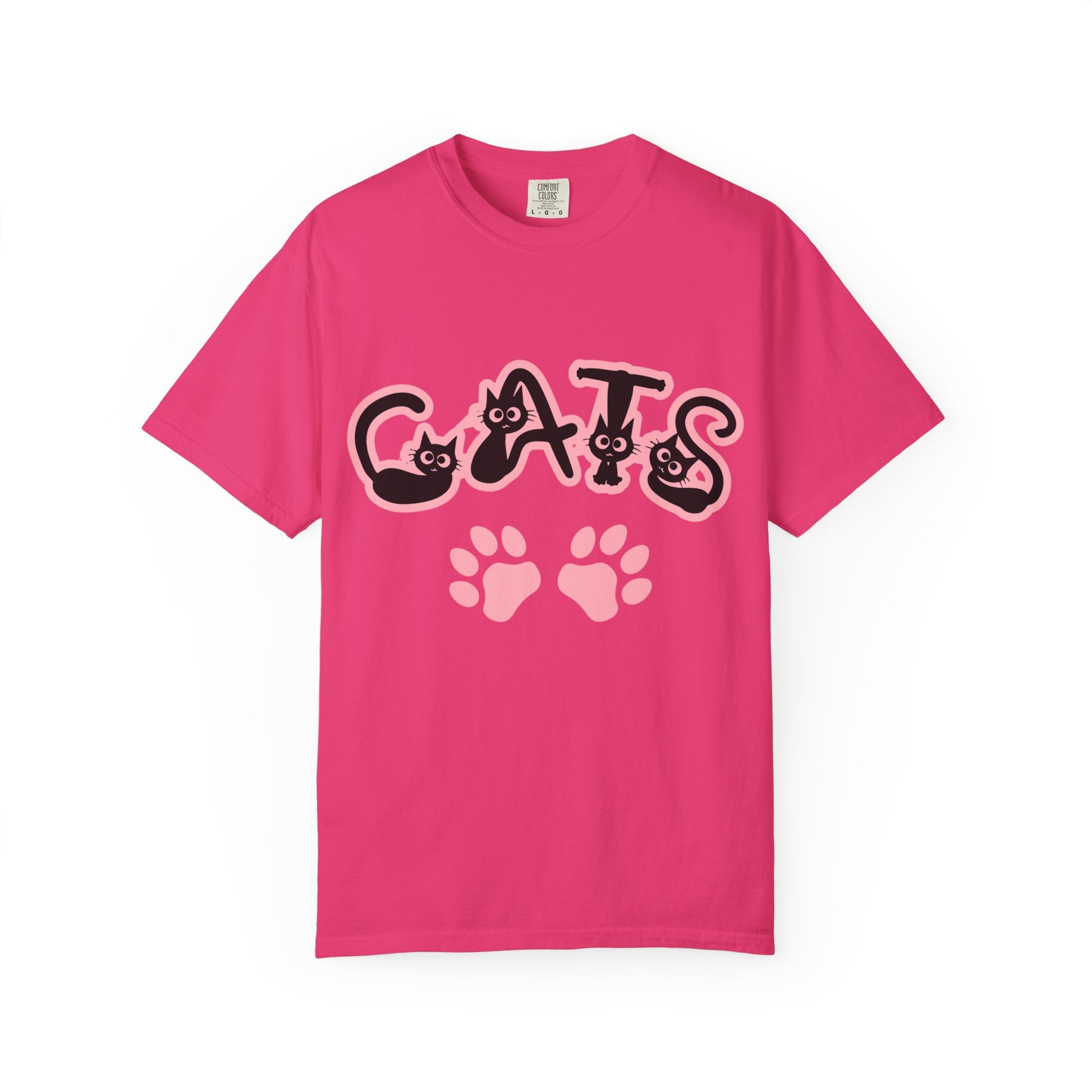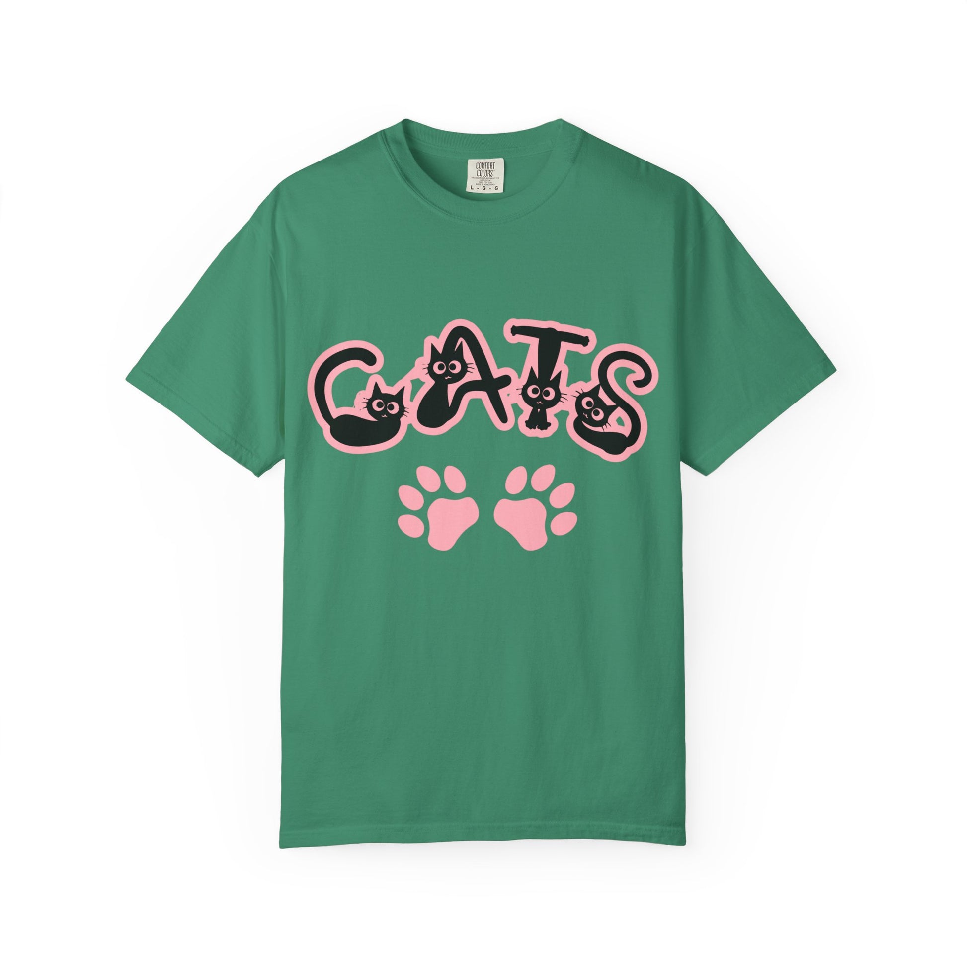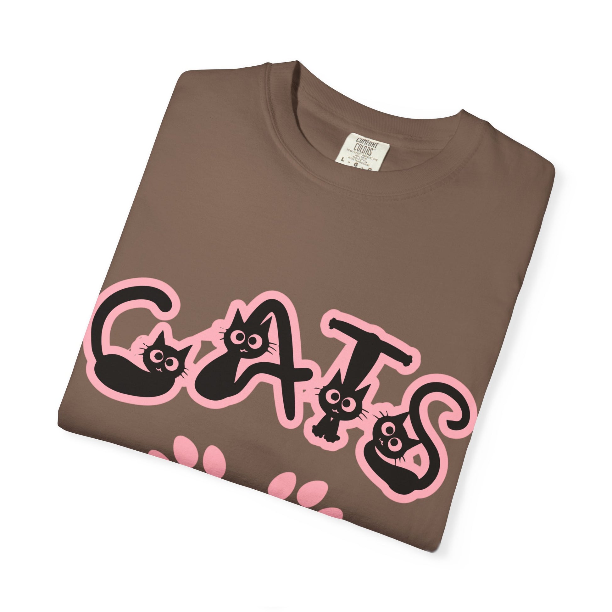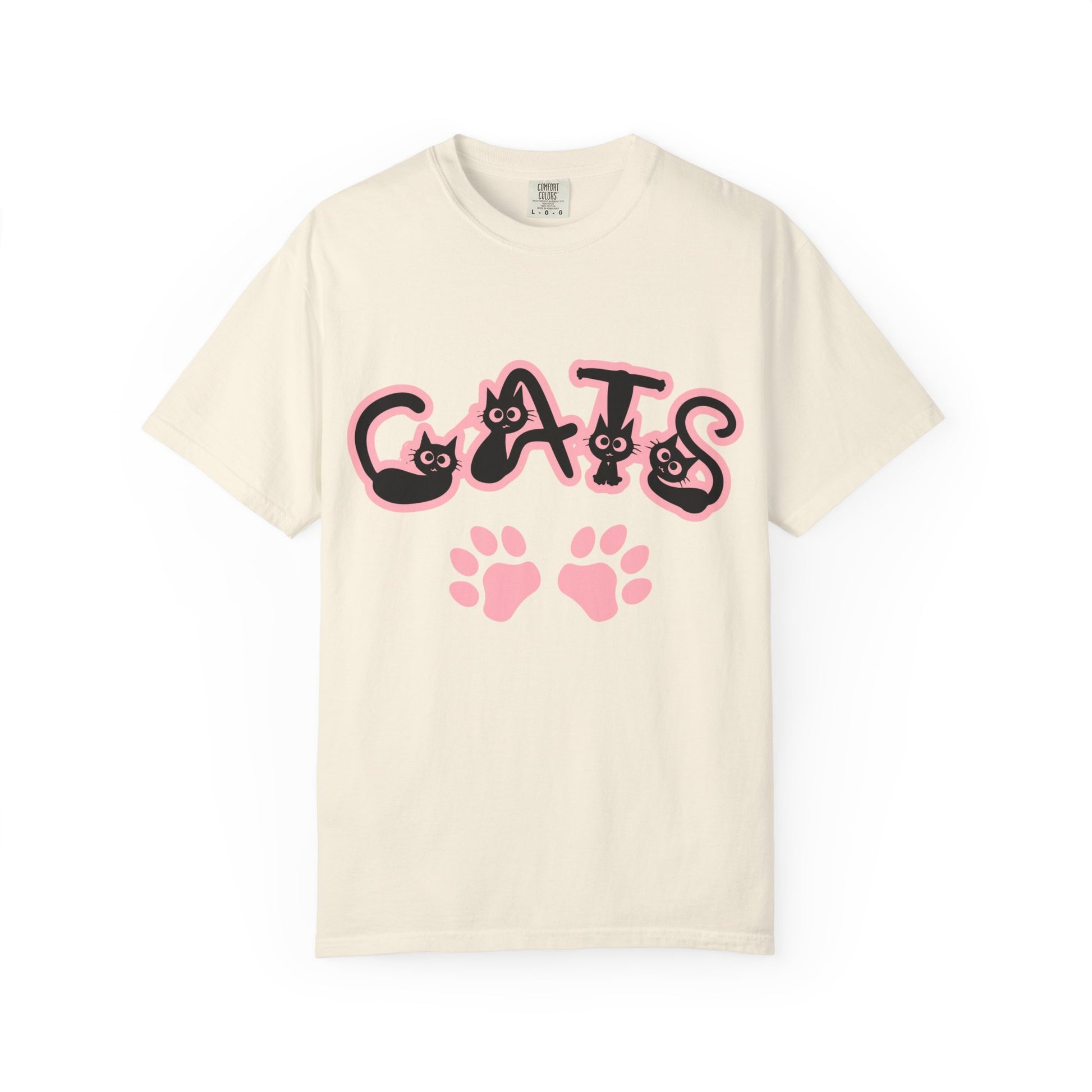 This adorable T-shirt is perfect for cat lovers, featuring the word "CATS" spelled out in cat font with each letter formed with a cat pose. Two centered paw prints complete the look, giving off a cute and playful vibe. This tee is great for casual wear and makes a fantastic gift for cat enthusiasts, perfect for holidays like National Cat Day.