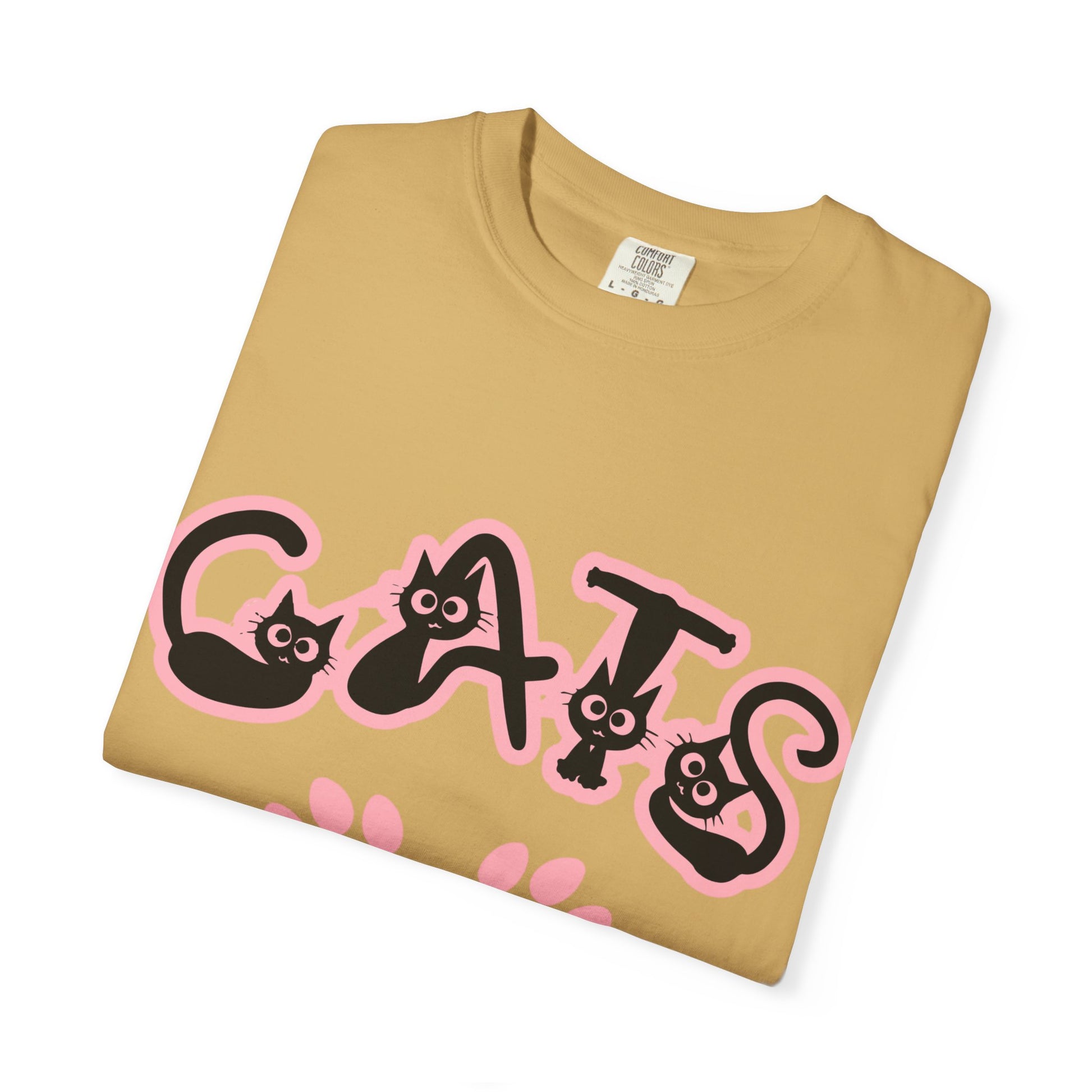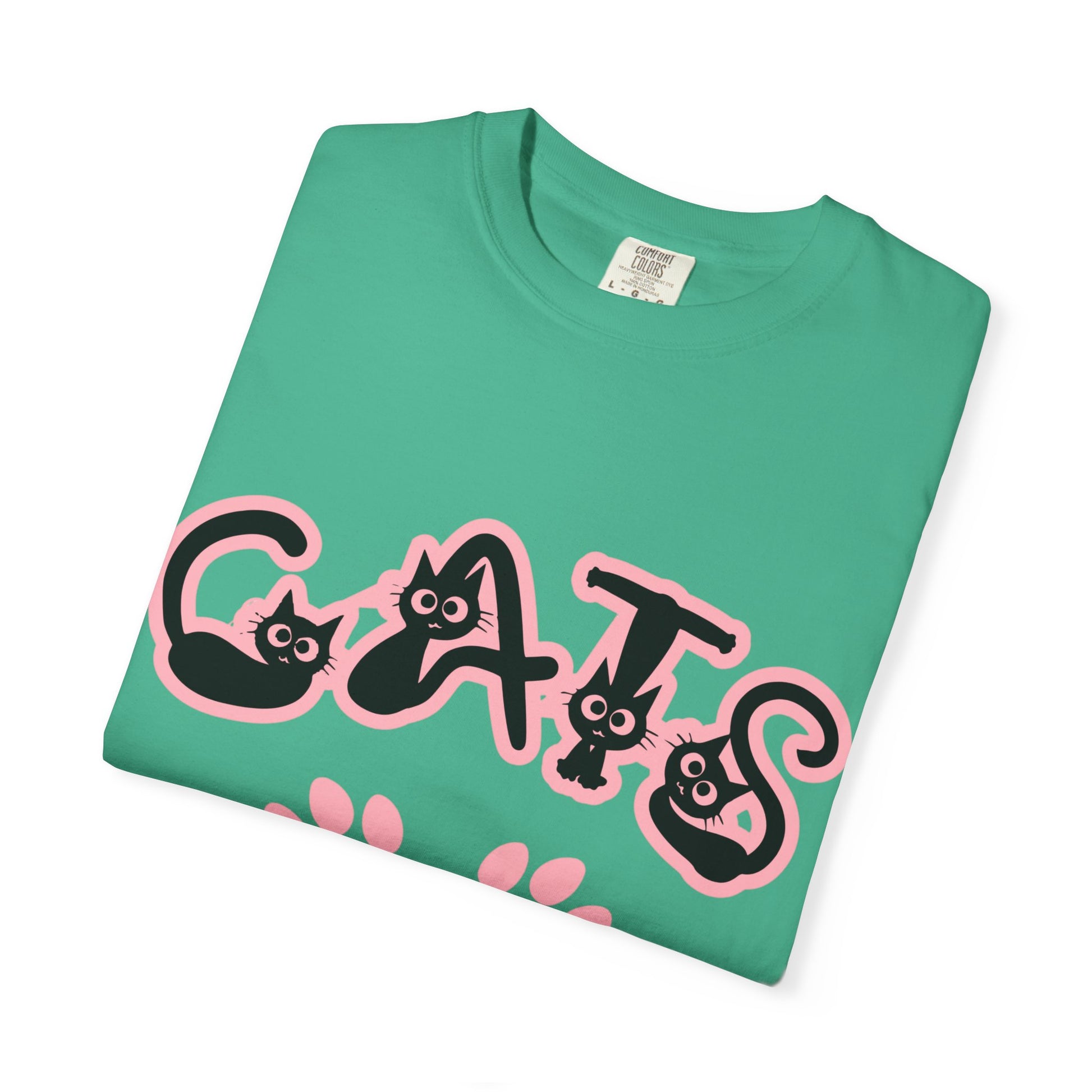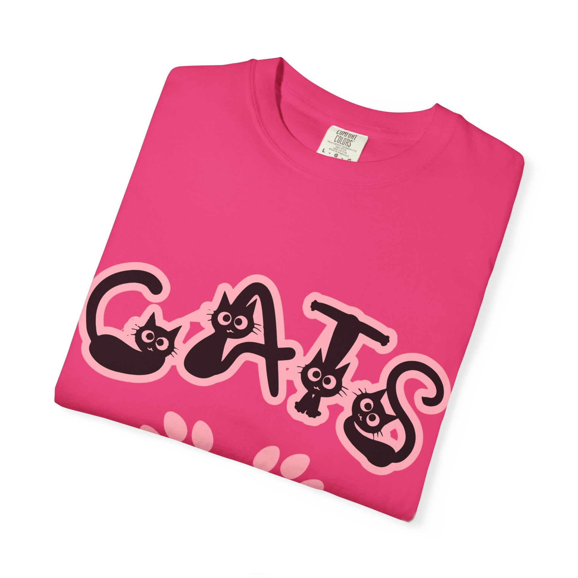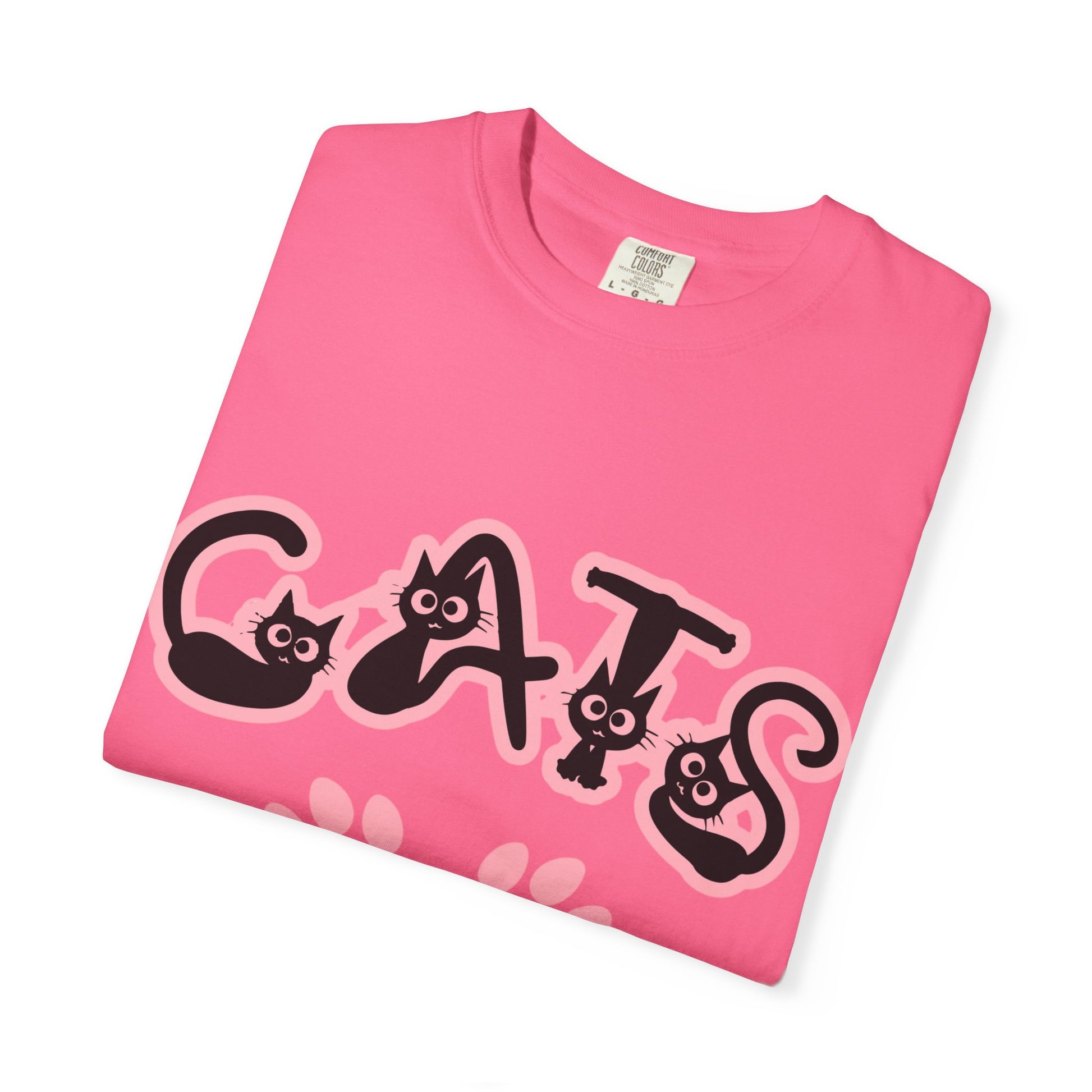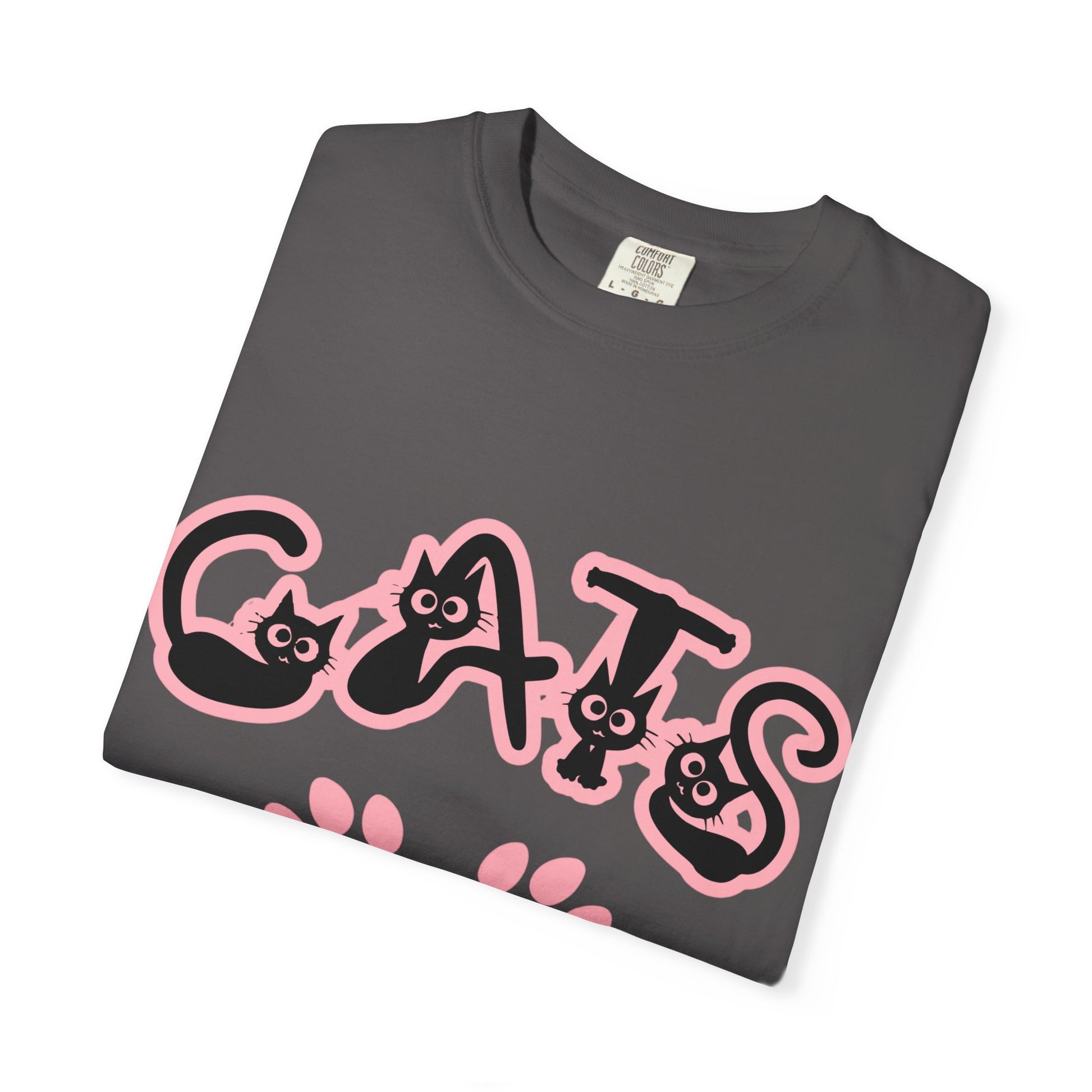 This adorable T-shirt is perfect for cat lovers, featuring the word "CATS" spelled out in cat font with each letter formed with a cat pose. Two centered paw prints complete the look, giving off a cute and playful vibe. This tee is great for casual wear and makes a fantastic gift for cat enthusiasts, perfect for holidays like National Cat Day.
