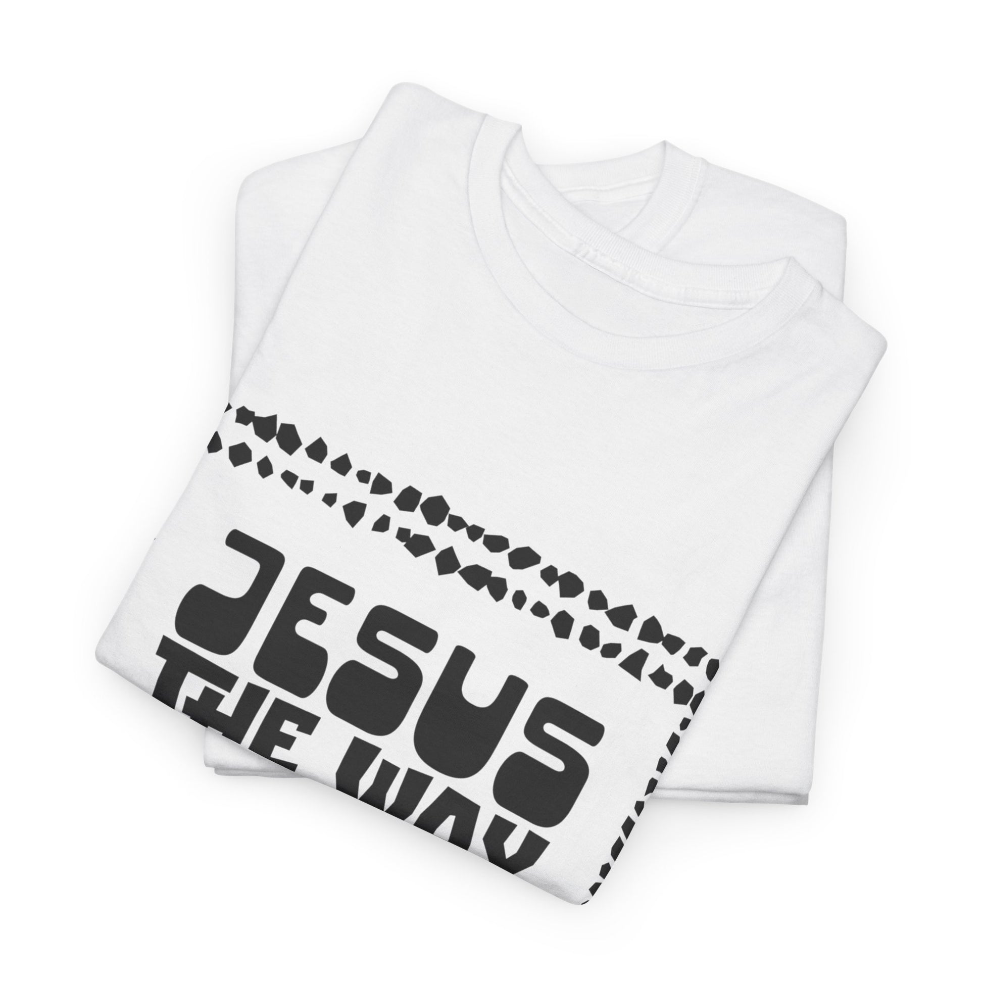 A hot T-Shirt in chunky funky letters and abstract beads with a paraphrased scripture from John 14:6. Perfect for those who want to make a bold statement with their outfit. Ideal for people looking for a trendy and unique clothing piece that stands out. Relevant for religious holidays and events.