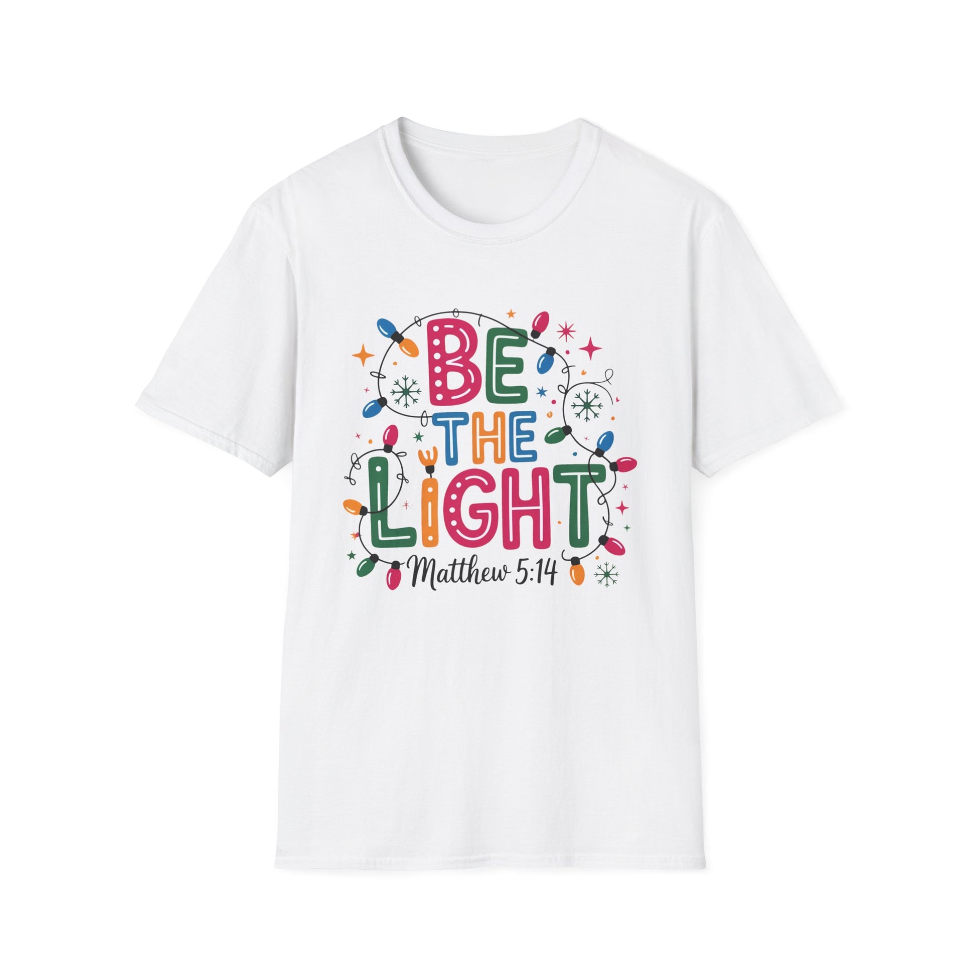 A bright and festive unisex T-Shirt for believers during the Christmas season, featuring a scripture verse and reference from Matthew 5:14 to 'Be the Light'. This T-Shirt is perfect for spreading positivity and holiday cheer, making it a great gift for those who celebrate Christmas and want to share their faith.