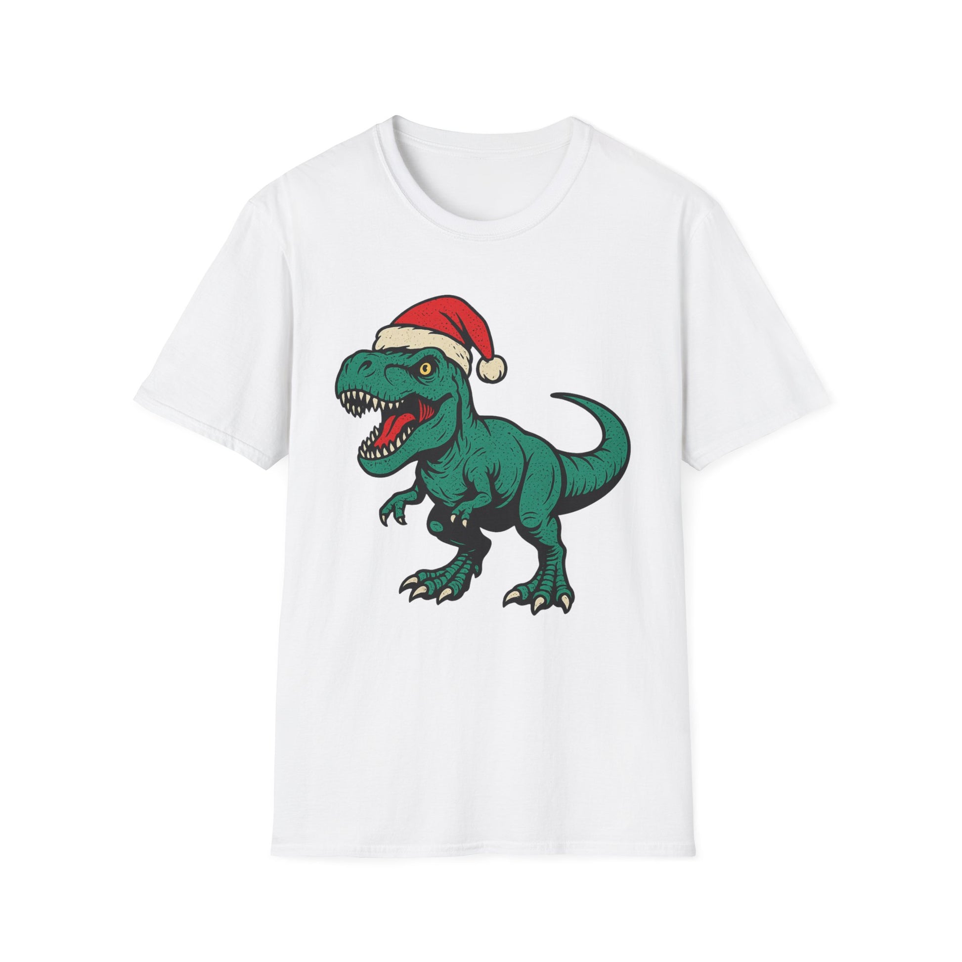 This adorable Dinosaur Tee is perfect for the Christmas season, featuring a design of dinosaurs celebrating the holiday. A unisex softstyle t-shirt made with durable and smooth fabric, ideal for adults. The classic fit and crew neckline make it versatile for any occasion.