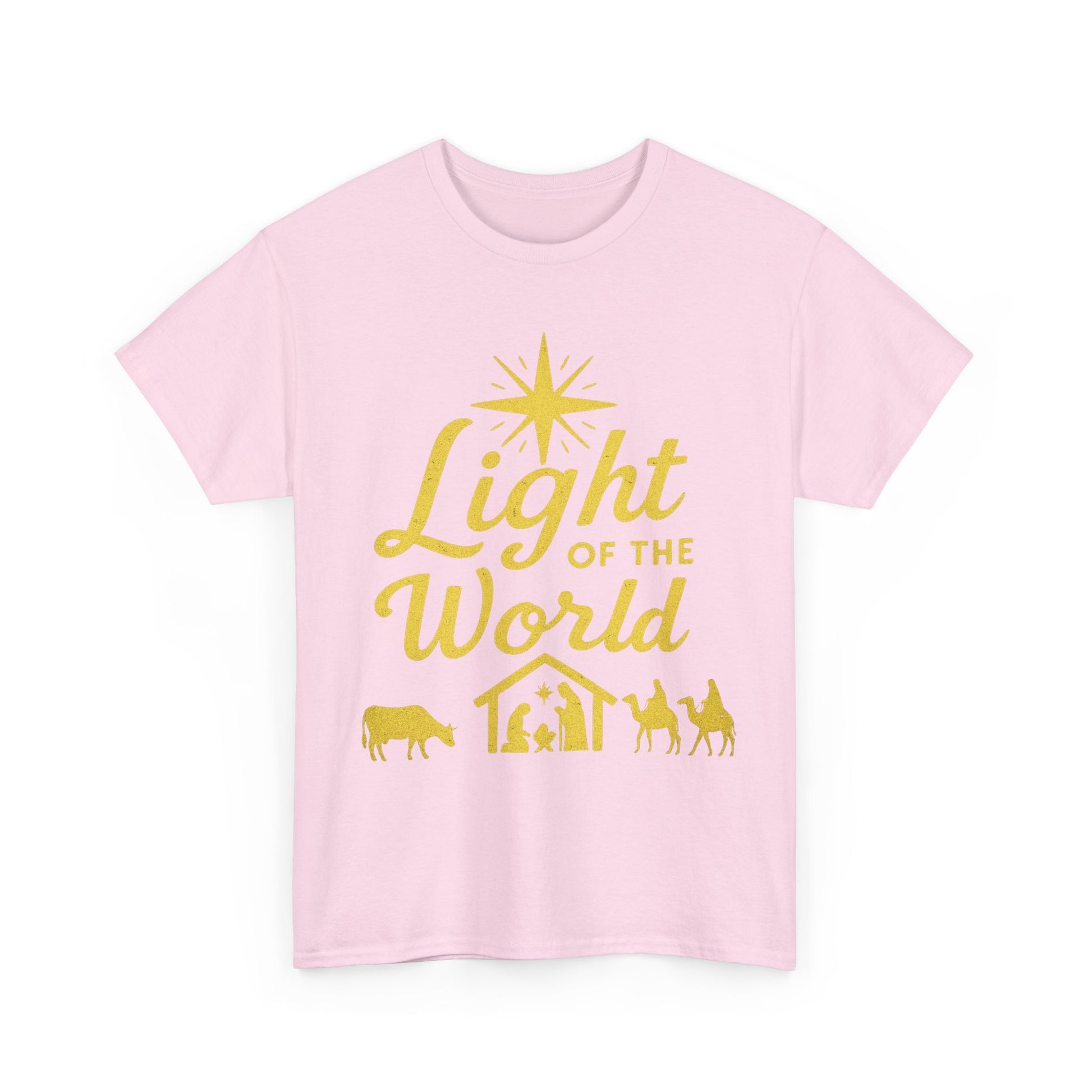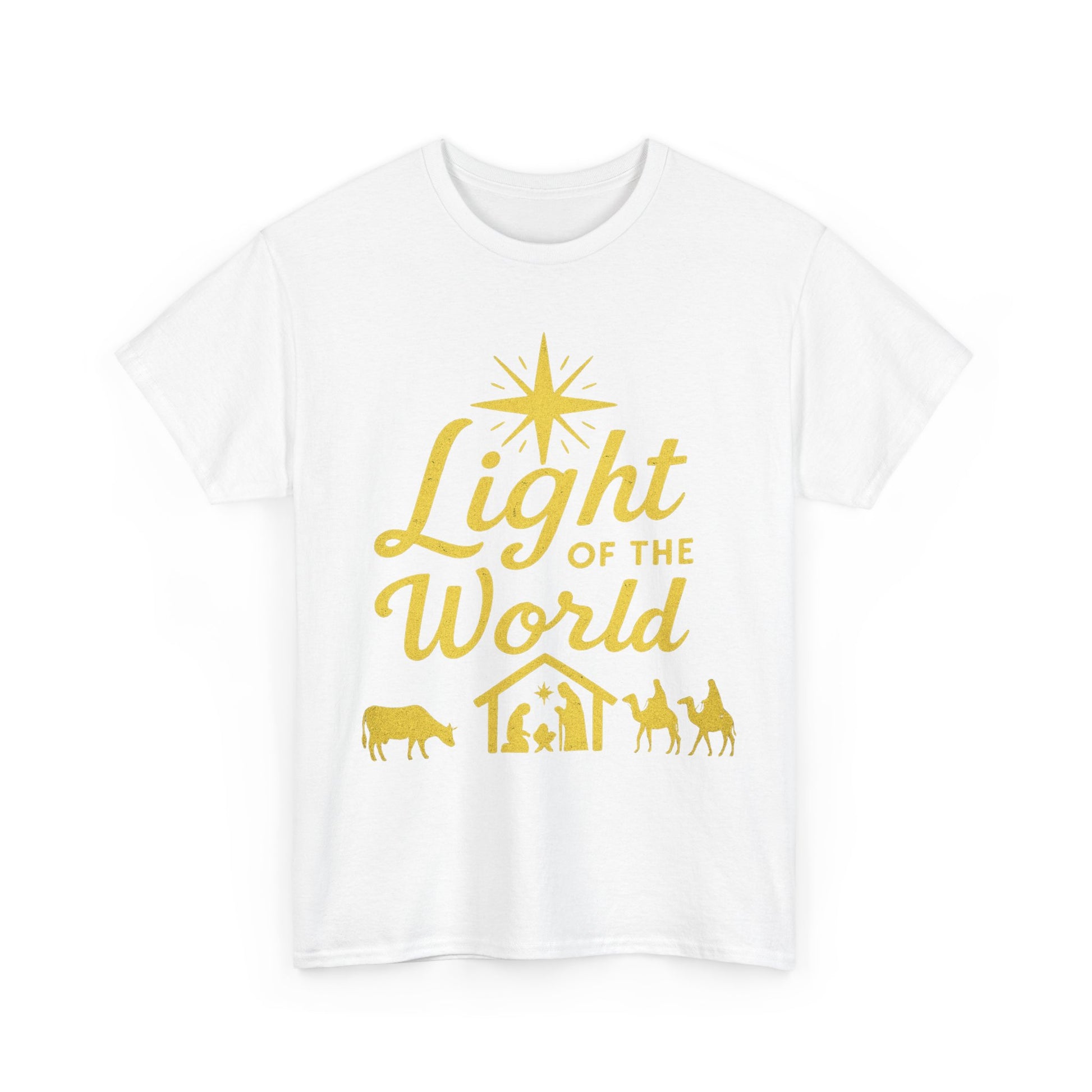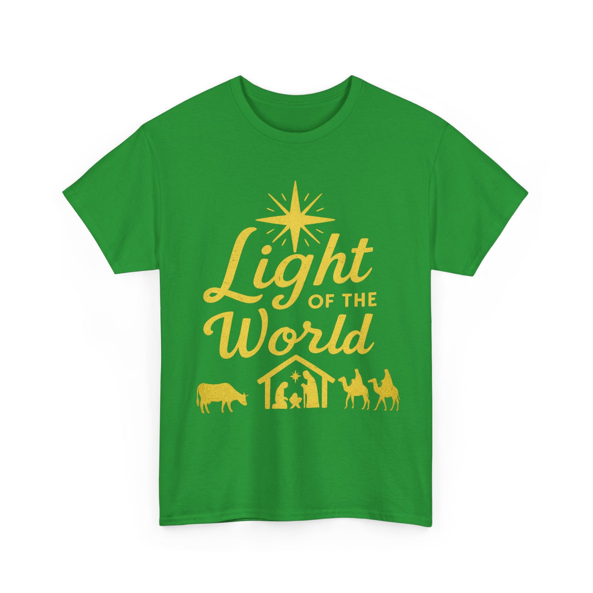 A holiday-themed tee perfect for Christmas celebrations, featuring an elegant bright text that reads 'LIGHT OF THE WORLD' accompanied by a nativity image. This tee is ideal for adults looking to showcase their faith during the holiday season.