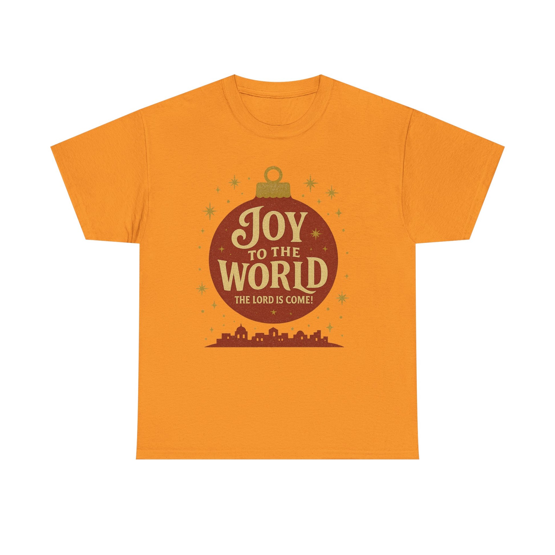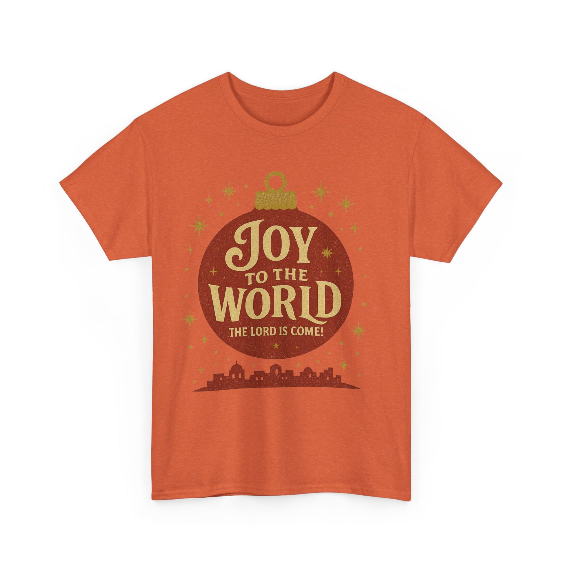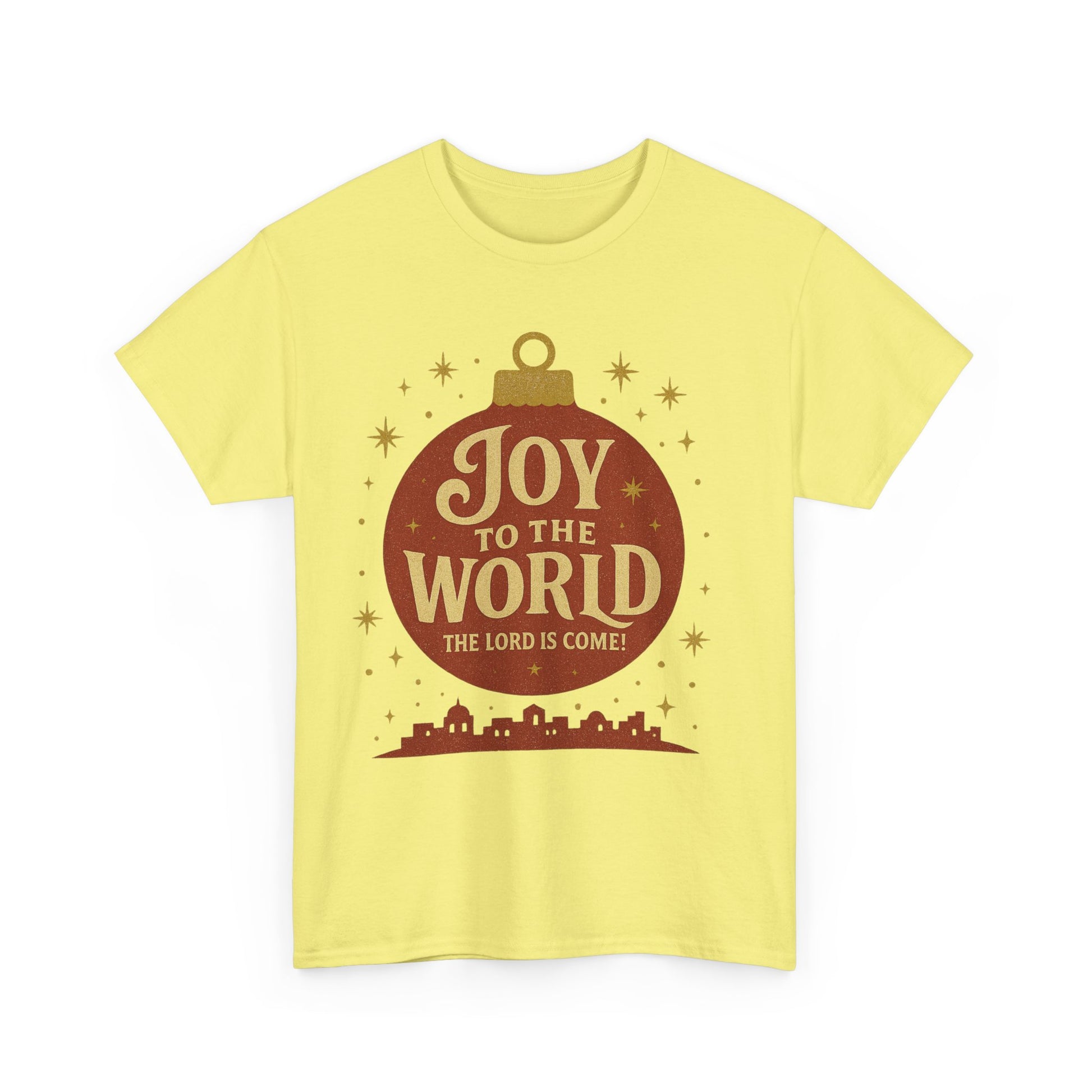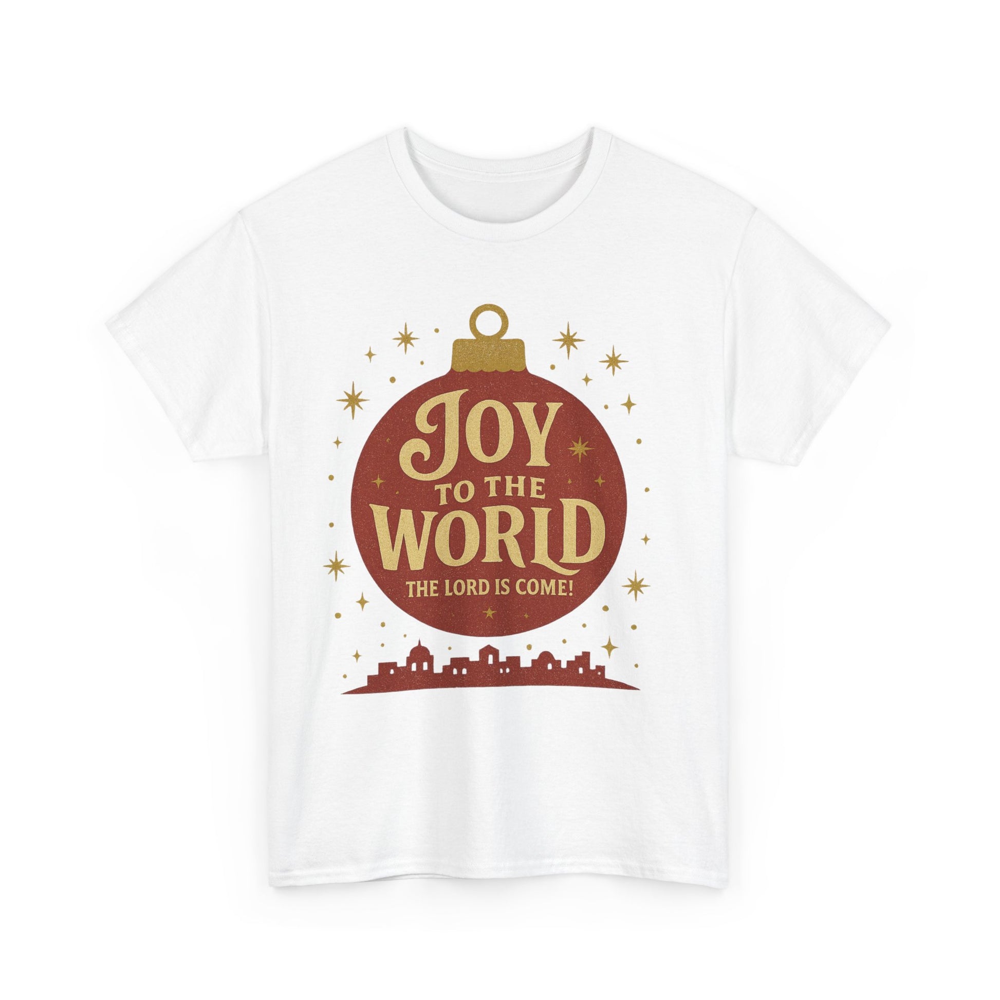 This beautiful bright tee is the perfect addition to your holiday wardrobe, featuring a big bright red Christmas ornament with the message 'Joy to the World The World Has Come' above an image of The Little Town Of Bethlehem. It exudes a festive and joyous vibe, making it ideal for Christmas celebrations. This unisex heavy cotton tee is suitable for adults and is made with high-quality fabric for year-round comfort and durability.