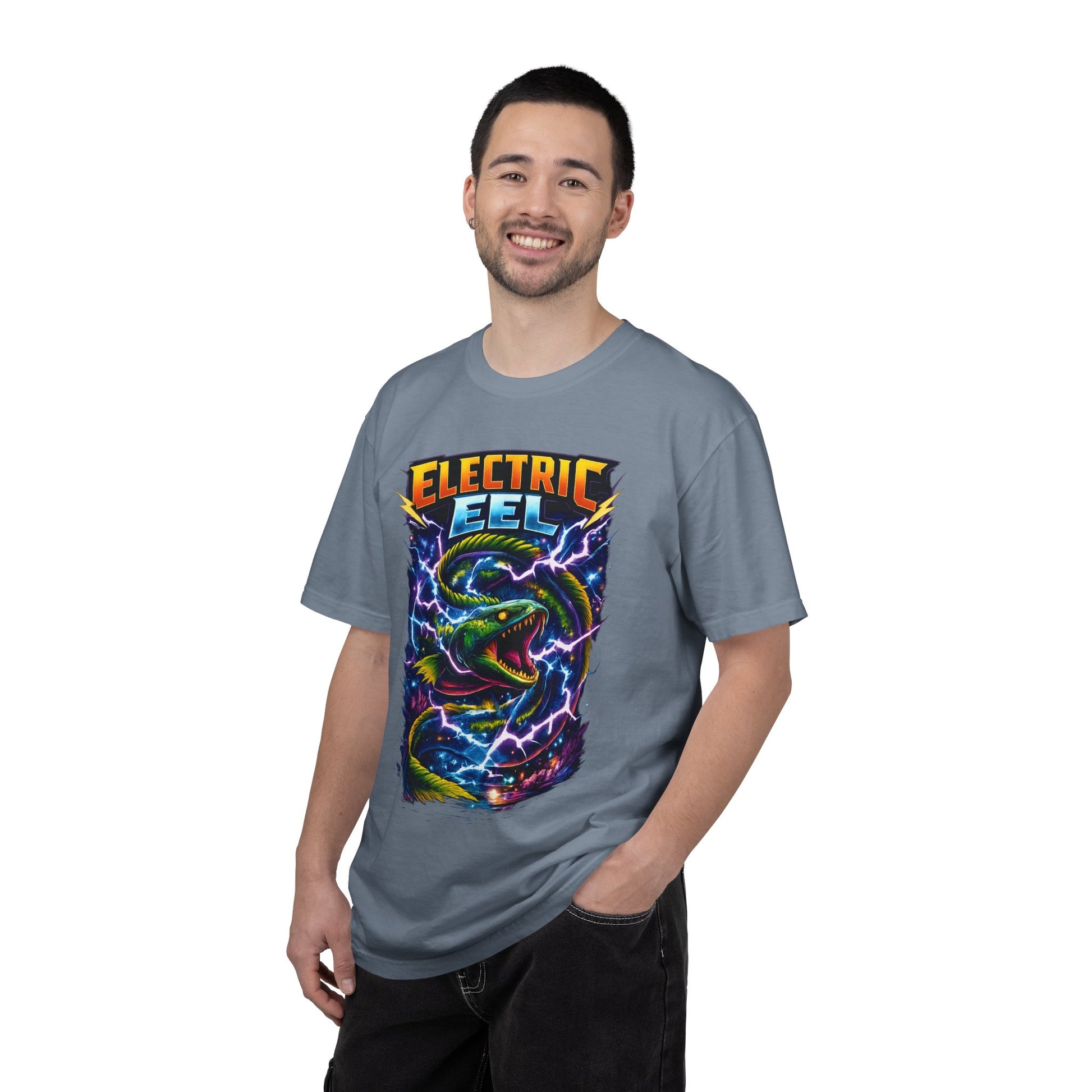 Electric energy, saltwater grit, and bold attitude — this tee carries the pulse of the deep. The vivid electric eel artwork crackles with neon lightning and motion, like a marine current you can wear. Short walks to the arcade, late-night study sessions, or crowded shows — it’s the kind of shirt that starts conversations and holds its own. The heavyweight, garment-dyed cotton breaks in soft over time, gaining that worn-in texture while the relaxed fit keeps you comfortable in motion. For ocean nerds, gamers, and anyone who leans into bold visuals, this shirt feels like an extension of that loud, curious personality. Throw it on with ripped jeans or layered under a worn jacket; the art stays bright, the fabric stays lived-in, and the vibe stays electric.