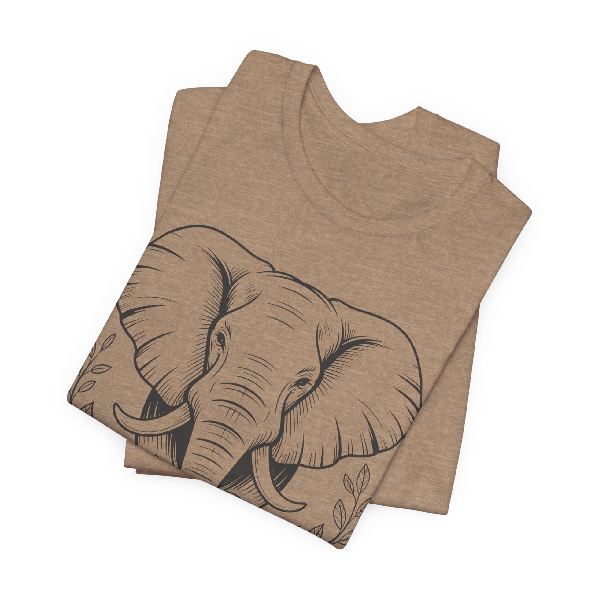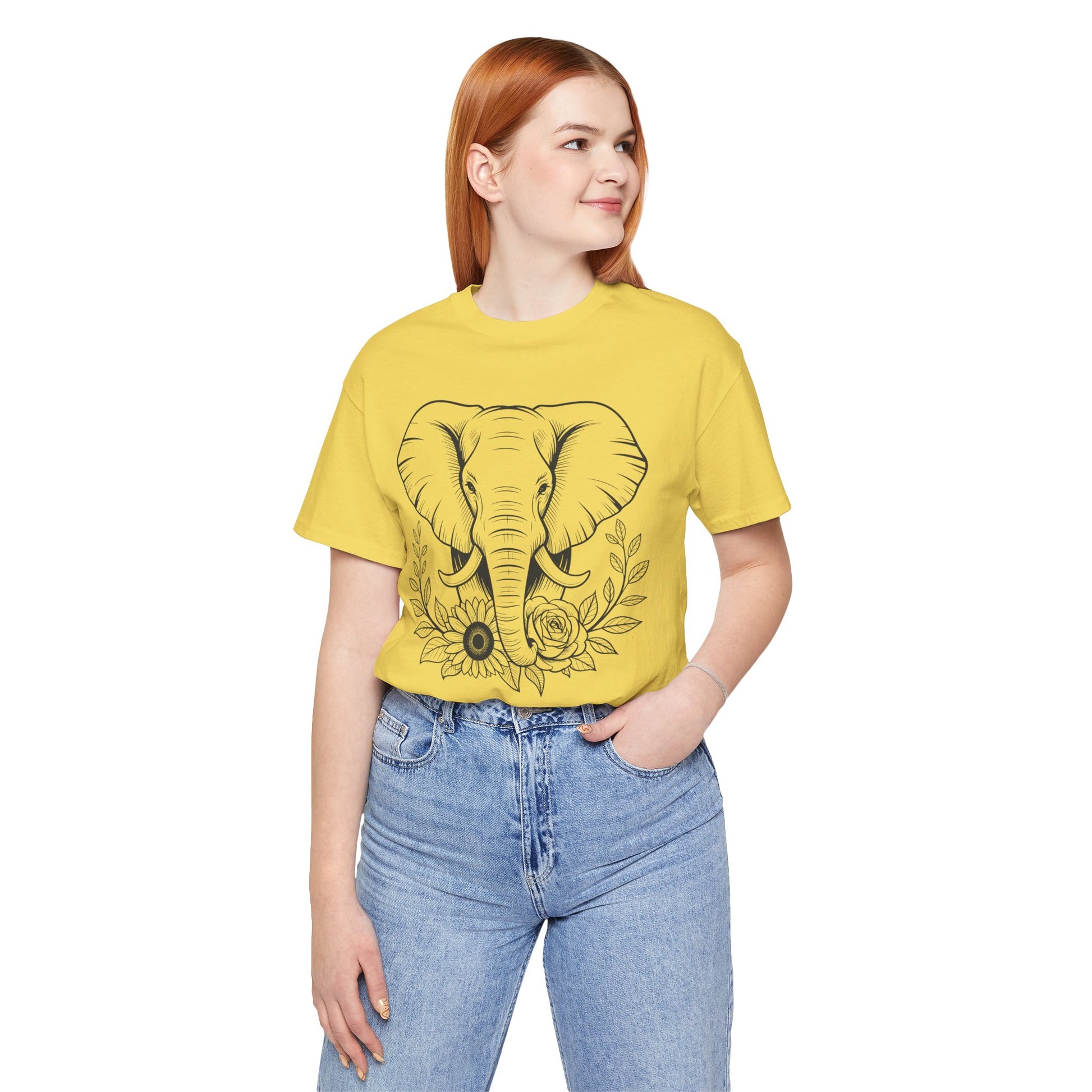 This lightweight tee carries a quiet kind of power. A bold elephant stands at the center, its calm gaze and steady stance anchored by a painterly floral border that drifts along the hem. Wear it on slow mornings or busy afternoons — it settles you into a steadier rhythm, a reminder of resilience wrapped in gentle detail. The shirt layers easily under jackets or pairs with relaxed denim; it moves with you from neighborhood walks to low-key meetups, signaling confidence without shouting. For anyone who values strength softening into beauty, this tee feels like carrying a small talisman: grounded, composed, and quietly elegant.