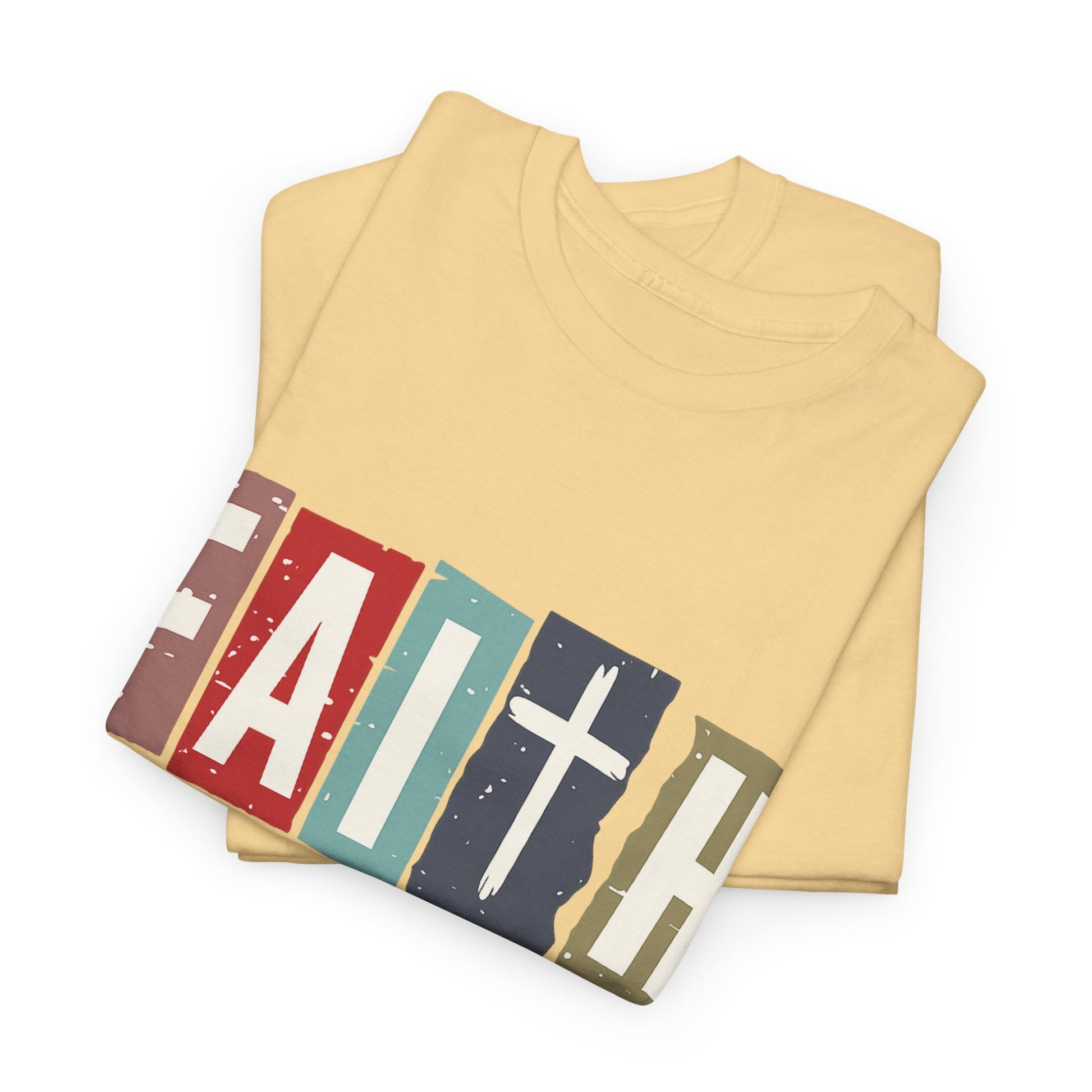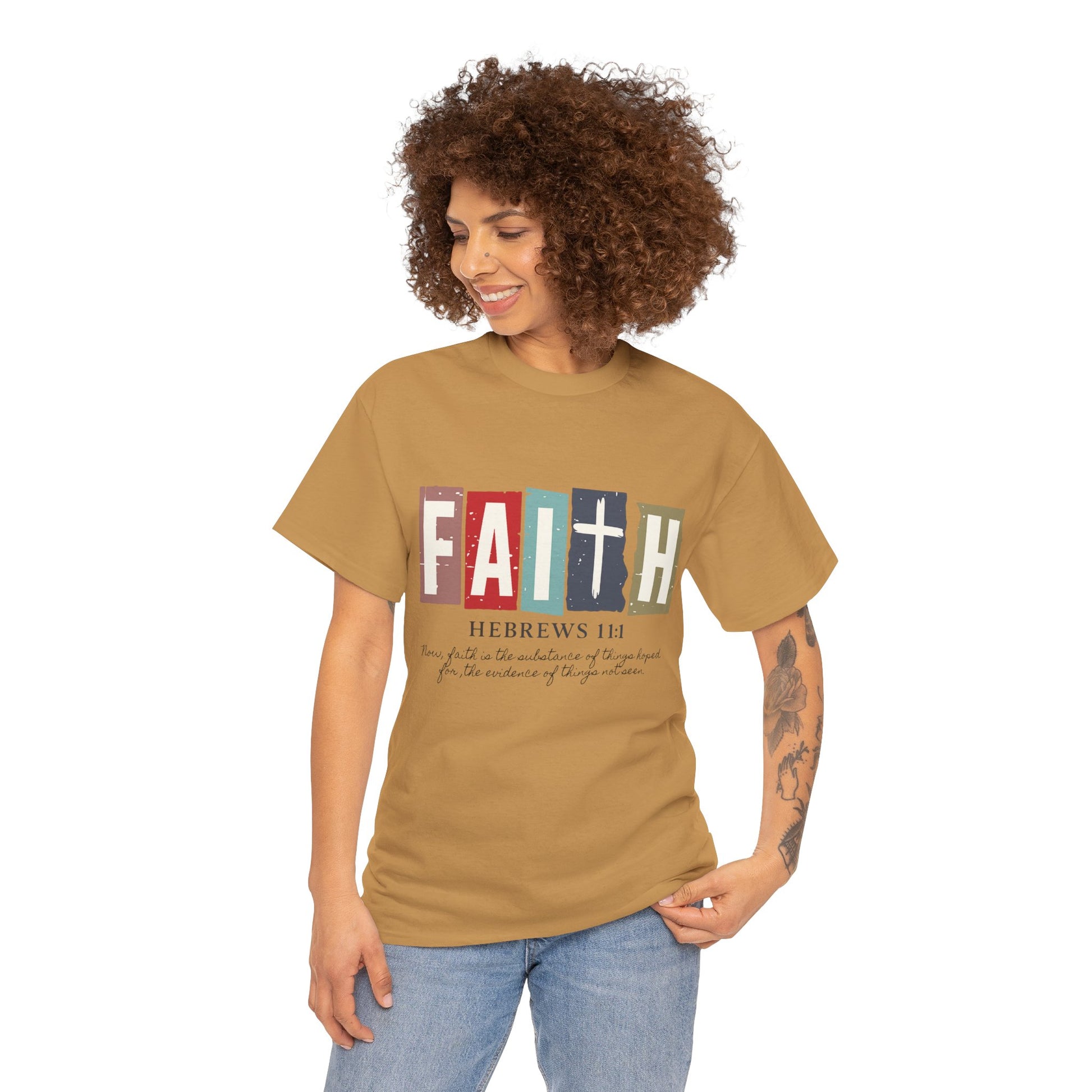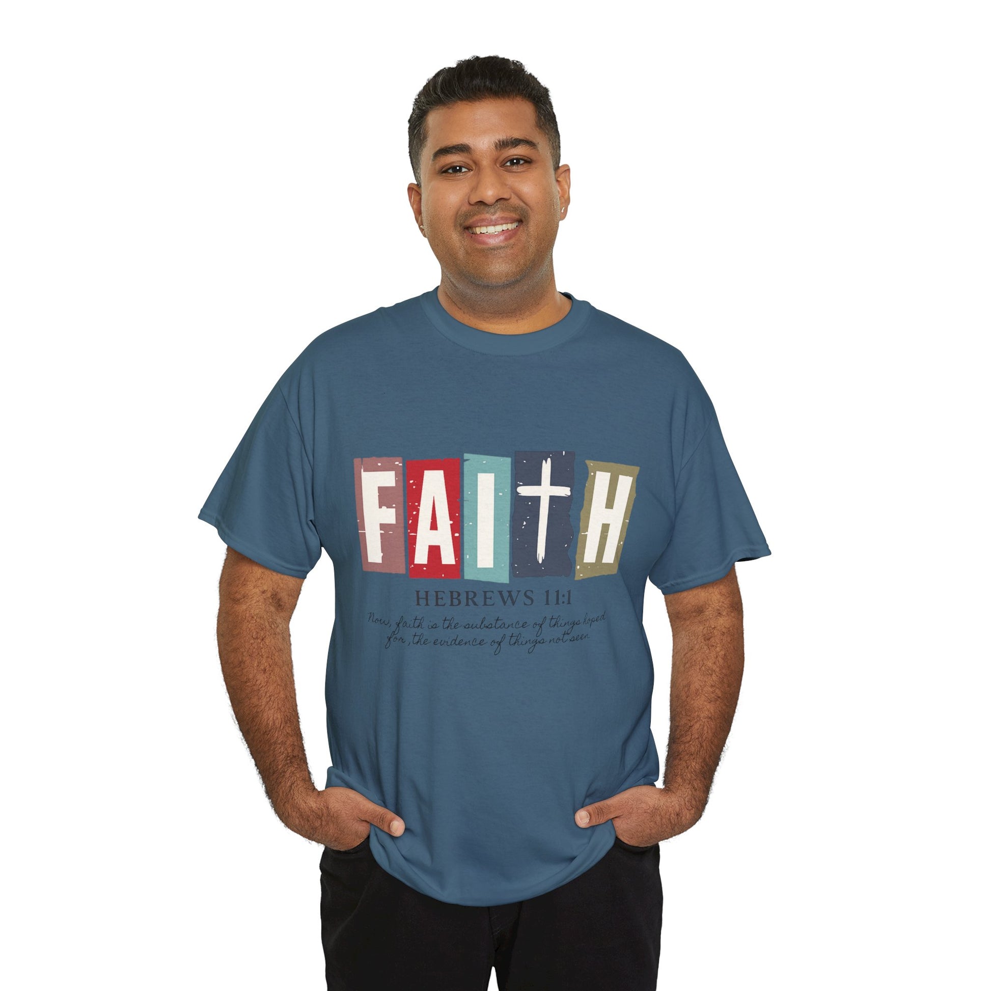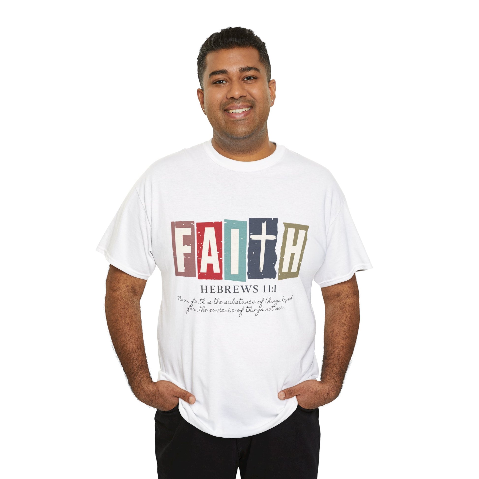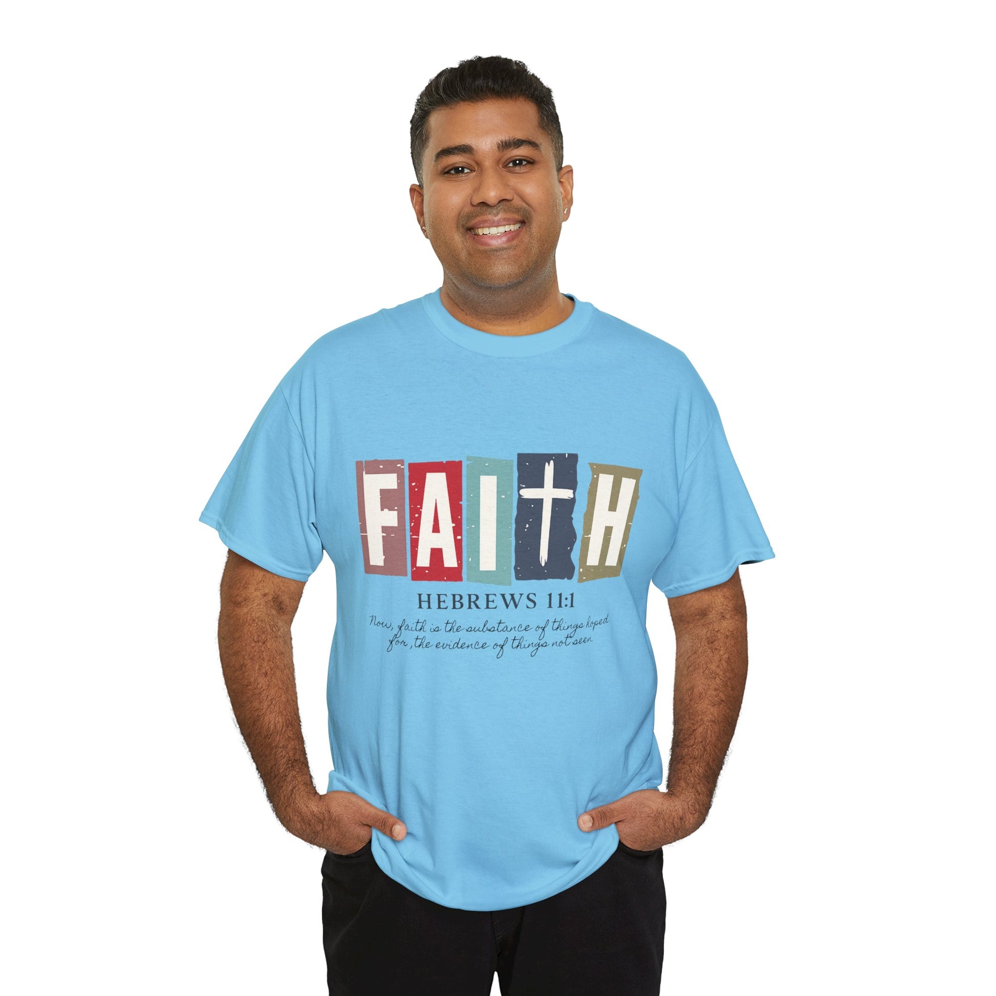 Colorful Christian T-shirt with funky letter tiles that spell out the word "FAITH"; and scripture reference - Hebrews 11:1. Gives off a positive and inspirational vibe, perfect for those who want to showcase their faith in a unique way. Ideal for Christian holidays, church events, and everyday wear for adults.