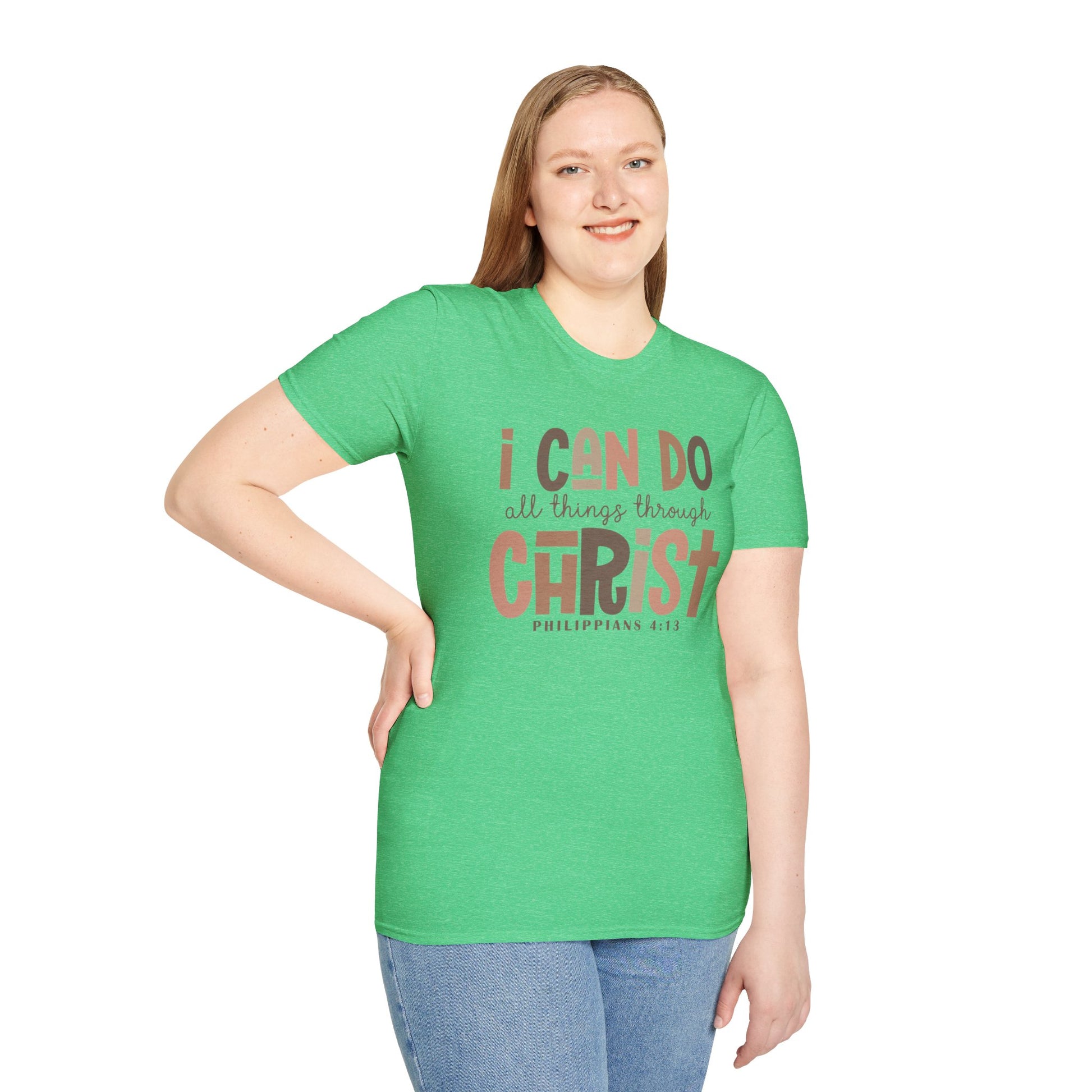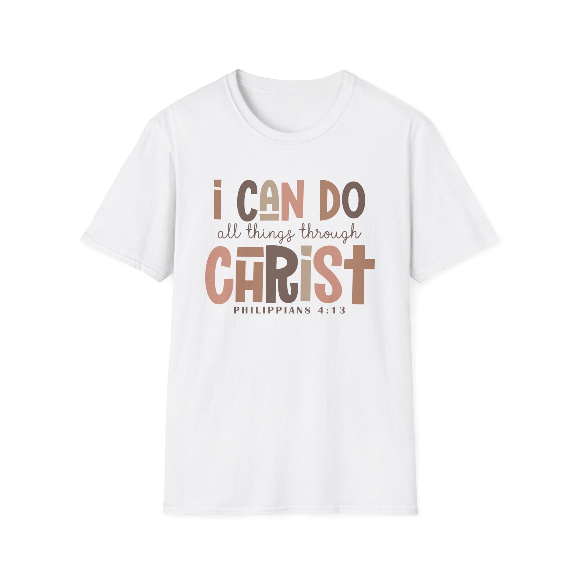 Wear your faith with this bold T-shirt featuring fun, earthtone colored text. The message- "I can do all things through Christ who strengthens me". Perfect for adults looking to express their religious beliefs, ideal for religious holidays and everyday wear.