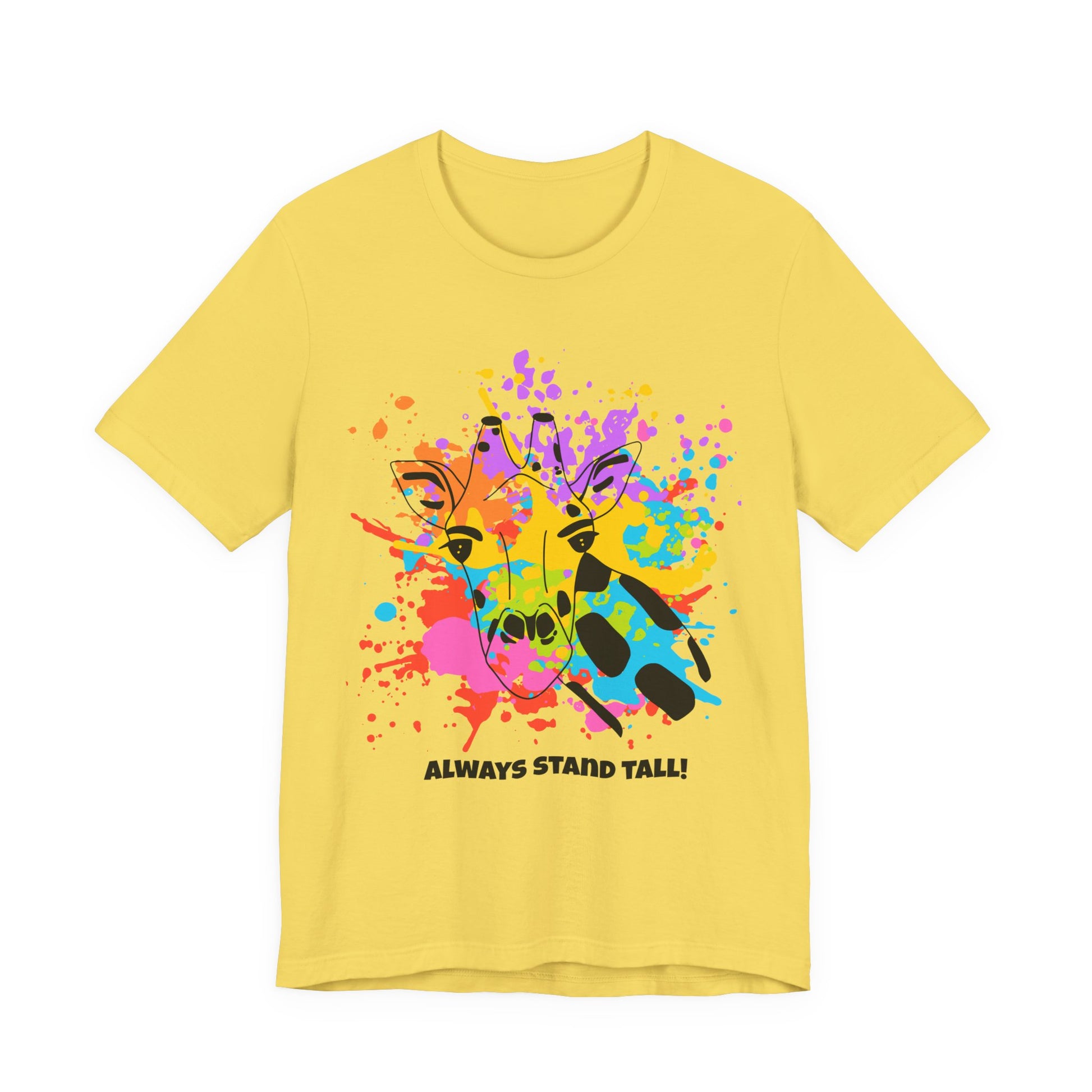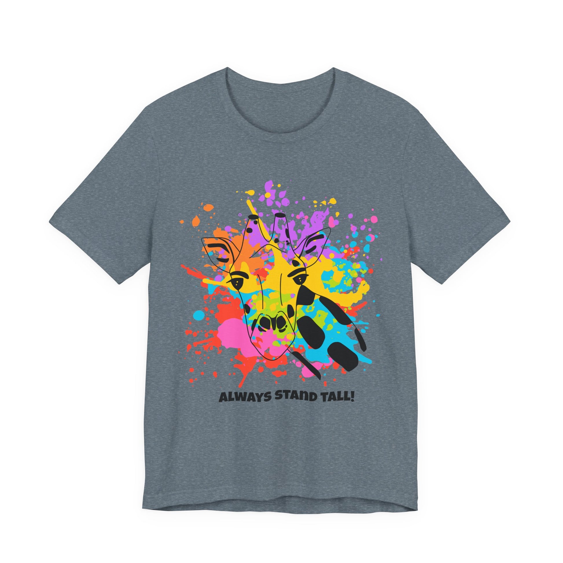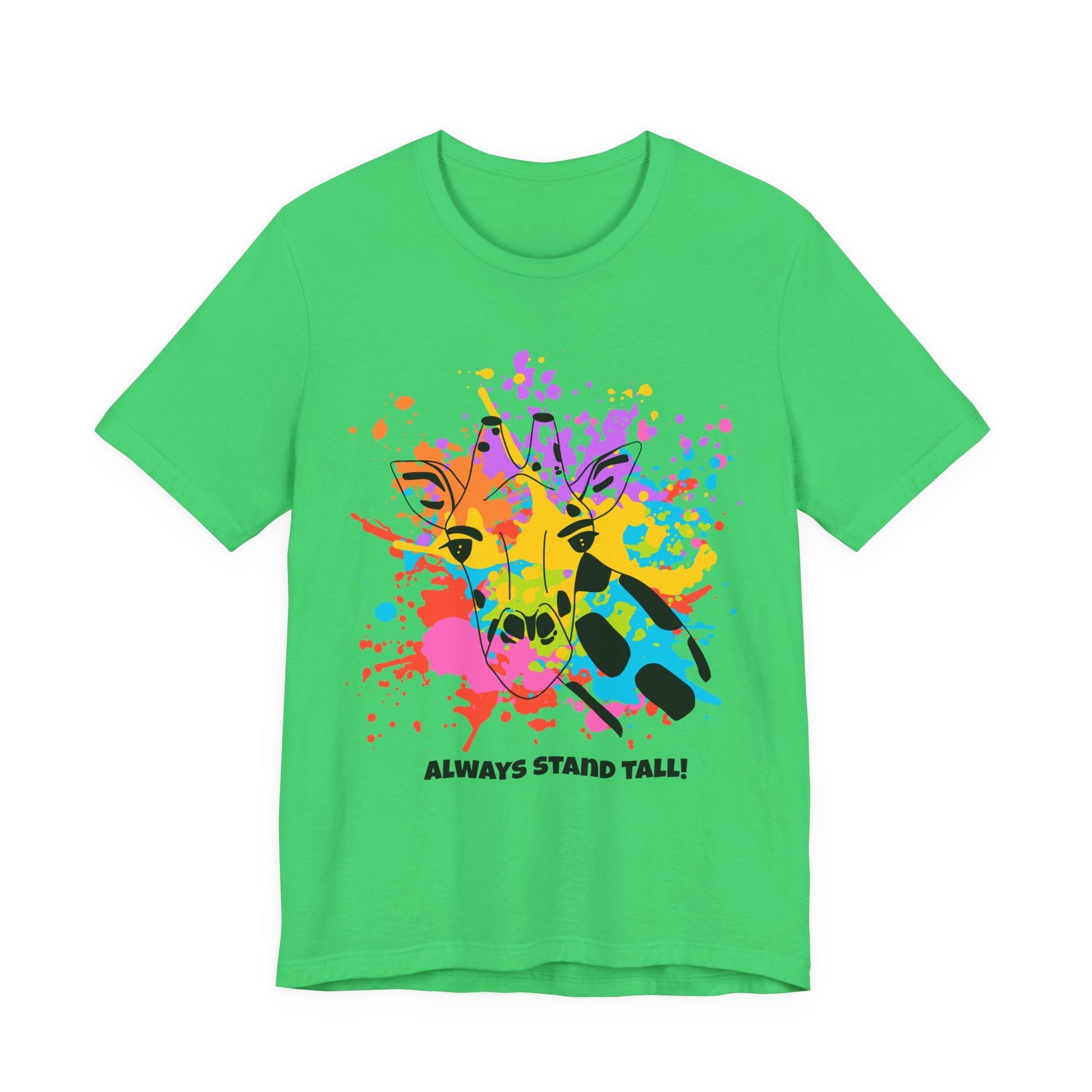 This colorful t-shirt features a giraffe surrounded by vibrant watersplashes, with a powerful tagline urging the wearer to always Stand Tall. It gives off a fun and positive vibe, perfect for those who love nature and positivity in their wardrobe. Ideal for casual wear, outdoor activities, and wildlife enthusiasts. Great for birthdays, Earth Day, and everyday wear.