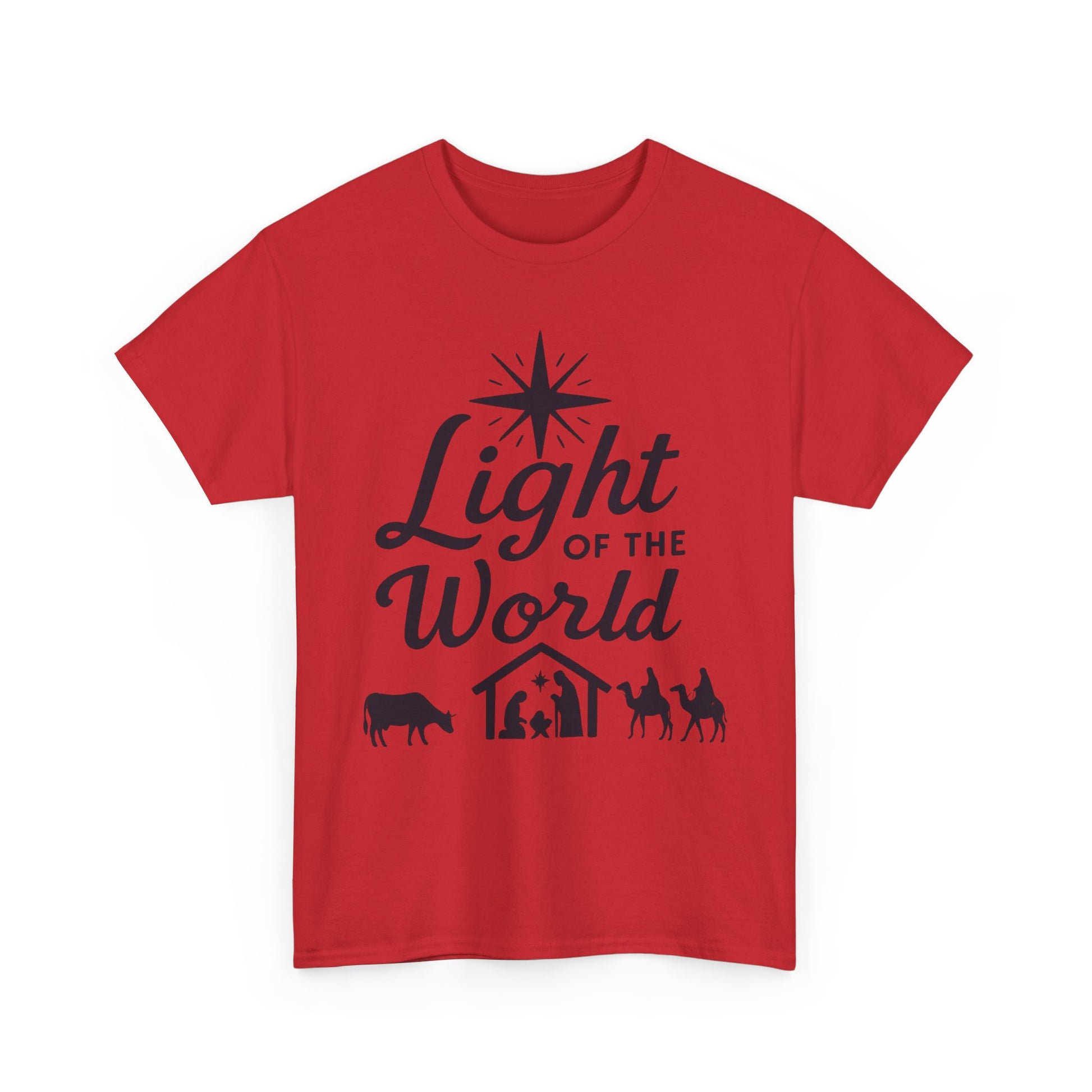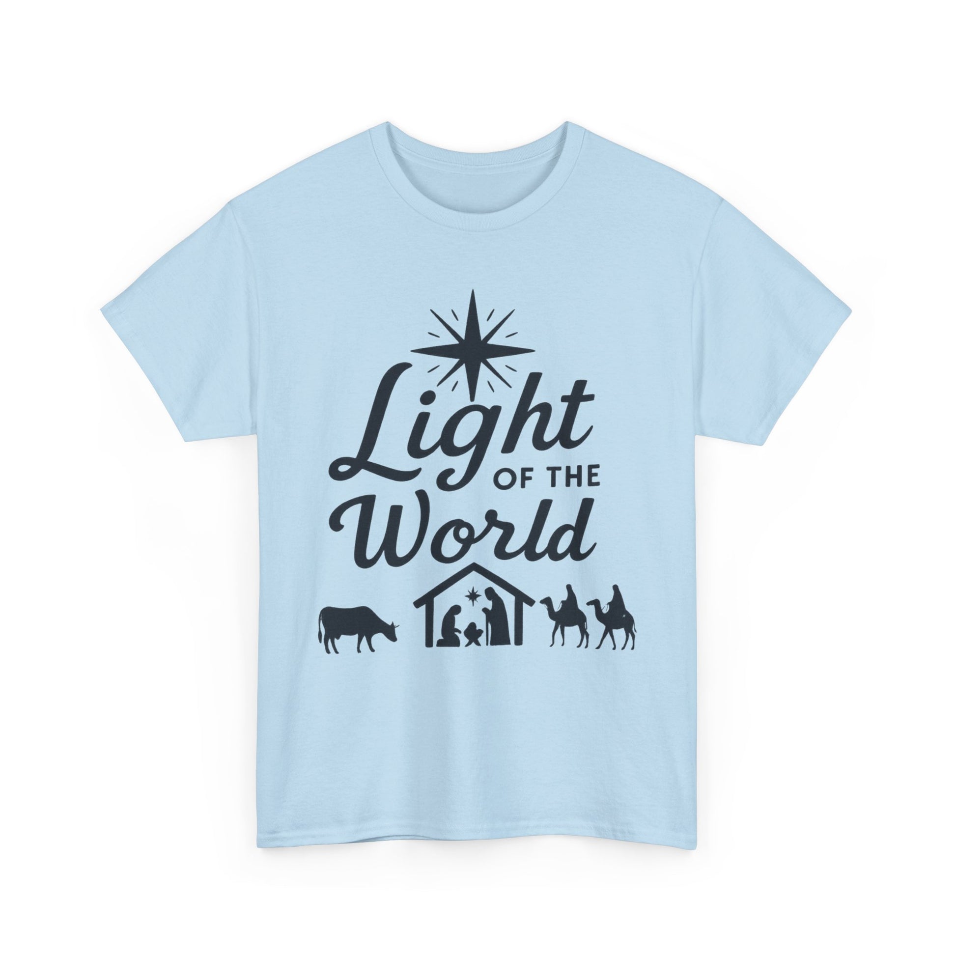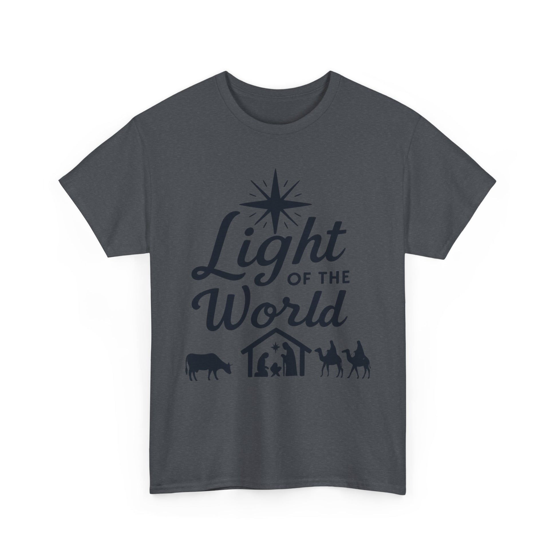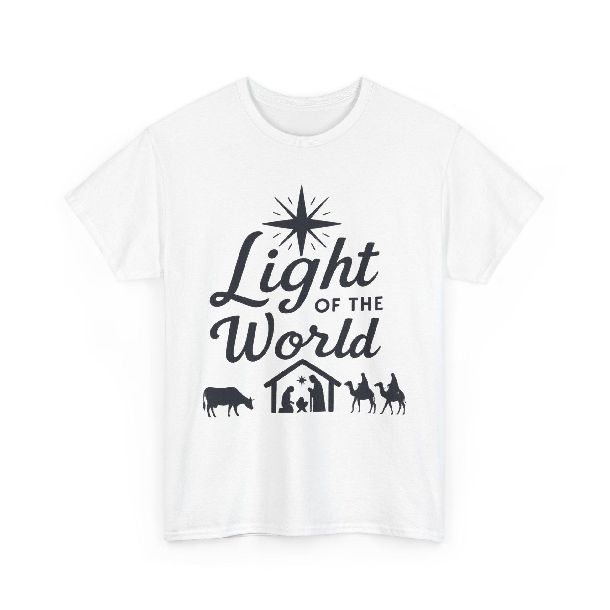 Light of the World - Dark version T-Shirt: Featuring the message 'Light of the World' in black ink above an image of the nativity, this T-Shirt gives off a classic and meaningful vibe. Perfect for those looking to celebrate the holiday season with a touch of faith and style.