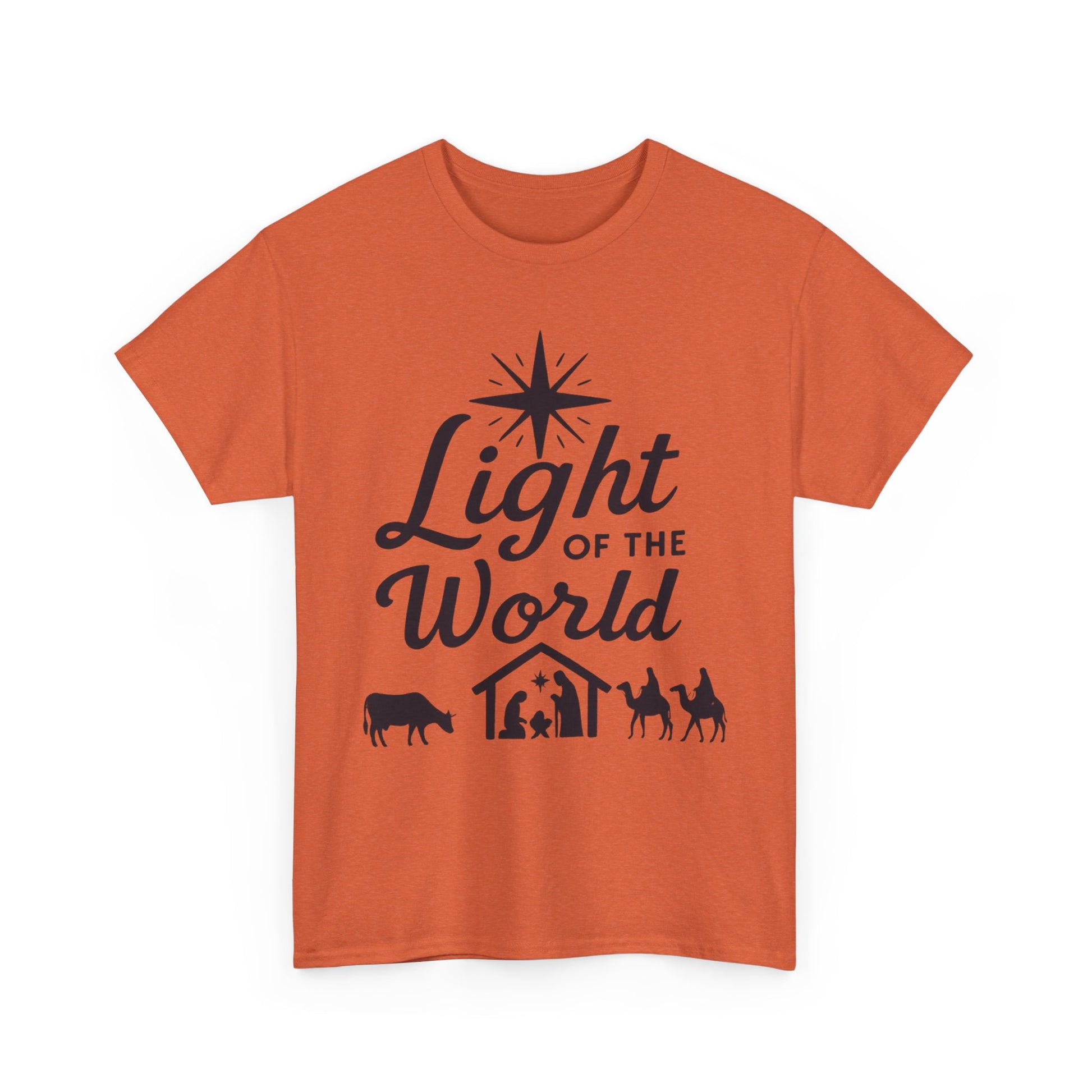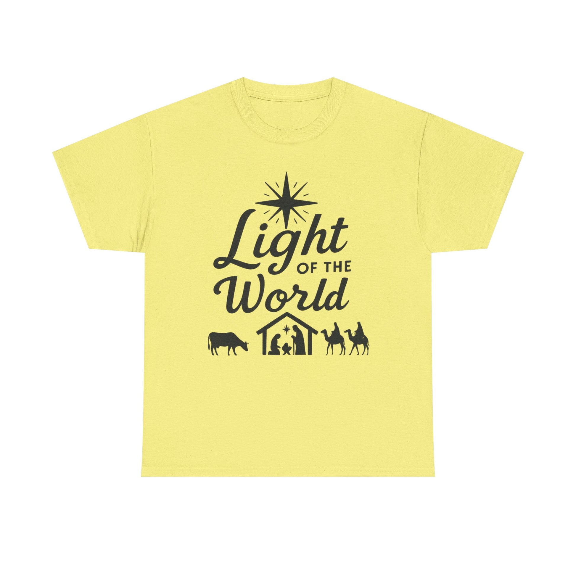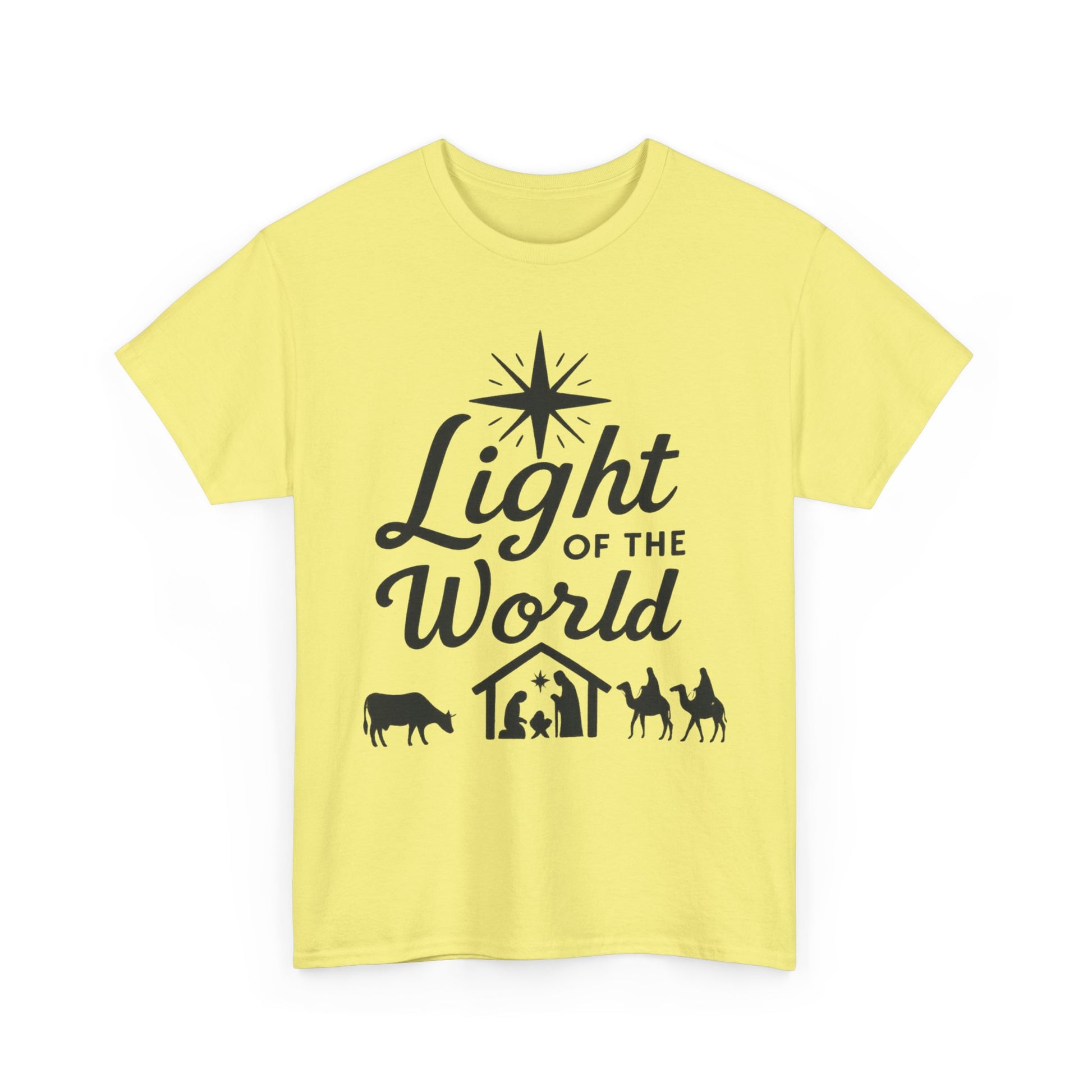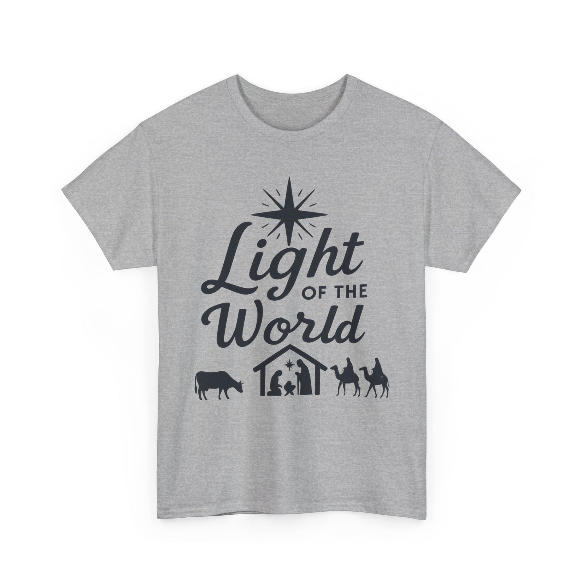 Light of the World - Dark version T-Shirt: Featuring the message 'Light of the World' in black ink above an image of the nativity, this T-Shirt gives off a classic and meaningful vibe. Perfect for those looking to celebrate the holiday season with a touch of faith and style.