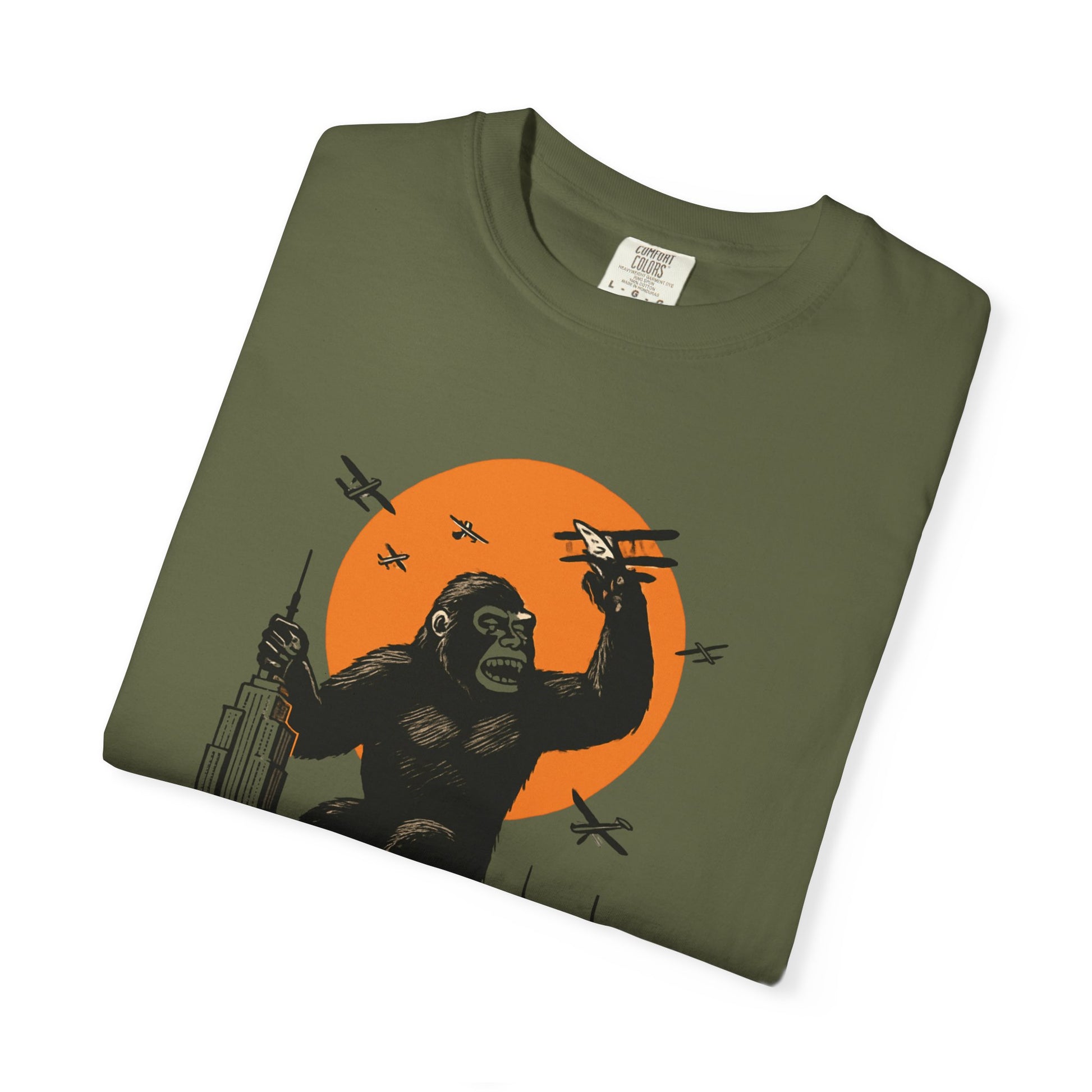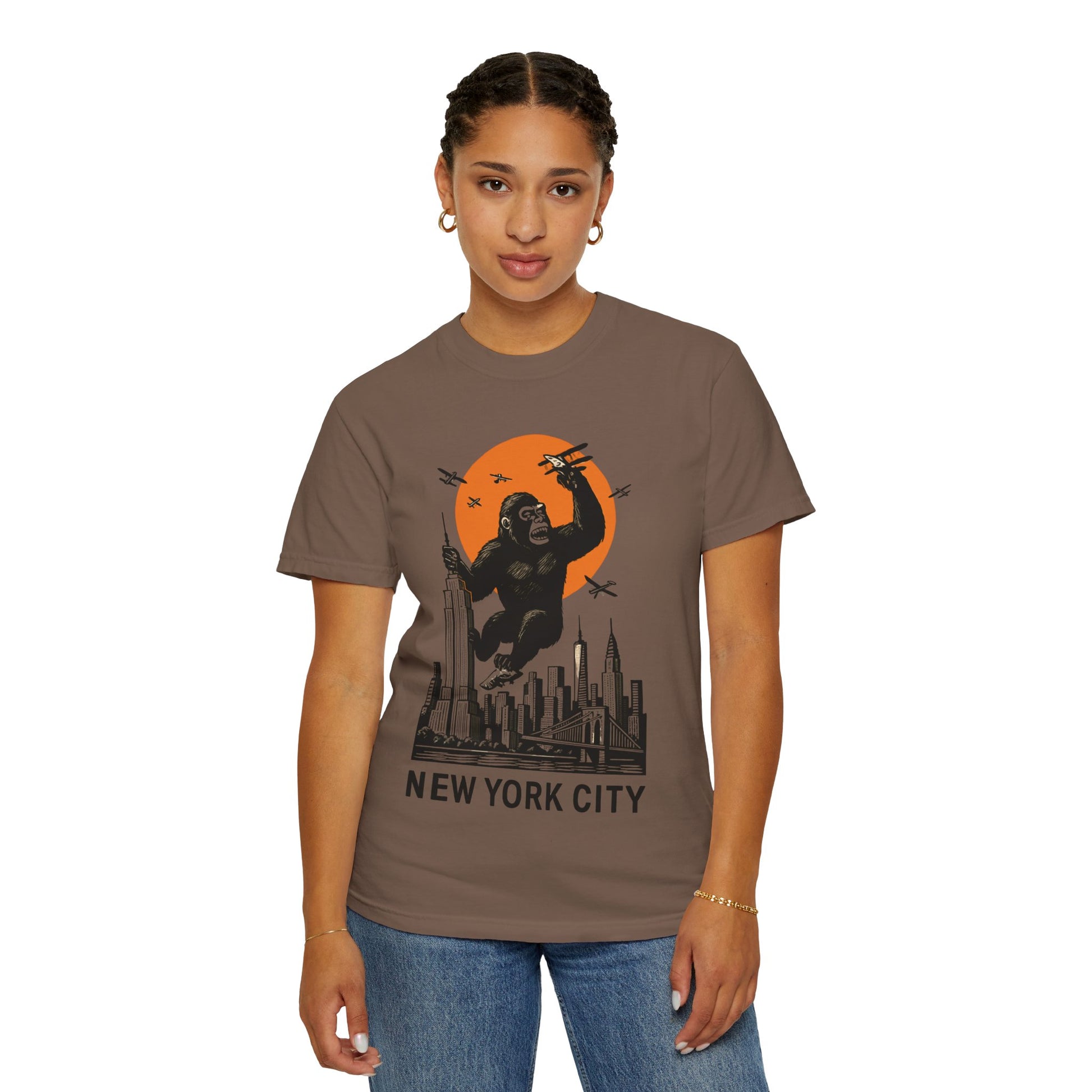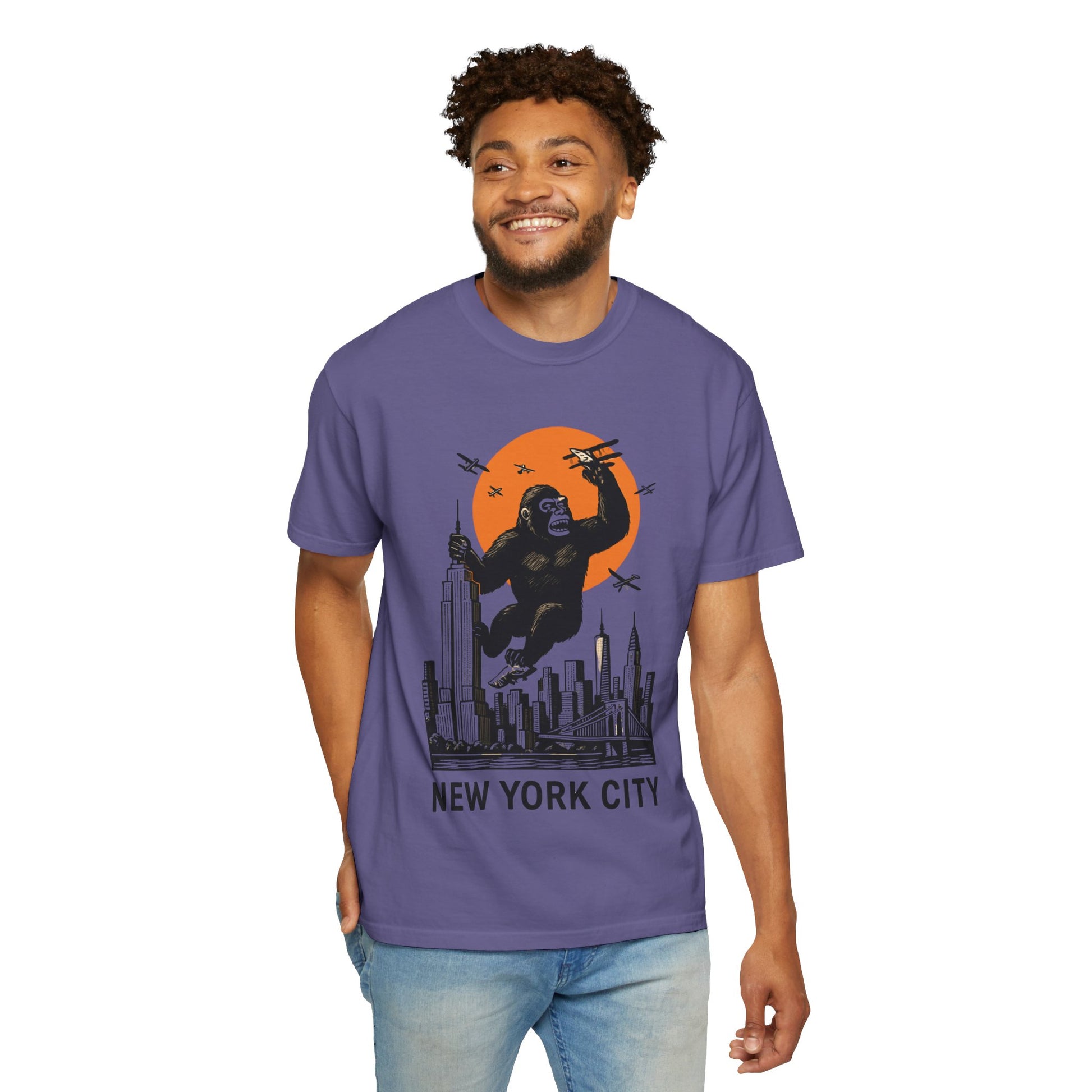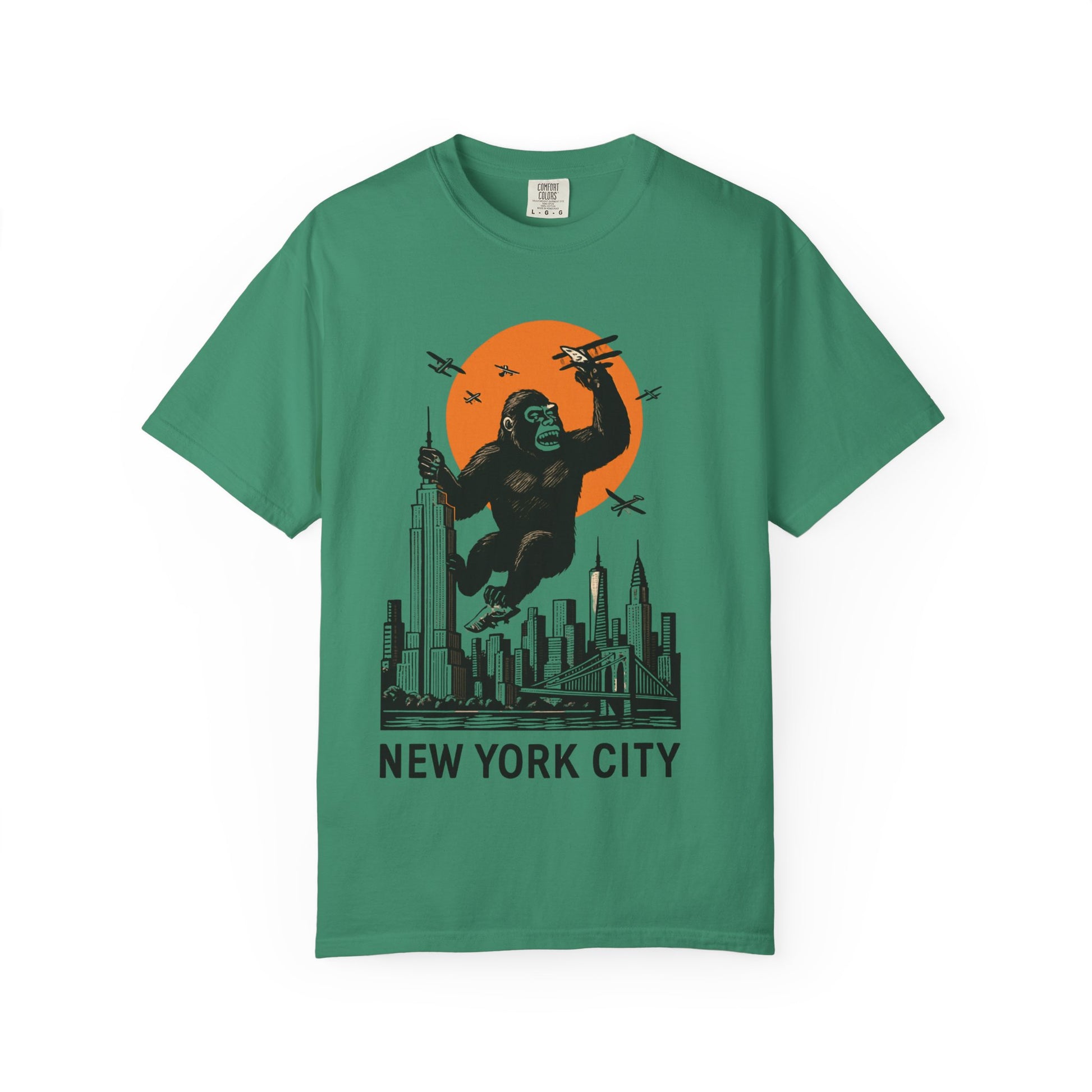 This New York themed T-shirt features the famous NY skyline and the iconic King Kong climbing the Empire State Building. It gives off a cool and urban vibe, perfect for those who love the city life. This T-shirt is ideal for New York enthusiasts, movie buffs, and tourists looking for a unique souvenir. It's perfect for casual wear, city outings, and urban-themed events.