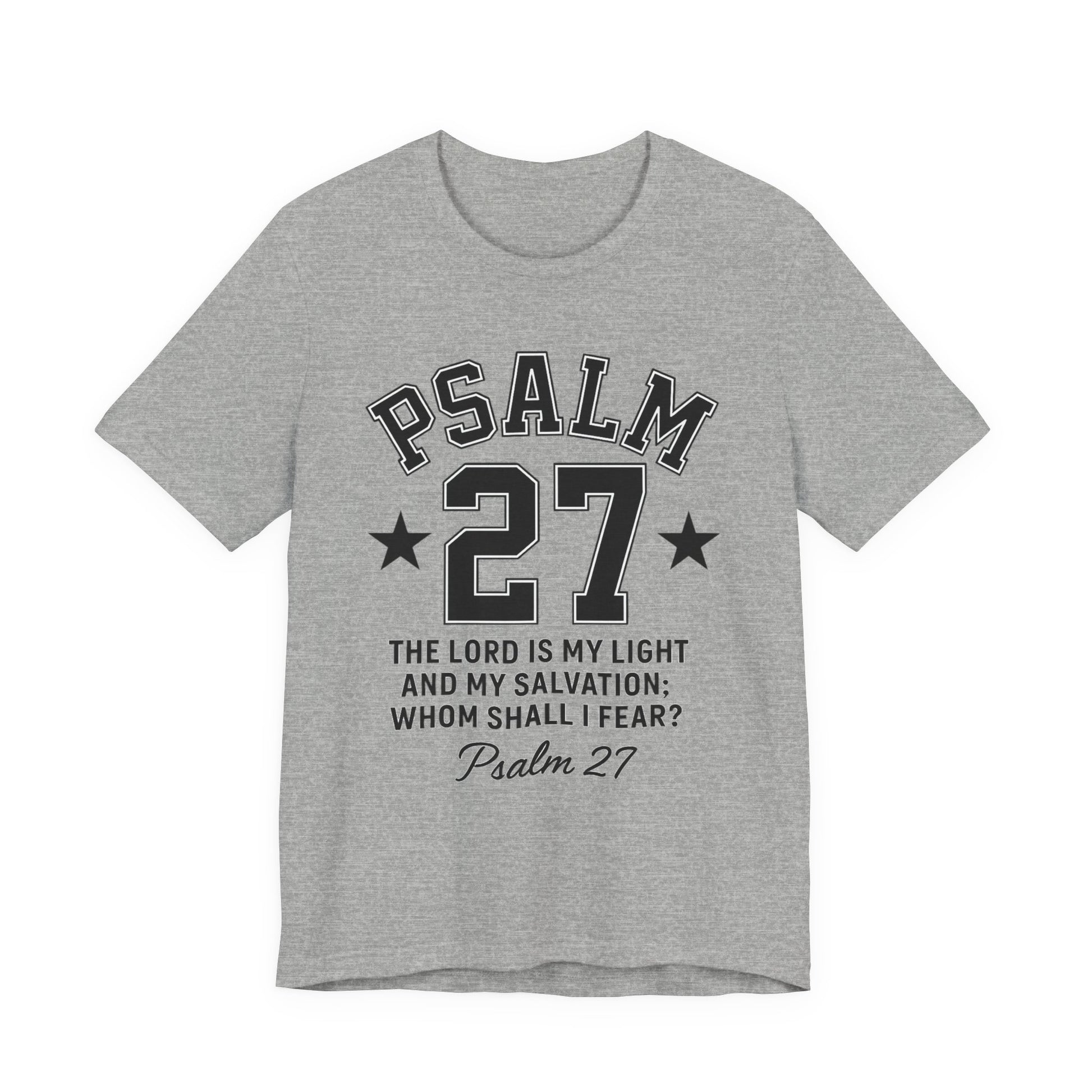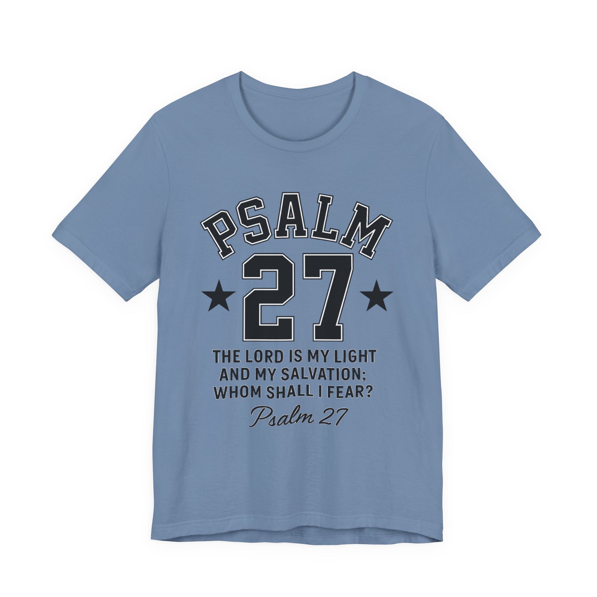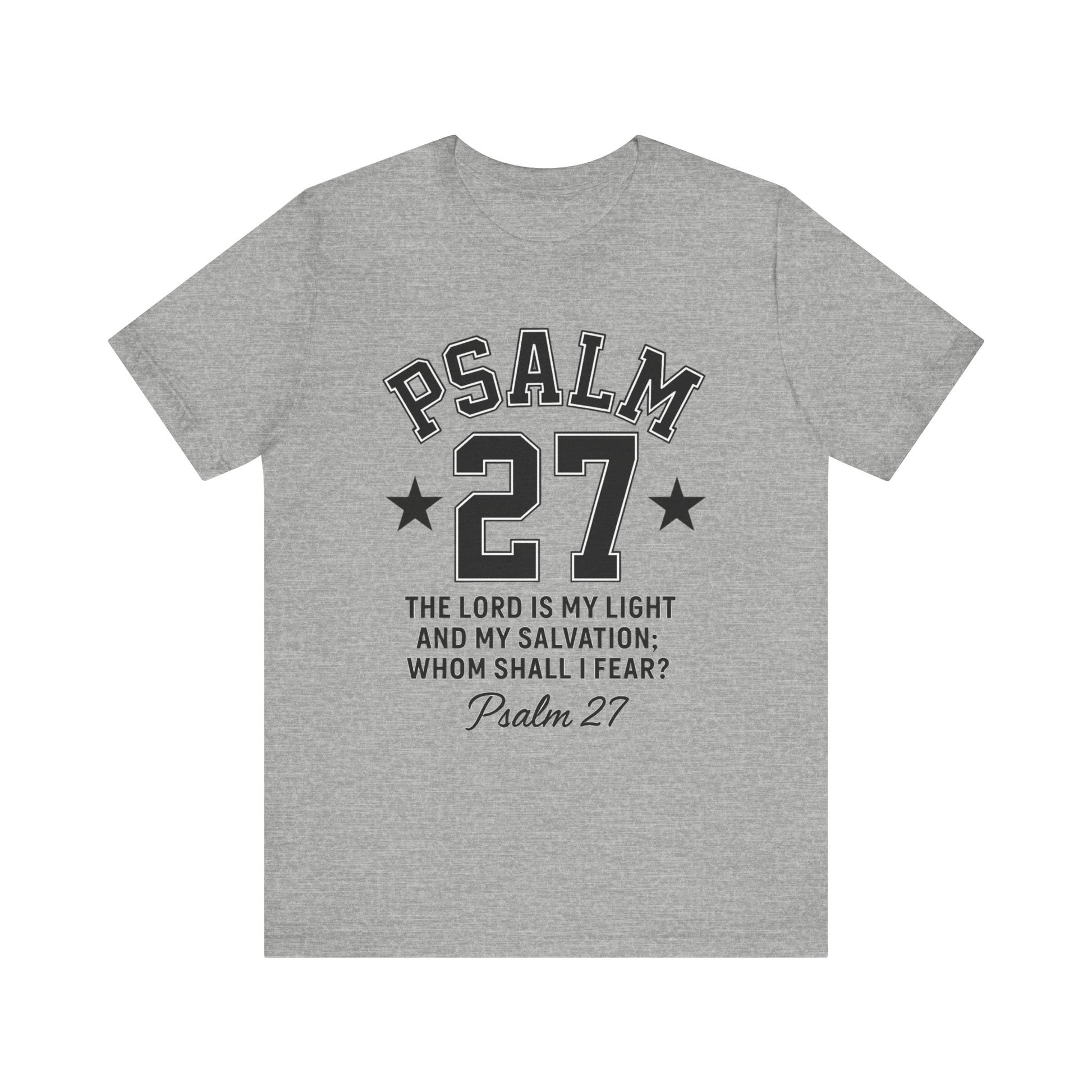 Sporty, jersey style T-shirt featuring Psalm 27. Made with 100% Airlume combed and ring-spun cotton, this lightweight shirt is perfect for active and leisure wear. The retail fit and crew neckline make it suitable for casual and semi-formal settings. Relevant for religious individuals celebrating spiritual occasions.