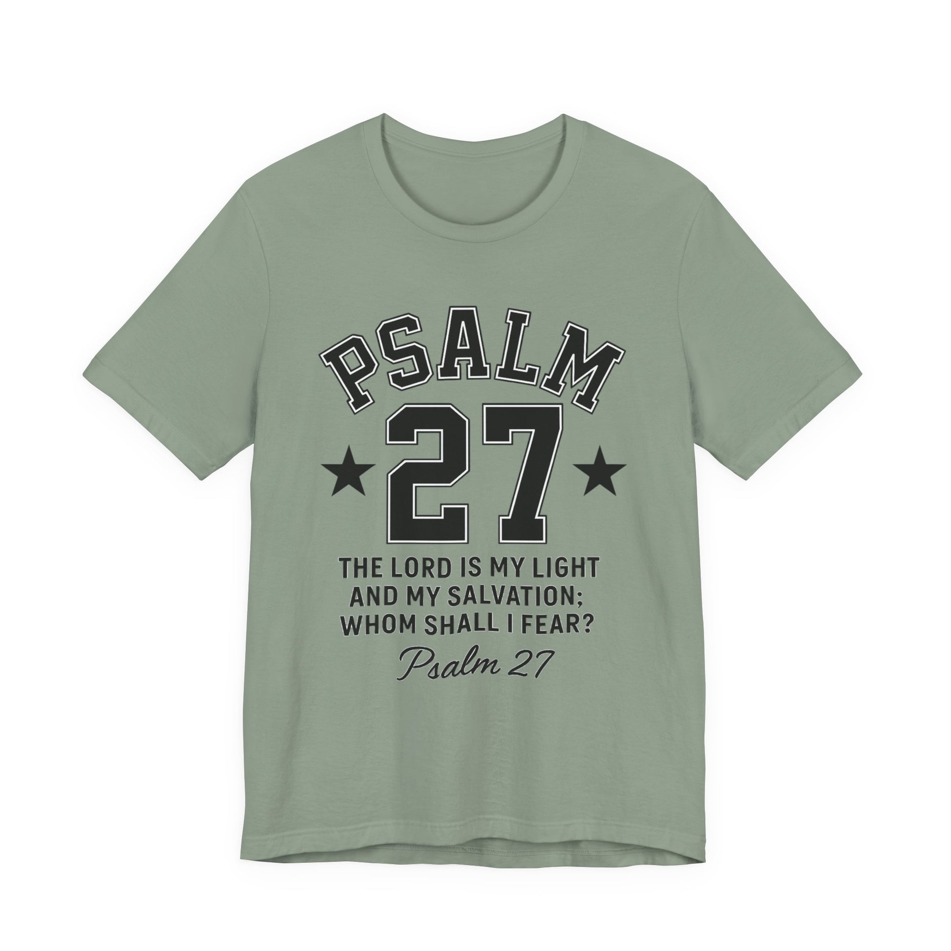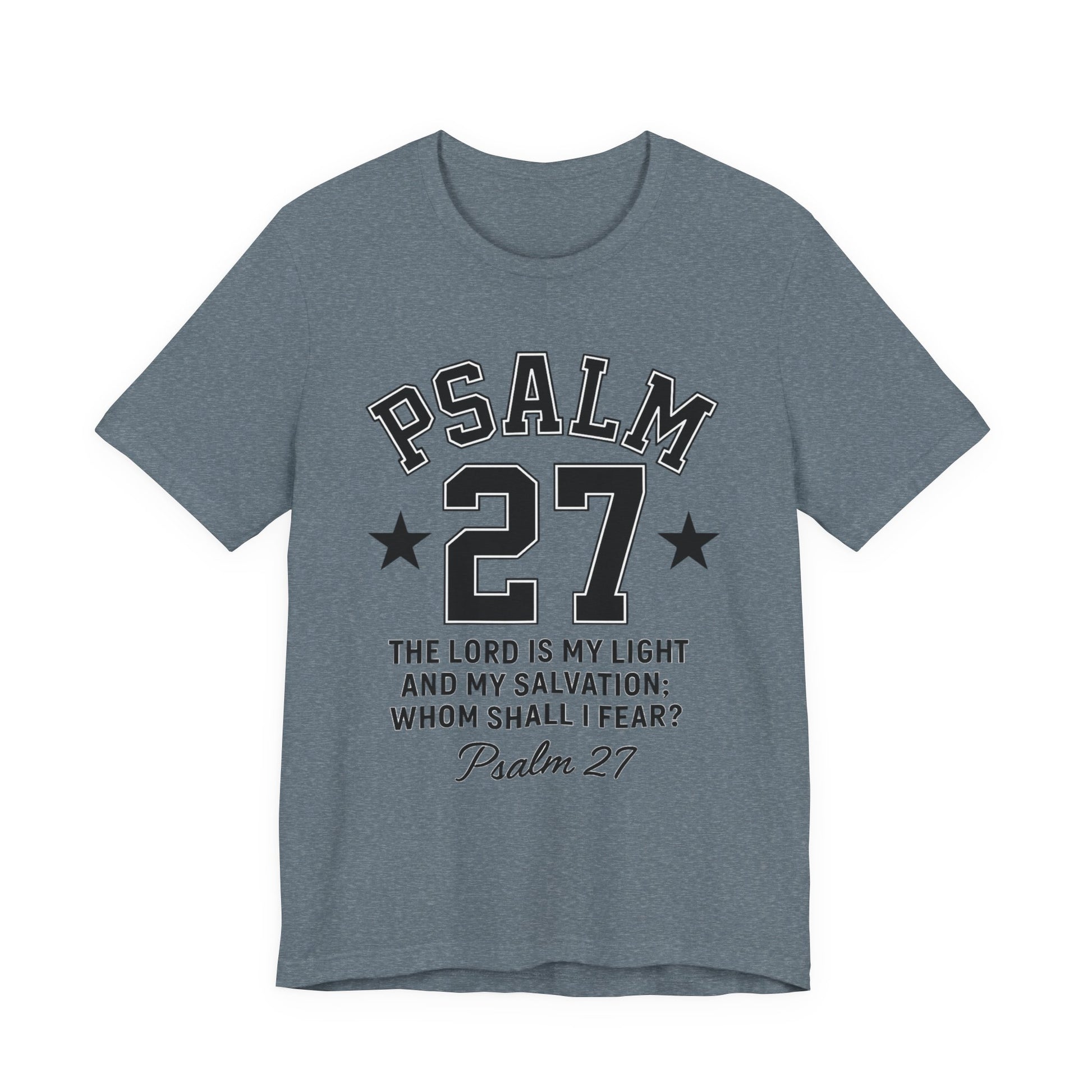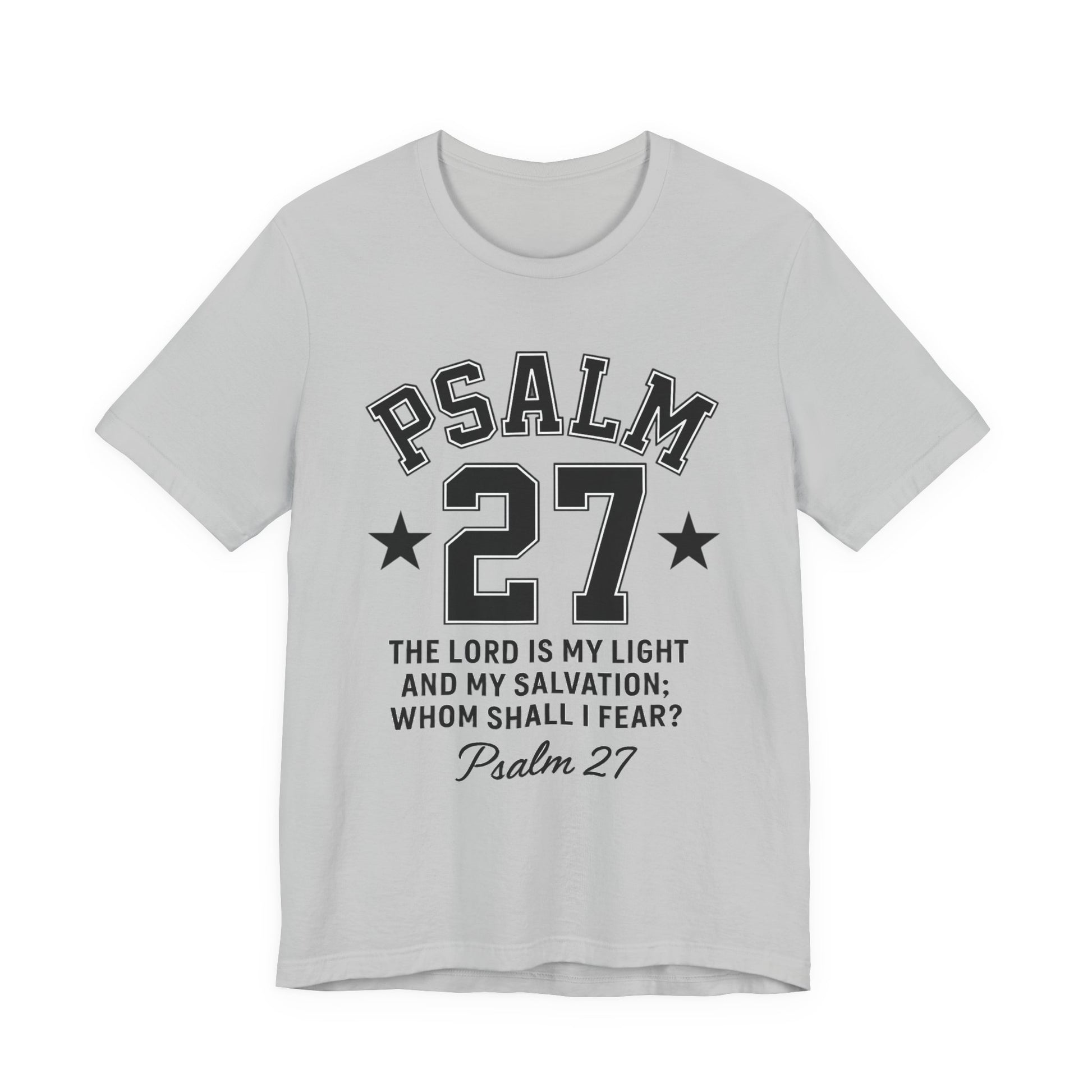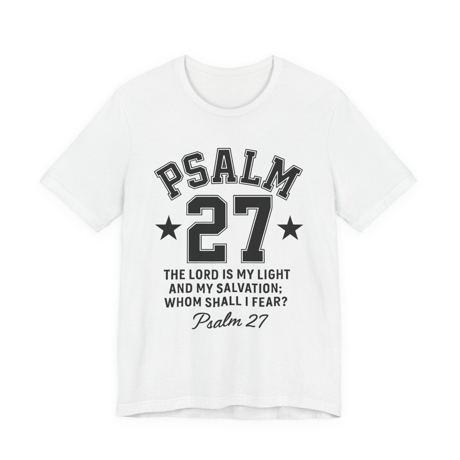 Sporty, jersey style T-shirt featuring Psalm 27. Made with 100% Airlume combed and ring-spun cotton, this lightweight shirt is perfect for active and leisure wear. The retail fit and crew neckline make it suitable for casual and semi-formal settings. Relevant for religious individuals celebrating spiritual occasions.