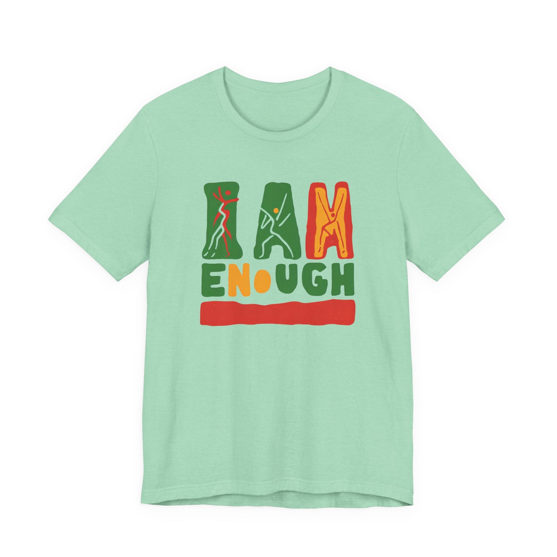 Proclaim that you are everything positive with this abstract T-Shirt in vibrant African colors that says 'I AM ENOUGH'. Rock this tee to spread a message of self-love and empowerment. Perfect for anyone looking to showcase their confidence and positivity. Ideal for everyday wear, casual occasions, and as a statement piece during empowerment events and self-care celebrations.