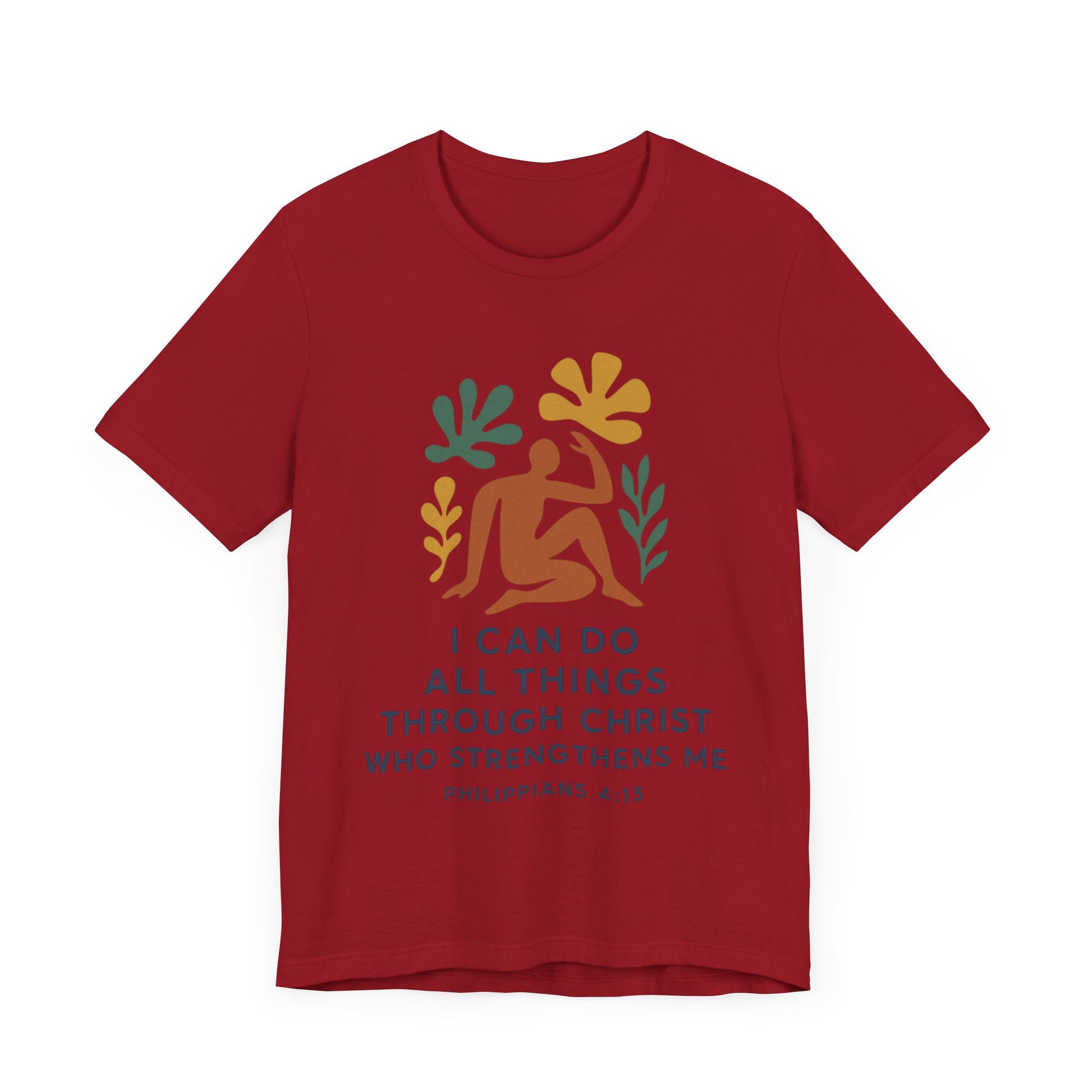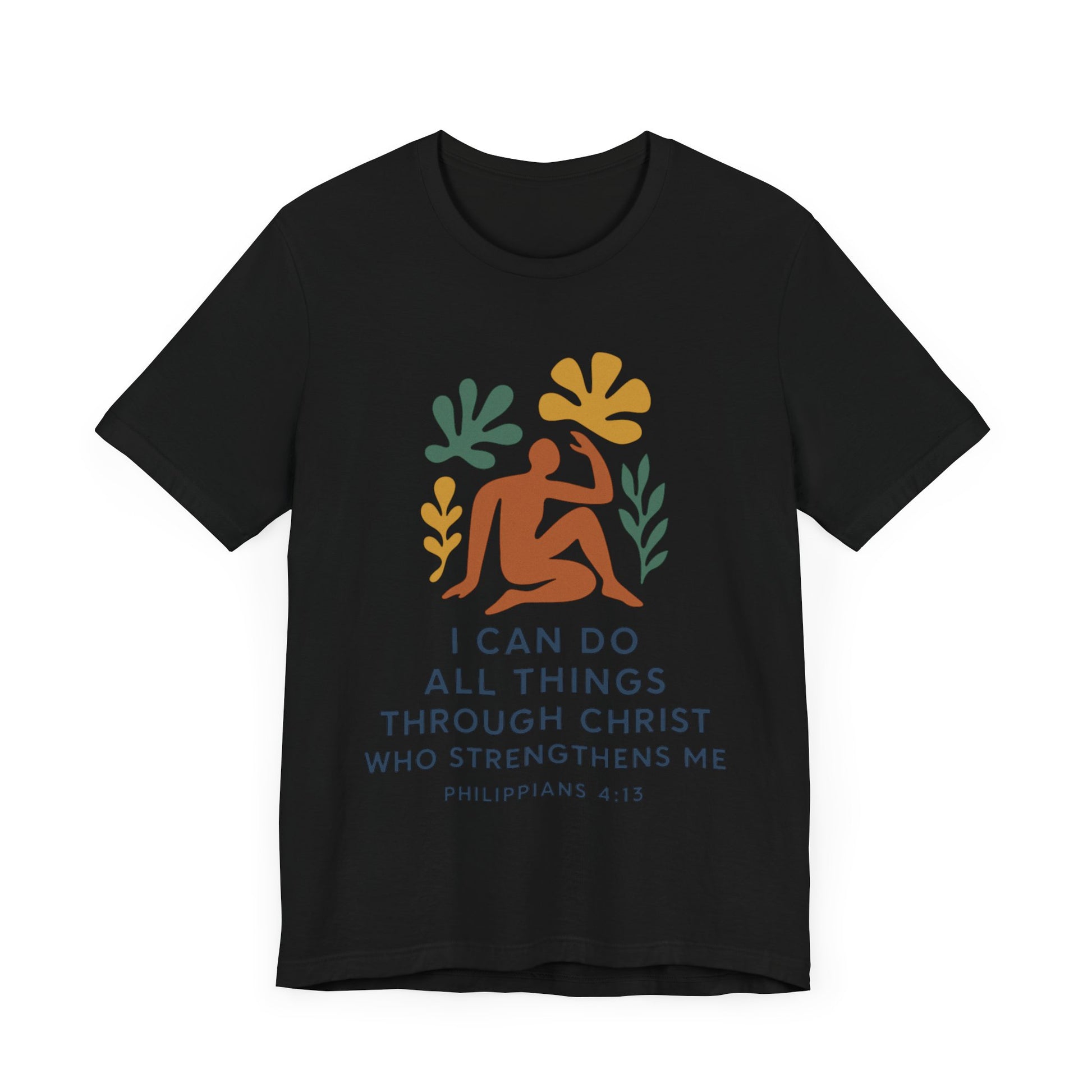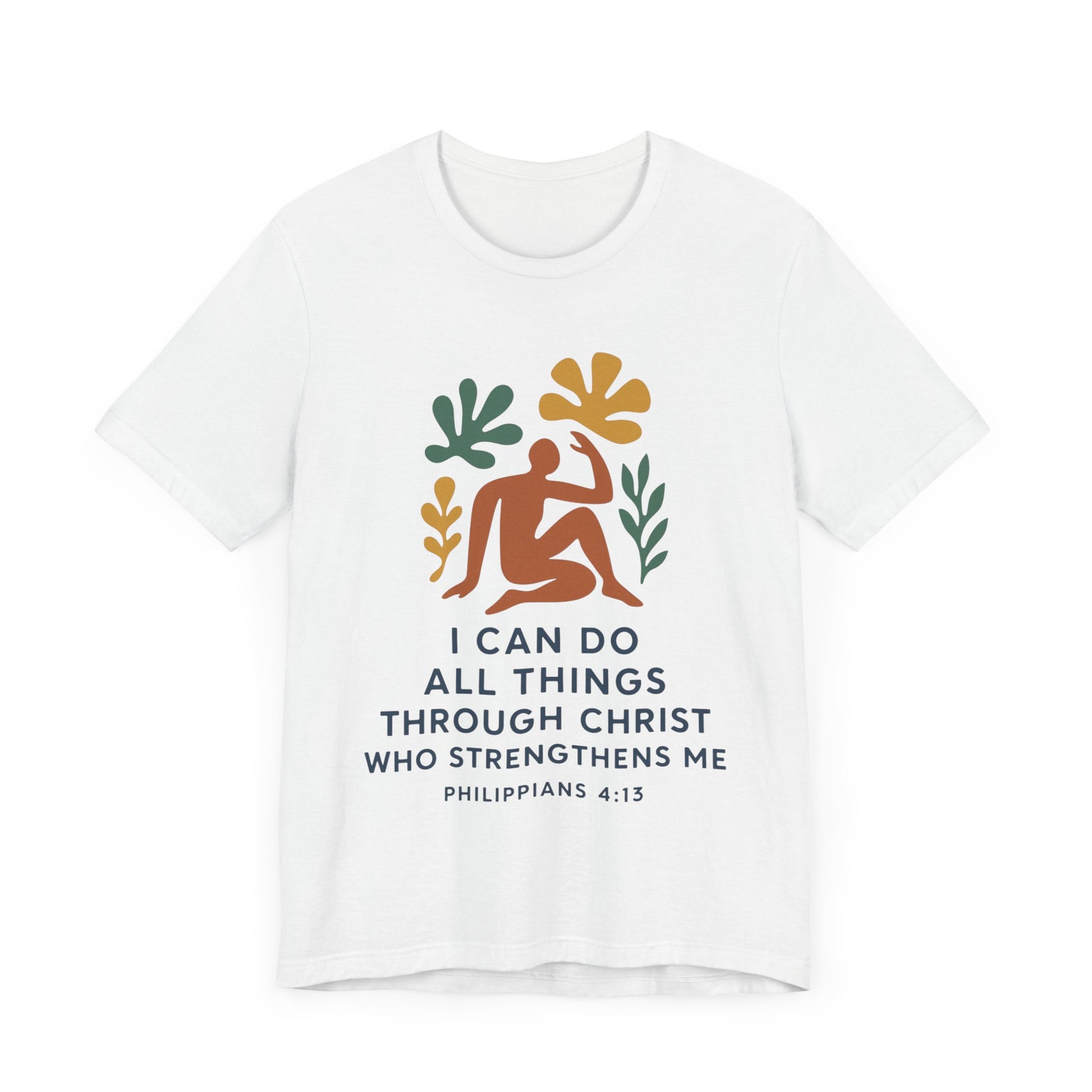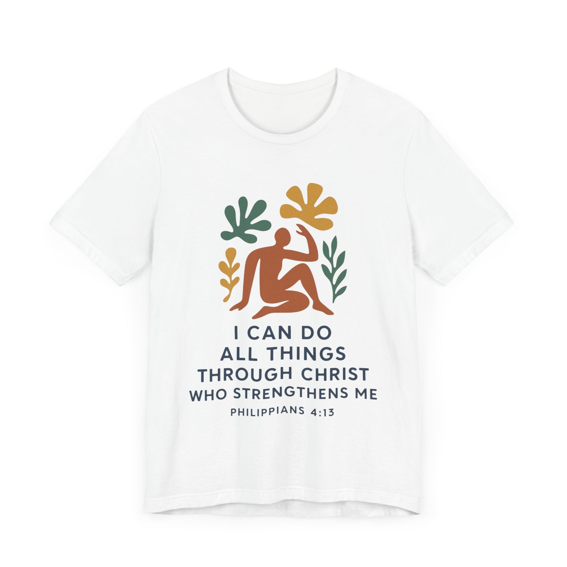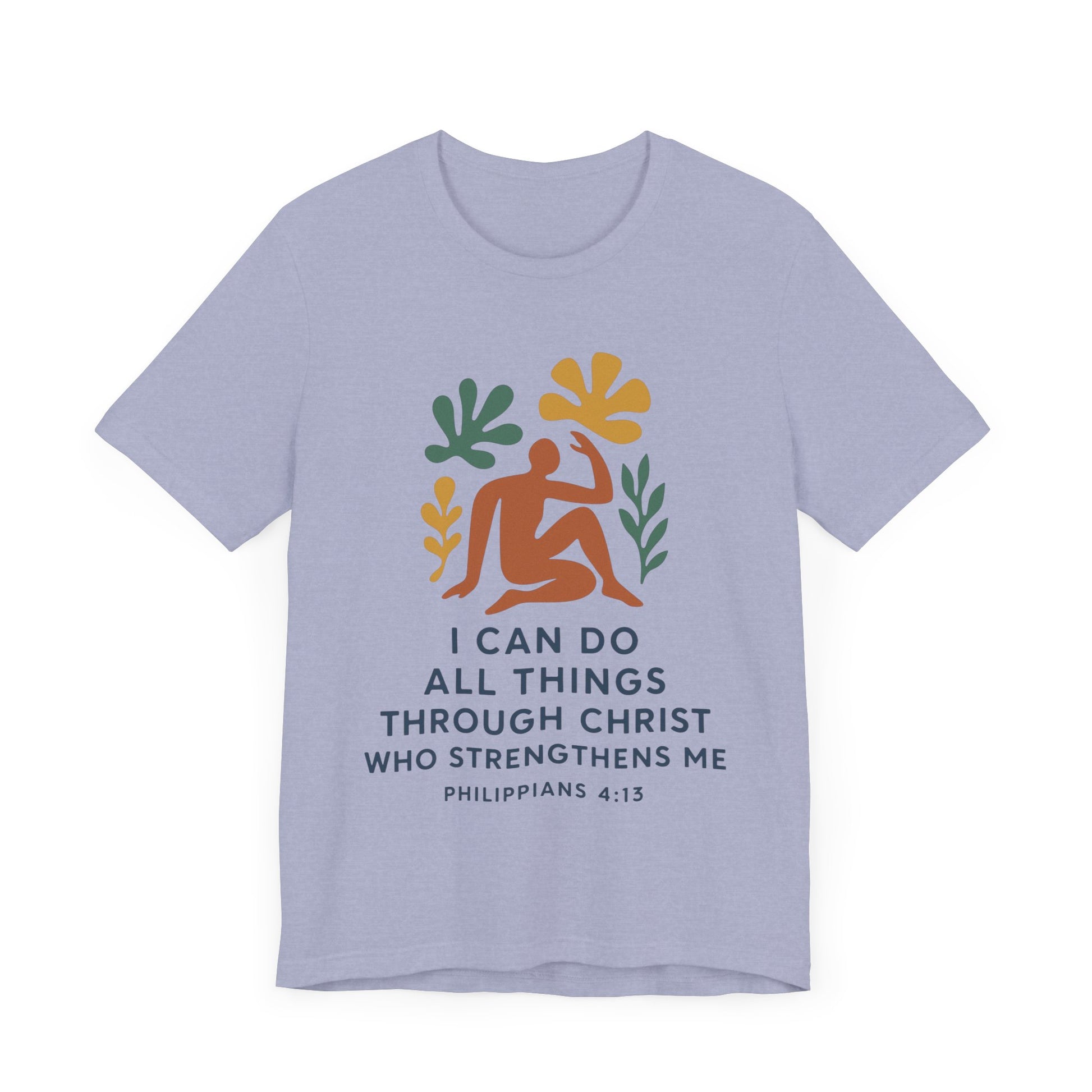 This Matisse style Tee showcases the wisdom of Philippians 4:13, giving off a tranquil and inspirational vibe. It is perfect for casual wear, layering, or as a statement piece for a semi-formal setting. Relevant to Christians, those seeking motivational apparel, or anyone looking for a stylish Tee with a meaningful message. Ideal for occasions like Easter, Christmas, birthdays, and everyday wear.