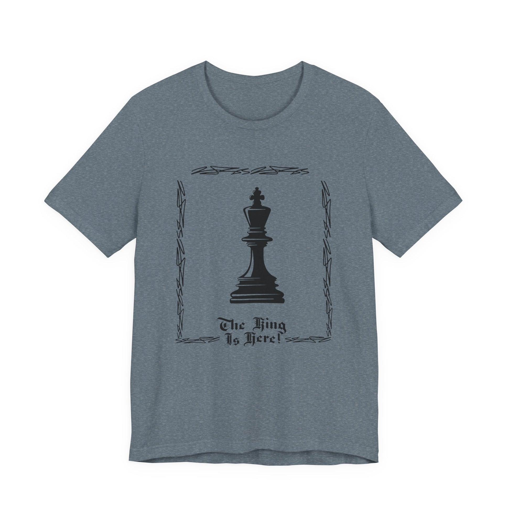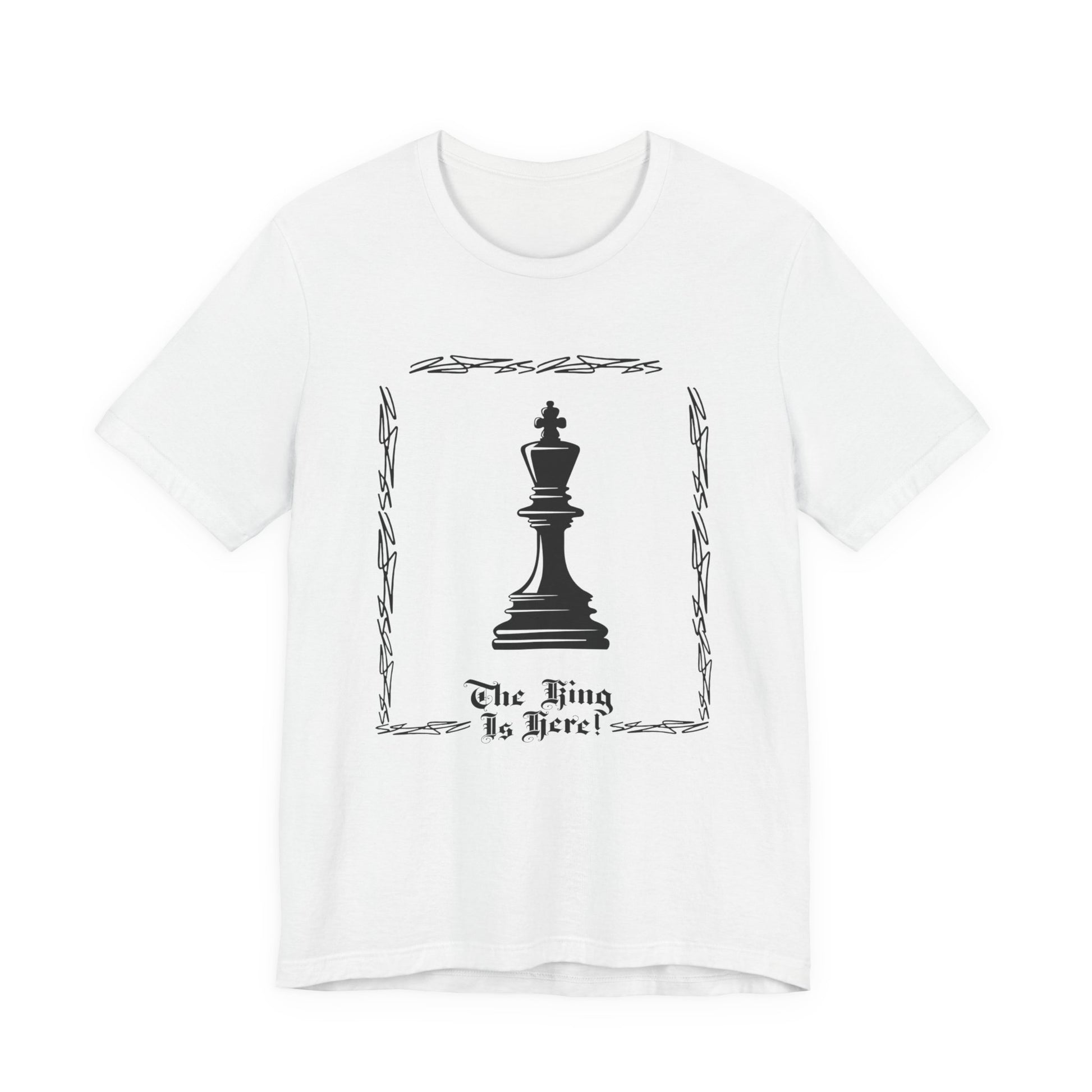 A monochrome Tee proclaiming 'THE KING IS HERE' with the black Chess King design. This classic and versatile T-Shirt is perfect for chess enthusiasts and those who appreciate a minimalist aesthetic. Ideal for casual wear and can be a unique gift for chess lovers, suitable for birthdays, Father's Day, and game nights.