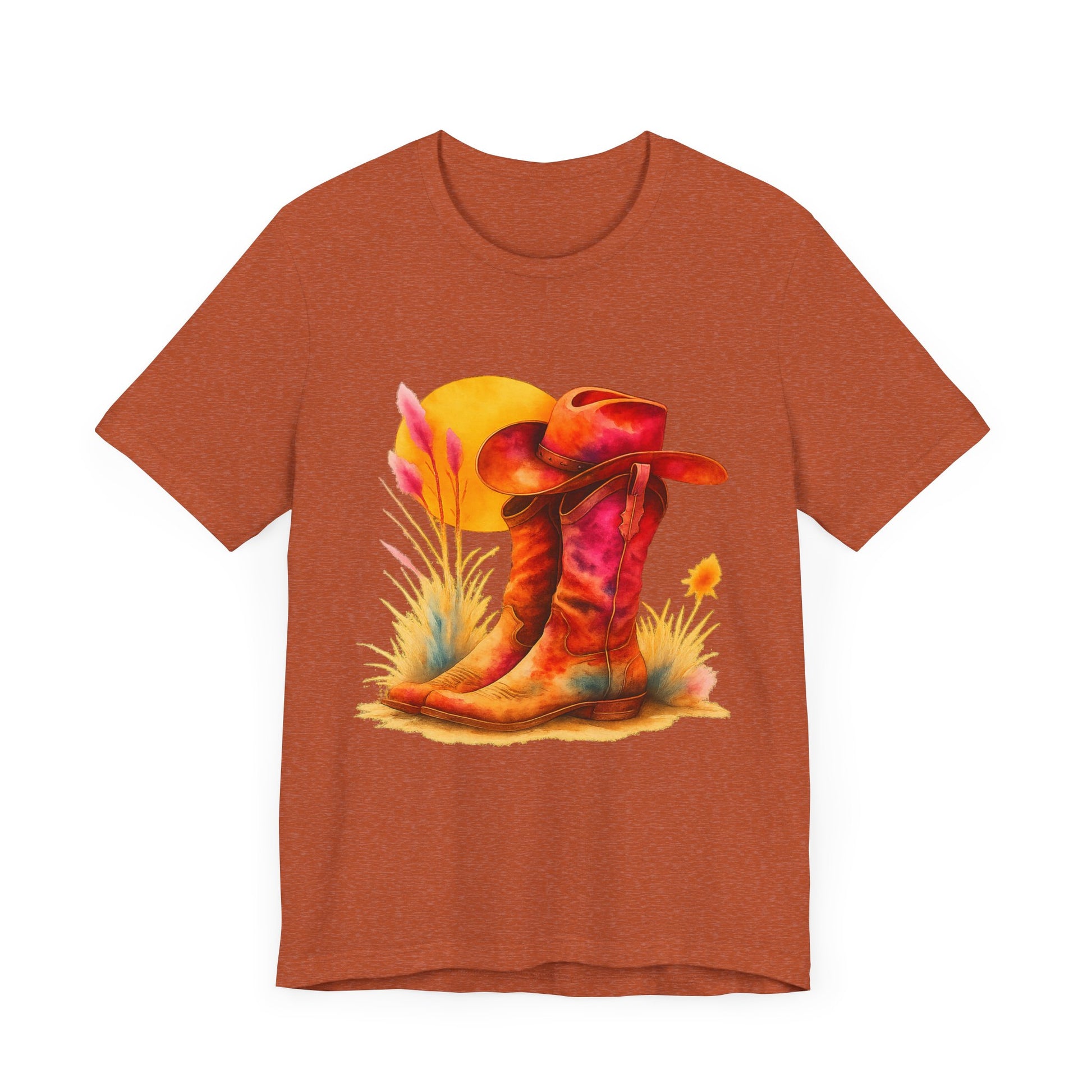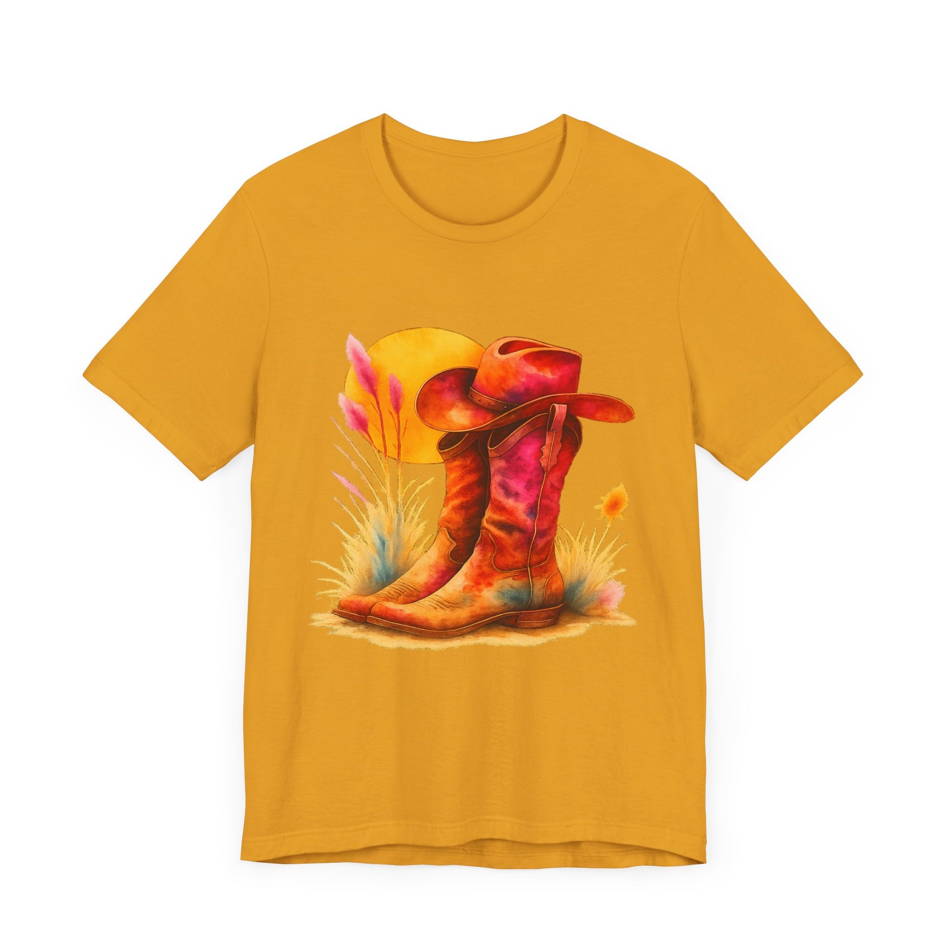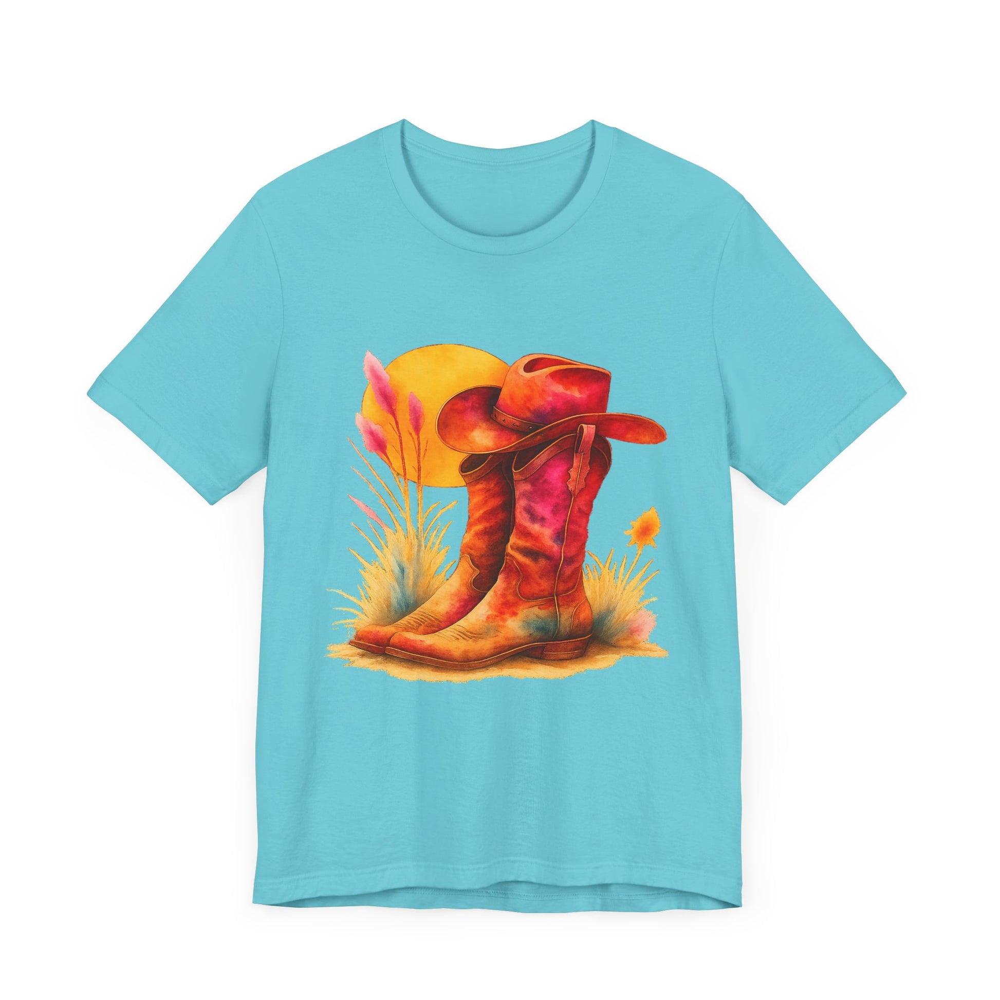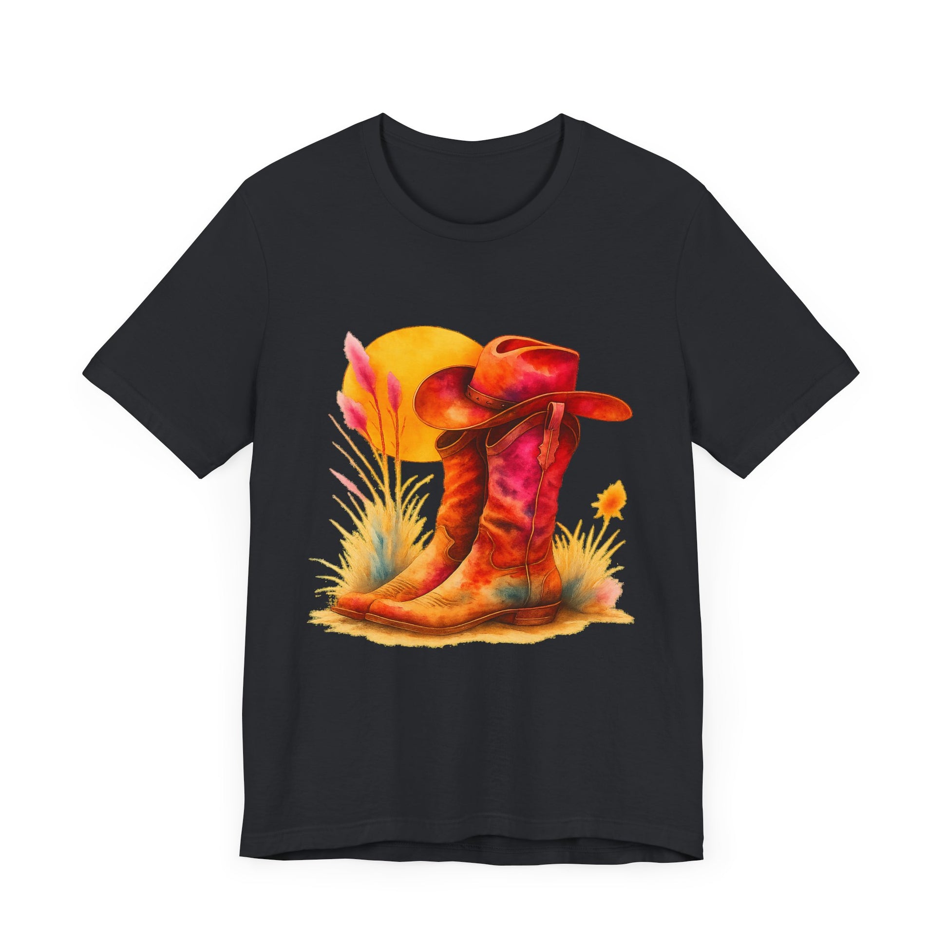 A must-have for all Western Enthusiasts, this T-Shirt features a soft and beautiful picture of a pair of boots and a matching hat with an overhanging sun. Perfect for casual and semi-formal settings, it adds a classic and neat style that's perfect for accessorizing. This T-Shirt is relevant for western enthusiasts and cowboy/cowgirl enthusiasts. Suitable for holidays and occasions like western-themed parties, rodeos, and country music festivals.