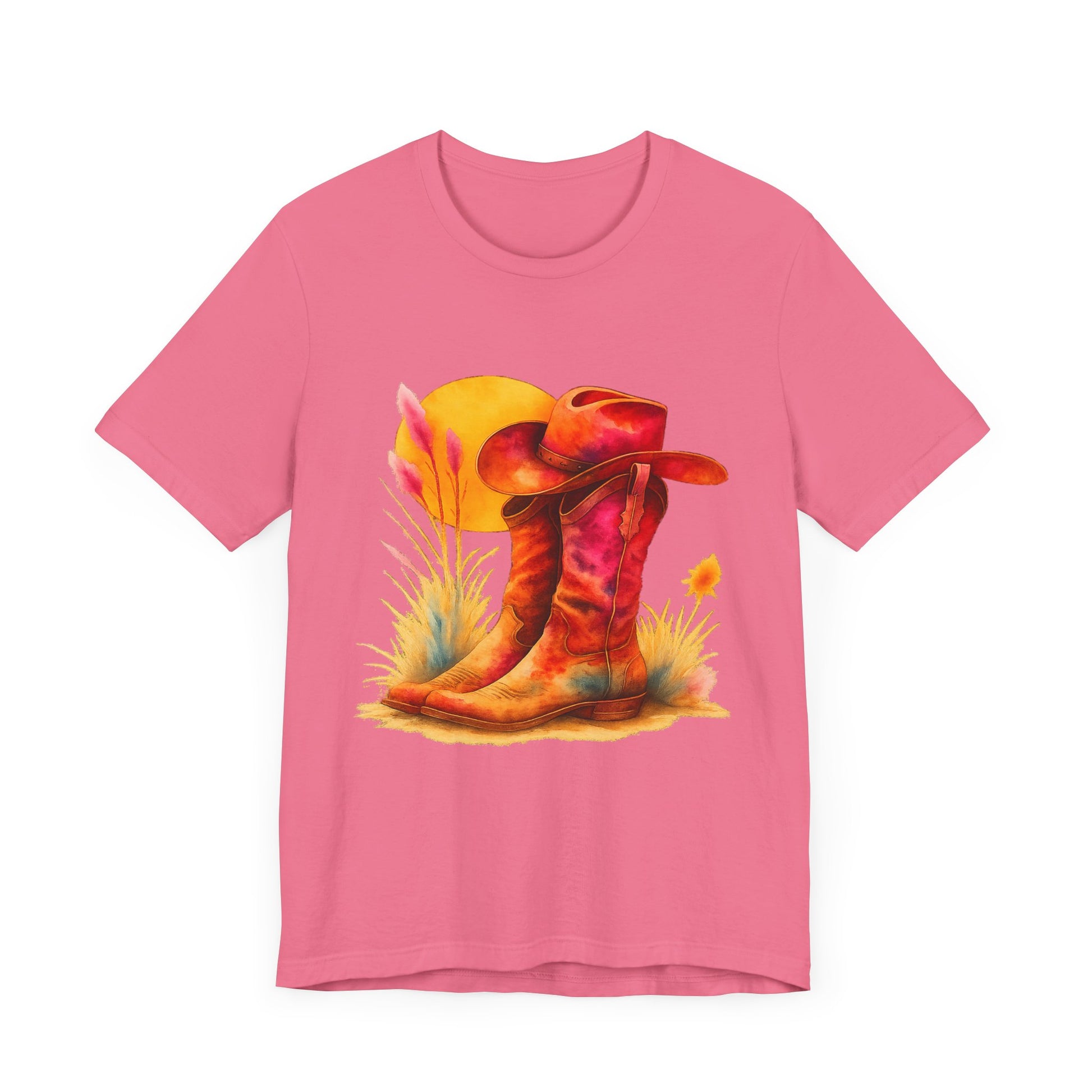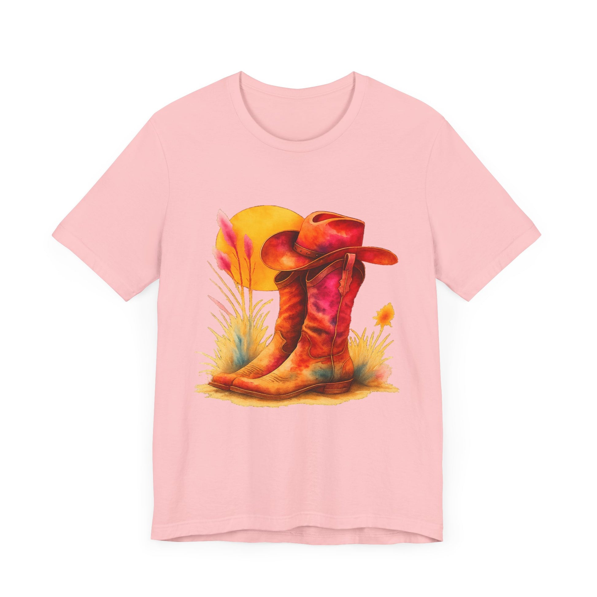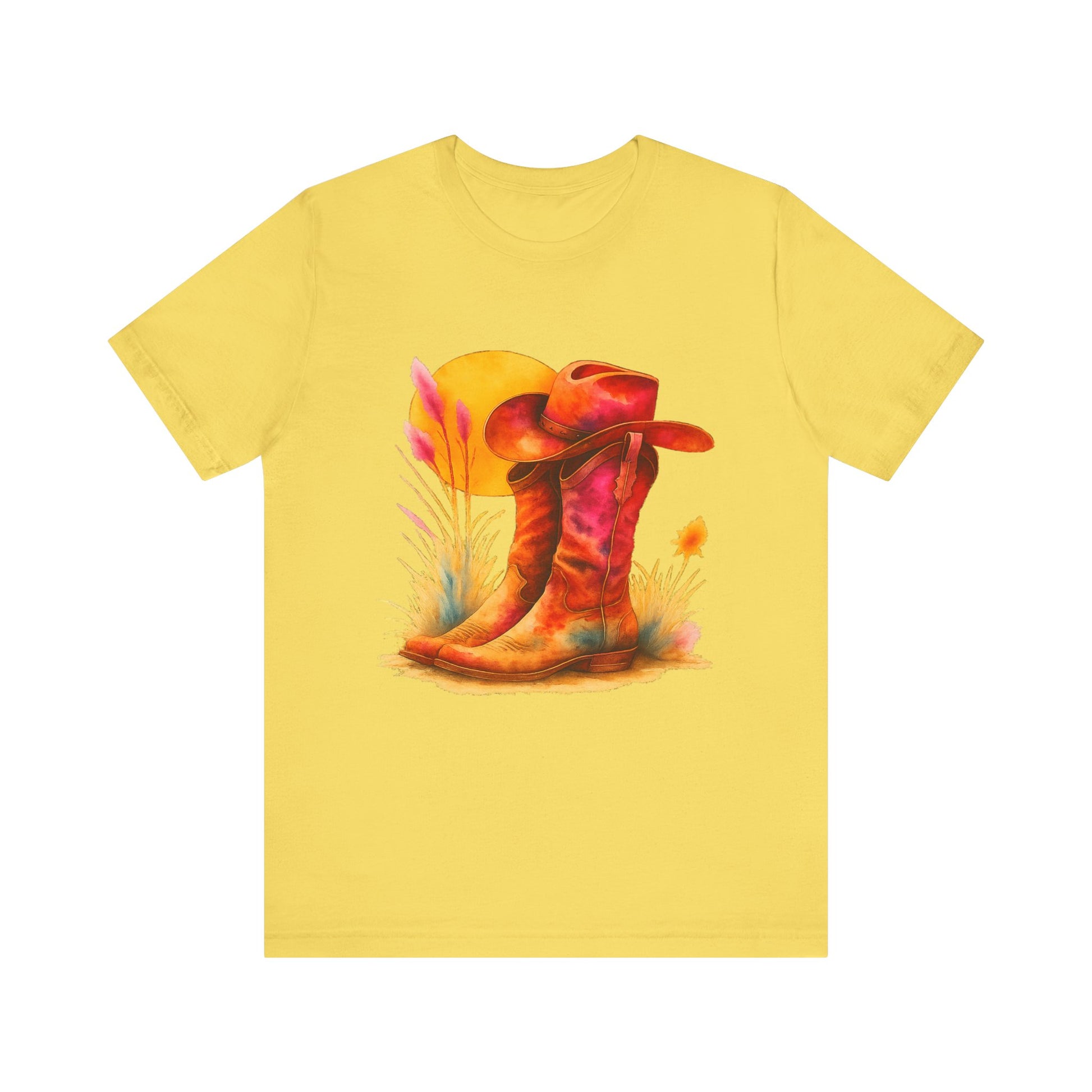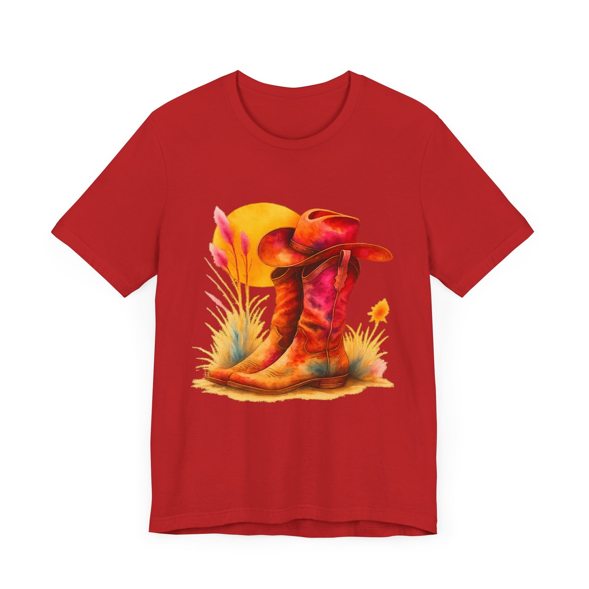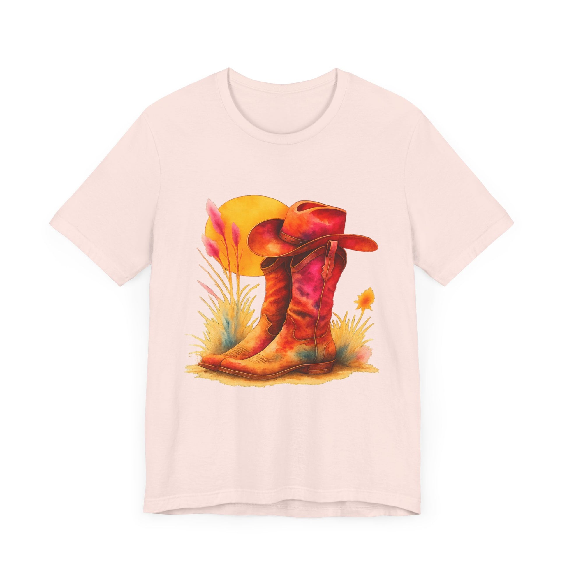 A must-have for all Western Enthusiasts, this T-Shirt features a soft and beautiful picture of a pair of boots and a matching hat with an overhanging sun. Perfect for casual and semi-formal settings, it adds a classic and neat style that's perfect for accessorizing. This T-Shirt is relevant for western enthusiasts and cowboy/cowgirl enthusiasts. Suitable for holidays and occasions like western-themed parties, rodeos, and country music festivals.